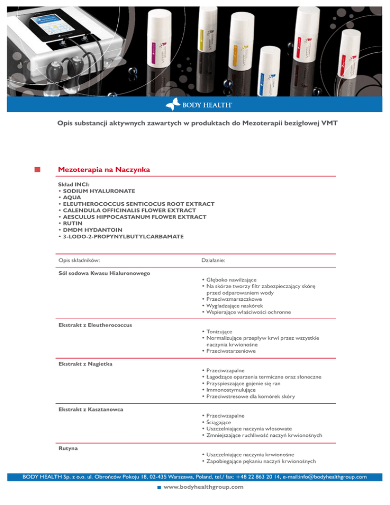 Opis substancji aktywnych zawartych w produktach do Mezoterapii bezigłowej VMT Mezoterapia na Naczynka Skład INCI: • SODIUM HYALURONATE • AQUA • ELEUTHEROCOCCUS SENTICOCUS ROOT EXTRACT • CALENDULA OFFICINALIS FLOWER EXTRACT • AESCULUS HIPPOCASTANUM FLOWER EXTRACT • RUTIN • DMDM HYDANTOIN • 3-LODO-2-PROPYNYLBUTYLCARBAMATE Opis składników: Sól sodowa Kwasu Hialuronowego Ekstrakt z Eleutherococcus Ekstrakt z Nagietka Ekstrakt z Kasztanowca Rutyna Działanie: • Głęboko nawilżające • Na skórze tworzy filtr zabezpieczający skórę przed odparowaniem wody • Przeciwzmarszczkowe • Wygładzające naskórek • Wspierające właściwości ochronne • Tonizujące • Normalizujące przepływ krwi przez wszystkie naczynia krwionośne • Przeciwstarzeniowe • Przeciwzapalne • Łagodzące oparzenia termiczne oraz słoneczne • Przyspieszające gojenie się ran • Immonostymulujące • Przeciwstresowe dla komórek skóry • Przeciwzapalne • Ściągające • Uszczelniające naczynia włosowate • Zmniejszające ruchliwość naczyń krwionośnych • Uszczelniające naczynia krwionośne • Zapobiegające pękaniu naczyń krwionośnych BODY HEALTH Sp. z o.o. ul. Obrońców Pokoju 18, 02-435 Warszawa, Poland, tel./ fax: +48 22 863 20 14, e-mail:[email protected] Opis substancji aktywnych zawartych w produktach do Mezoterapii bezigłowej VMT Mezoterapia Przeciw Zmarszczkom Skład INCI: • SODIUM HYALURONATE • HYALURONIC ACID • AQUA • PALMITOYL TRIPEPTIDE-5 • GLYCERIN • DIPEPTIDE DIAMINOBUTYROYL BENZYLAMIDE DIACETATE • DMDM HYDANTOIN • 3-LODO-2-PROPYNYLBUTYLCARBAMATE Opis składników: Sól sodowa Kwasu Hialuronowego Kwas Hialurowony Palmitoyl Tripeptide-5 Gliceryna Działanie: • Głęboko nawilżające • Na skórze tworzy filtr zabezpieczający skórę przed odparowaniem wody • Przeciwzmarszczkowe • Wygładzające naskórek • Wspierające właściwości ochronne • Stymulujące synteze kolagenu • Ujędrniające skórę • Silne działanie przeciwzmarszczkowe • Uelastyczniające • Na skórze tworzy filtr zabezpieczający skórę przed odparowaniem wody • Wygładzające • Zmiękczające Dipeptide Diaminobutyroyl Benzylamide Diacetate • Przeciwzmarszczkowe BODY HEALTH Sp. z o.o. ul. Obrońców Pokoju 18, 02-435 Warszawa, Poland, tel./ fax: +48 22 863 20 14, e-mail:[email protected] Opis substancji aktywnych zawartych w produktach do Mezoterapii bezigłowej VMT Mezoterapia Wybielająca Skład INCI: • SODIUM HYALURONATE • AQUA • ARCTOSTAPHYLOS UVA URSI LEAF EXTRACT • MAGNESIUM ASCORBYL PHOSPHATE • DMDM HYDANTOIN • 3-LODO-2-PROPYNYLBUTYLCARBAMATE Opis składników: Sól sodowa Kwasu Hialuronowego Ekstrakt z mącznicy lekarskiej Aktywna forma witaminy C Działanie: • Głęboko nawilżające • Na skórze tworzy filtr zabezpieczający skórę przed odparowaniem wody • Przeciwzmarszczkowe • Wygładzające naskórek • Wspierające właściwości ochronne • Silne wybielające poprzez blokowanie wydzielania melaniny • Bardzo duża zawartość witaminy C BODY HEALTH Sp. z o.o. ul. Obrońców Pokoju 18, 02-435 Warszawa, Poland, tel./ fax: +48 22 863 20 14, e-mail:[email protected] Opis substancji aktywnych zawartych w produktach do Mezoterapii bezigłowej VMT Mezoterapia Ujędrniająca Skład INCI: • SODIUM HYALURONATE • HYALURONIC ACID • AQUA • GINKGO BILOBA LEAF EXTRACT • AESCULUS HIPPOCASTANUM FLOWER EXTRACT • MELILOTUS OFFICINALIS HERB EXTRACT • COFFEA ARABICA SEED EXTRACT • ERODIUM CICUTARIUM EXTRACT/ RUSCUS ACULEATUS ROOT EXTRACT • HYDROLYZED SILK • DIAZOLIDINYL UREA • METHYLPARABEN • PROPYLPARABEN Opis składników: Sól sodowa Kwasu Hialuronowego Ginkgo Biloba Ekstrakt z Kasztanowca Ekstrakt z Nostrzyka Ekstrakt z Coffea Arabica (Kofeina) Ekstrakt z Erodium cicutarium Białka jedwabiu Działanie: • Głęboko nawilżające • Na skórze tworzy filtr zabezpieczający skórę przed odparowaniem wody • Przeciwzmarszczkowe • Wygładzające naskórek • Wspierające właściwości ochronne • Odżywcze na skóre • Przeciwzapalne • Ściągające • Uszczelniające naczynia włosowate • Zmniejszające ruchliwość naczyń krwionośnych • Odprowadza wodę z organizmu • Ściągające • Przyspieszające uzyskiwanie energii z tłuszczów • Ujędrniające • Naturalny środek moczopędny • Pobudza spalanie tkanki tłuszczowej • Przyspieszające odchudzanie, poprzez wzmocnienie transportu w krwi • Likwiduje zmiany powierzchniowe wywołane cellulitem • Silnie ujędrniające • Uelastyczniające • Odbudowa kolagenu BODY HEALTH Sp. z o.o. ul. Obrońców Pokoju 18, 02-435 Warszawa, Poland, tel./ fax: +48 22 863 20 14, e-mail:[email protected] Opis substancji aktywnych zawartych w produktach do Mezoterapii bezigłowej VMT Mezoterapia Antycellulit Skład INCI: • SODIUM HYALURONATE • AQUA • CARNITINE • COFFEA ARABICA SEED EXTRACT • ERODIUM CICUTARIUM EXTRACT/ RUSCUS ACULEATUS ROOT EXTRACT • GINKGO BILOBA LEAF EXTRACT • AESCULUS HIPPOCASTANUM FLOWER EXTRACT • MELILOTUS OFFICINALIS HERB EXTRACT • EQUISETUM ARVENSE HERB EXTRACT • HYDROLYZED SILK • DIMETHYL SULFONE • DIAZOLIDINYL UREA • METHYLPARABEN • PROPYLPARABEN Opis składników: Sól sodowa Kwasu Hialuronowego Kwas Hialurowony Karnityna Ekstrakt z Coffea Arabia (Kofeina) Działanie: • Głęboko nawilżające • Na skórze tworzy filtr zabezpieczający skórę przed odparowaniem wody • Przeciwzmarszczkowe • Wygładzające naskórek • Wspierające właściwości ochronne • Transport tłuszczów w procesie odchudzania • Działa, jako katalizator procesu • Transport tłuszczów do mitochondriów gdzie jest spalany • Przyspieszające uzyskiwanie energii z tłuszczów • Ujędrniające • Naturalny środek moczopędny • Pobudza spalanie tkanki tłuszczowej • Przyspieszające odchudzanie, poprzez wzmocnienie transportu w krwi • Likwiduje zmiany powierzchniowe wywołan