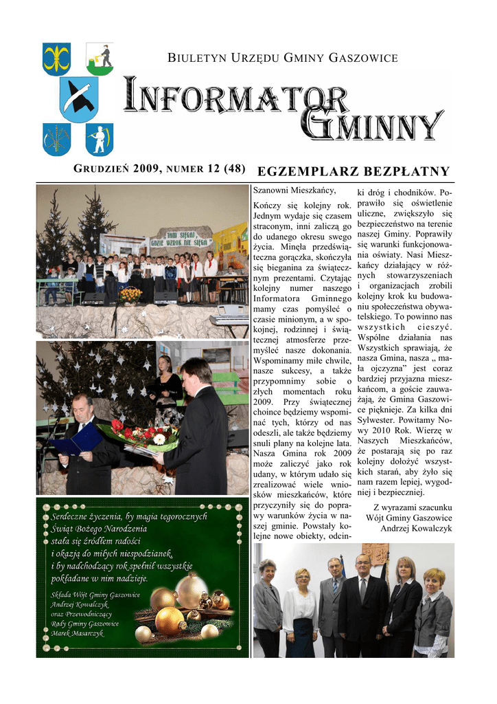 B IULETYN U RZĘDU G MINY G ASZOWICE G RUDZIEŃ 2009, NUMER 12 (48) EGZEMPLARZ BEZPŁATNY Szanowni Mieszkańcy, Kończy się kolejny rok. Jednym wydaje się czasem straconym, inni zaliczą go do udanego okresu swego życia. Minęła przedświąteczna gorączka, skończyła się bieganina za świątecznym prezentami. Czytając kolejny numer naszego Informatora Gminnego mamy czas pomyśleć o czasie minionym, a w spokojnej, rodzinnej i świątecznej atmosferze przemyśleć nasze dokonania. Wspominamy miłe chwile, nasze sukcesy, a także przypomnimy sobie o złych momentach roku 2009. Przy świątecznej choince będziemy wspominać tych, którzy od nas odeszli, ale także będziemy snuli plany na kolejne lata. Nasza Gmina rok 2009 może zaliczyć jako rok udany, w którym udało się zrealizować wiele wniosków mieszkańców, które przyczyniły się do poprawy warunków życia w naszej gminie. Powstały kolejne nowe obiekty, odcin- ki dróg i chodników. Poprawiło się oświetlenie uliczne, zwiększyło się bezpieczeństwo na terenie naszej Gminy. Poprawiły się warunki funkcjonowania oświaty. Nasi Mieszkańcy działający w różnych stowarzyszeniach i organizacjach zrobili kolejny krok ku budowaniu społeczeństwa obywatelskiego. To powinno nas ws z ys t kic h c ies zyć . Wspólne działania nas Wszystkich sprawiają, że nasza Gmina, nasza „ mała ojczyzna” jest coraz bardziej przyjazna mieszkańcom, a goście zauważają, że Gmina Gaszowice pięknieje. Za kilka dni Sylwester. Powitamy Nowy 2010 Rok. Wierzę w Naszych Mieszkańców, że postarają się po raz kolejny dołożyć wszystkich starań, aby żyło się nam razem lepiej, wygodniej i bezpieczniej. Z wyrazami szacunku Wójt Gminy Gaszowice Andrzej Kowalczyk S TR . 2 G RUDZIEŃ 2009, OBOWIĄZKI WŁAŚCICIELI PSÓW NUMER 12 (48) Projekt współfinansowany ze środków Europejskiego Funduszu Społecznego Obowiązki właścicieli psów wynikają z wielu przepisów prawa m.in. z kodeksu wykroczeń, ustawy o ochronie zwierząt czy uchwały rady gminy w sprawie regulaminu czystości i porządku na terenie gminy. Każdy właściciel zobowiązany jest do zachowania środków ostrożności przy trzymaniu zwierzęcia, co wiąże się z m.in. odpowiednim zabezpieczeniem posesji na której znajduje się nasz pupil. Kolejnym ważnym obowiązkiem właścicieli psów jest ich coroczne szczepienie przeciw wściekliźnie. DZIAŁANIA W RAMACH PROJEKTU OPERACYJNEGO KAPITAŁ LUDZKI W OŚRODKU POMOCY SPOŁECZNEJ – DROGĄ DO LEPSZEGO ŻYCIA JEGO UCZESTNIKÓW. Zakończyła się realizacja Projektu pt. „ Program Aktywizacji Społeczno – Zawodowej Bezrobotnych w Gminie Gaszowice” na rok 2009 współfinansowany przez Europejski Fundusz Społeczny przy udziale wkładu własnego Gminy. Tegoroczny projekt objął swoim działaniem 11 osób zagrożonych wykluczeniem społecznym – mieszkańców naszej gminy. Kobiety biorące udział w projekcie uzyskały certyfikat opiekunki osoby starszej, obsługi kas fiskalnych, podstaw obsługi komputera z fakturowaniem. Mężczyźni uzyskali certyfikaty kierowców wózków jezdniowych. Sześciu uczestników tegorocznego projektu ma możliwość otrzymać prawo jazdy kat. B pod warunkiem zdania egzaminu, czego im serdecznie życzymy. Utrzymując zwierzę domowe, mamy obowiązek zapewnić mu pomieszczenie chroniące je przed zimnem, upałami i opadami atmosferycznymi, z dostępem do światła dziennego, umożliwiające swobodną zmianę pozycji ciała, odpowiednią karmę i stały dostęp do wody. Uwięź, na której jest trzymane zwierzę, nie może powodować u niego urazów ani W roku 2010 Ośrodek Pomocy Społecznej nadal będzie organizocierpień oraz musi mu zapewnić możliwość niezbędnego wał szkolenia współfinansowane ze środków Europejskiego Funduszu Społecznego. Zapraszamy chętnych do podnoszenia swoich ruchu. W zależności od stopnia niedopełnionych obowiązków, właściciel psa jest narażony na sankcje karne od kary grzywny począwszy a kończąc na karze aresztu. ODŚNIEŻANIE CHODNIKÓW Właścicielom nieruchomości sąsiadujących z chodnikami, przypominamy że zgodnie z regulaminem utrzymania czystości i porządku na terenie gminy Gaszowice, usuwanie błota, śniegu i lodu z części nieruchomości służących do użytku publicznego, w tym z chodników położonych wzdłuż nieruchomości, powinno odbywać się niezwłocznie po ich wystąpieniu, natomiast innych zanieczyszczeń systematycznie w miarę potrzeb. Uchylanie się od wykonania w/w obowiązku może skutkować nałożeniem kary grzywny. kwalifikacji zawodowych. Kierownik OPS ZAKOŃCZENIE AKCJI SPROWADZANIA ŻYWNOŚCI UNIJNEJ PEAD NA ROK 2009 Ośrodek Pomocy Społecznej w Gaszowicach zakończył wydawanie żywności dla najbardziej potrzebujących mieszkańców gminy na rok 2009. Sprowadzanie żywności w ramach unijnego programu PEAD było możliwe dzięki współpracy naszego Ośrodka ze Stowarzyszeniem „Sumina” z siedzibą w Suminie, która jako organizacja pozarządowa prowadziła dystrybucję żywności z Banku Gospodarki Żywnościowej w Rudzie Śląskiej, dla okolicznych gmin, m.in. dla Gaszowic. Pracownicy Ośrodka Pomocy Społecznej w Gaszowicach kilkakrotnie w ciągu tego roku dowieźli duże ilości podstawowych produktów spożywczych z magazynu w Suminie do Gaszowic. Było to możliwe dzięki firmom działającym na terenie naszej gminy, które nie szczędziły nam pomocy w zakresie transportu, sprzętu i ludzi. W tym miejscu chcieliśmy serdecznie podziękować następujący firmom: - Alina i Czesław Janygowie PHU-DOMIX w Szczerbicach, - Henryk Bugdol LORKEN-TECH w Gaszowicach, W SEZONIE ZIMOWYM ORLIK NIECZYNNY W okresie zimowym tj. w miesiącach grudzień, styczeń i luty, boiska sportowe przy gimnazjum w Piecach będą nieczynne. Planowane otwarcie nowego sezonu na boiskach Orlika nastąpi w 1 marca 2010 roku. „Ruch Wspierania Inicjatyw Społecznych - Młodzi 2009” pragnie serdecznie pod