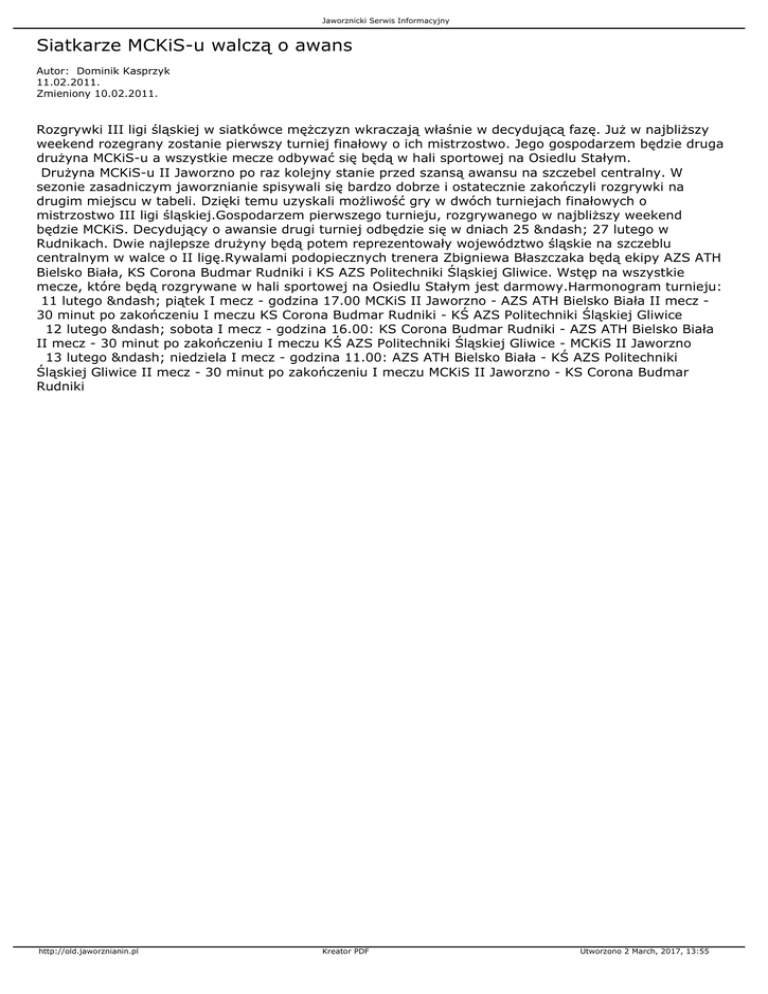 Jaworznicki Serwis Informacyjny Siatkarze MCKiS-u walczą o awans Autor: Dominik Kasprzyk 11.02.2011. Zmieniony 10.02.2011. Rozgrywki III ligi śląskiej w siatkówce mężczyzn wkraczają właśnie w decydującą fazę. Już w najbliższy weekend rozegrany zostanie pierwszy turniej finałowy o ich mistrzostwo. Jego gospodarzem będzie druga drużyna MCKiS-u a wszystkie mecze odbywać się będą w hali sportowej na Osiedlu Stałym. Drużyna MCKiS-u II Jaworzno po raz kolejny stanie przed szansą awansu na szczebel centralny. W sezonie zasadniczym jaworznianie spisywali się bardzo dobrze i ostatecznie zakończyli rozgrywki na drugim miejscu w tabeli. Dzięki temu uzyskali możliwość gry w dwóch turniejach finałowych o mistrzostwo III ligi śląskiej.Gospodarzem pierwszego turnieju, rozgrywanego w najbliższy weekend będzie MCKiS. Decydujący o awansie drugi turniej odbędzie się w dniach 25 – 27 lutego w Rudnikach. Dwie najlepsze drużyny będą potem reprezentowały województwo śląskie na szczeblu centralnym w walce o II ligę.Rywalami podopiecznych trenera Zbigniewa Błaszczaka będą ekipy AZS ATH Bielsko Biała, KS Corona Budmar Rudniki i KS AZS Politechniki Śląskiej Gliwice. Wstęp na wszystkie mecze, które będą rozgrywane w hali sportowej na Osiedlu Stałym jest darmowy.Harmonogram turnieju: 11 lutego – piątek I mecz - godzina 17.00 MCKiS II Jaworzno - AZS ATH Bielsko Biała II mecz 30 minut po zakończeniu I meczu KS Corona Budmar Rudniki - KŚ AZS Politechniki Śląskiej Gliwice 12 lutego – sobota I mecz - godzina 16.00: KS Corona Budmar Rudniki - AZS ATH Bielsko Biała II mecz - 30 minut po zakończeniu I meczu KŚ AZS Politechniki Śląskiej Gliwice - MCKiS II Jaworzno 13 lutego – niedziela I mecz - godzina 11.00: AZS ATH Bielsko Biała - KŚ AZS Politechniki Śląskiej Gliwice II mecz - 30 minut po zakończeniu I meczu MCKiS II Jaworzno - KS Corona Budmar Rudniki http://old.jaworznianin.pl Kreator PDF Utworzono 2 March, 2017, 13:55