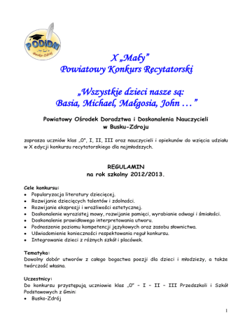 X „Mały” Powiatowy Konkurs Recytatorski „Wszystkie dzieci nasze są: Basia, Michael, Małgosia, John …” Powiatowy Ośrodek Doradztwa i Doskonalenia Nauczycieli w Busku-Zdroju zaprasza uczniów klas „0”, I, II, III oraz nauczycieli i opiekunów do wzięcia udziału w X edycji konkursu recytatorskiego dla najmłodszych. REGULAMIN na rok szkolny 2012/2013. Cele konkursu: Popularyzacja literatury dziecięcej. Rozwijanie dziecięcych talentów i zdolności. Rozwijanie ekspresji i wrażliwości estetycznej. Doskonalenie wyrazistej mowy, rozwijanie pamięci, wyrabianie odwagi i śmiałości. Doskonalenie prawidłowego interpretowania utworu. Podnoszenie poziomu kompetencji językowych oraz zasobu słownictwa. Uświadomienie konieczności respektowania reguł konkursu. Integrowanie dzieci z różnych szkół i placówek. Tematyka: Dowolny dobór utworów z całego bogactwa poezji dla dzieci i młodzieży, a także twórczość własna. Uczestnicy: Do konkursu przystępują uczniowie klas „0” – I – II – III Przedszkoli i Szkół Podstawowych z Gmin: Busko-Zdrój 1 Chmielnik Gnojno Kazimierza Wielka Nowy Korczyn Opatowiec Pacanów Pińczów Solec Zdrój Stopnica Tuczępy Wiślica Warunki konkursu: Każda gmina wyznacza miejsce eliminacji gminnych. Uczestnicy w konkursach gminnym i powiatowym podzieleni będą na dwie grupy wiekowe: 1. dzieci z klasy „0” i I. 2. dzieci z klas II i III. 3. każdy uczestnik zaprezentuje jeden utwór w czasie nie przekraczającym 5 minut. Etapy konkursu: I etap – szkolny przeprowadzony w poszczególnych placówkach (szkołach, przedszkolach). II etap – gminny, w którym biorą udział uczniowie ze szkół i przedszkoli w danej Gminie: Komisja Gminna wyłoni 3 uczniów z każdej grupy wiekowej, którzy najlepiej zaprezentowali swoje wiersze i zakwalifikuje ich do III etapu - finałowego. Protokoły Komisji Gminnych prosimy składać do PODiDN w Busku-Zdroju w terminie do 26.04.2013 r. III etap – finałowy - powiatowy: Konkurs finałowy odbędzie się w maju 2013 r. Informacje o terminie i miejscu etapu finałowego zostaną przekazane koordynatorom gminnym z dwutygodniowym wyprzedzeniem oraz zostaną zamieszczone na stronie internetowej Ośrodka www.podidnbusko.pl. Uczestnicy w kolejności alfabetycznej będą prezentować wybrany utwór. Rozpoczną dzieci z klas „0”, następnie z klas I - II - III. 2 Kryteria oceny: odpowiedni dobór tekstu, staranne pamięciowe opanowanie tekstu, intonacja i modulacja głosu, interpunkcja, artykulacja, tempo recytacji, postawa recytatora, strój uczestnika, ogólne wrażenie estetyczne. Patronat medialny: „Buski Kwartalnik Edukacyjny”, „Moje Ponidzie”. Dodatkowe informacje: W konkursie finałowym wezmą udział uczniowie wyłonieni w eliminacjach gminnych (maksymalnie sześć osób z gminy). Wszystkich uczestników oceniać będzie profesjonalne jury. Koordynatorów Gminnych prosimy o składanie zgłoszeń uczestników do konkursu finałowego do 26.04.2013 r. według załączonego wzoru na adres: Powiatowy Ośrodek Doradztwa i Doskonalenia Nauczycieli 28 – 100 Busko-Zdrój al. Mickiewicza 21. lub e-mailem: [email protected] bądź faxem: (41) 378 18 56. Szkoły biorące udział w konkursie zobligowane są do uzyskania zgody od rodzica lub opiekuna prawnego na przetwarzanie danych osobowych dzieci biorących udział w konkursie – w załączeniu wzór oświadczenia, które należy dołączyć do formularza zgłoszeniowego. Regulamin konkursu zamieszczony jest na stronie PODiDN. Na dzieci czekają nagrody. W sprawach dotyczących organizacji i przebiegu konkursu, zapraszamy gminnych koordynatorów „recytatorskich talentów” do PODiDN na spotkanie, o którym zostaną Państwo poinformowani. Termin spotkania koordynatorów gminnych zostanie zamieszczony na stronie internetowej Ośrodka www.podidnbusko.pl. Informacji na temat przygotowań do konkursu udzielają koordynatorzy powiatowi: Lidia Soja tel. 605 362 844. Agnieszka Kaszewska tel. 509 596 856 Zapraszamy do udziału ! 3 PROTOKÓŁ z eliminacji gminnych X „Małego” Powiatowego Konkursu Recytatorskiego „Wszystkie dzieci nasze są: Basia, Michael, Małgosia, John …” Dnia …………………….. 2013 r. w Szkole Podstawowej w ……………………………….…………………… odbył się Gminny konkurs kończący zmagania uczestników z klas 0-III Szkół Podstawowych/Przedszkoli w Gminie………………………………………………………..…..……..….. Szkoła Podstawowa/Przedszkole w…………………………………………………….………. ……………………………………………………………………………………………………..…………………..… ……………………………………………………………………………………………………..…………………..… …………………………………………………………………………………………………..……………………….. ………………………………………………………………………………………………………..…………………… (proszę wymienić wszystkie placówki biorące udział w konkursie gminnym) Rywalizowało między sobą ………………….…. uczestników w 2 kategoriach wiekowych: Klasy: 0 - I ………….…..….uczniów Klasy: II – III………….….. uczniów Do X Finałowego konkursu zakwalifikowali się: Kategoria I: klasy 0 - I I - miejsce zajęła (zajął) – osobno proszę podać następujące dane dziecka i nauczyciela: Imię i nazwisko dziecka …………………………………………………………………………………..…….……….………… klasa…………………………………………………………......................................................................................... ze szkoły/przedszkola w…………………
