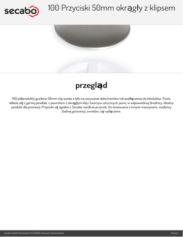 100 Przyciski 50mm okrągły z klipsem przegląd 100 półprodukty guzików 50mm clip sonda z tyłu na zszywanie dokumentów lub podłączenie do tekstyliów. Puste składa się z górnej powłoki, z powrotem z okrągłym klip i tworzyw sztucznych jasne, w odpowiedniej średnicy. Idealny produkt dla promocji. Przyciski są zgodne z Secabo naciśnie przycisk. Do stosowania z innymi maszynami, możemy żadnej gwarancji, zwrotów, są wyłączone. Secabo GmbH | Hochstatt 6-8 | 85283 Wolnzach | Deutschland Strona 1 100 Przyciski 50mm okrągły z klipsem Parametry techniczne Kształt butonu Rozmiar butonu okrągły Ø 50mm Secabo GmbH | Hochstatt 6-8 | 85283 Wolnzach | Deutschland Strona 2 100 Przyciski 50mm okrągły z klipsem Widoki Secabo GmbH | Hochstatt 6-8 | 85283 Wolnzach | Deutschland Strona 3