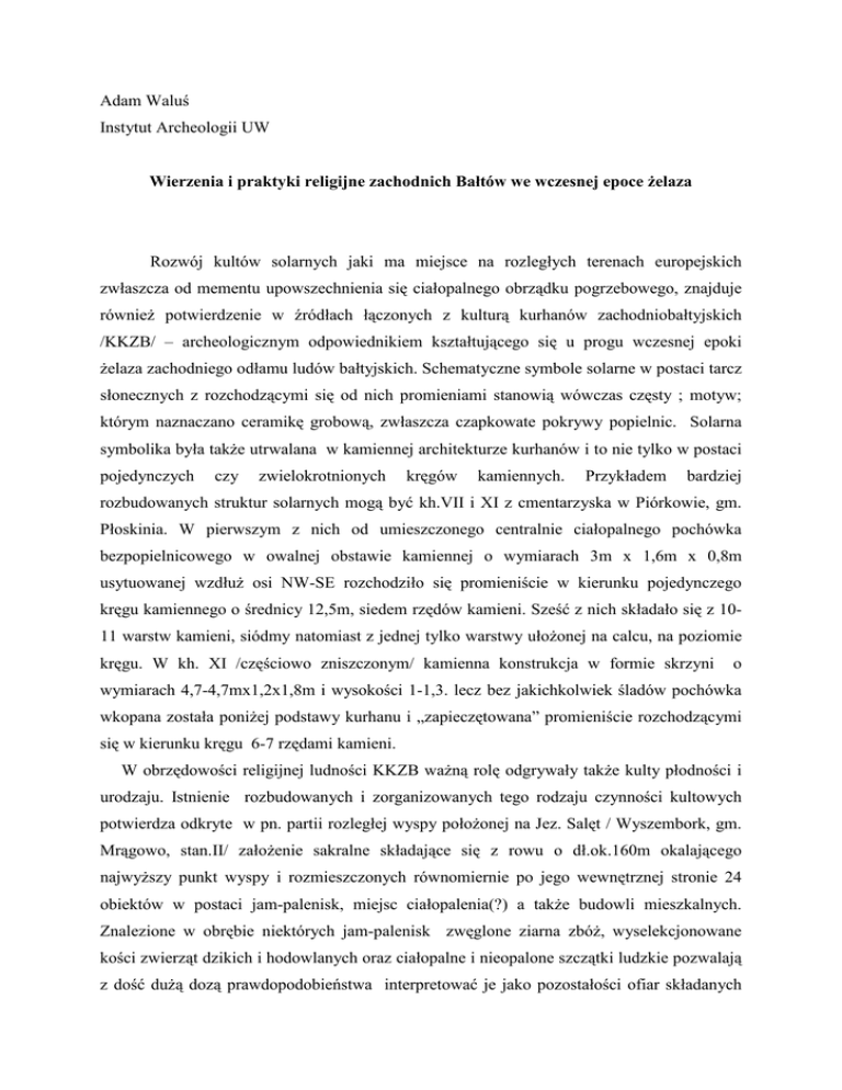 Adam Waluś Instytut Archeologii UW Wierzenia i praktyki religijne zachodnich Bałtów we wczesnej epoce żelaza Rozwój kultów solarnych jaki ma miejsce na rozległych terenach europejskich zwłaszcza od mementu upowszechnienia się ciałopalnego obrządku pogrzebowego, znajduje również potwierdzenie w źródłach łączonych z kulturą kurhanów zachodniobałtyjskich /KKZB/ – archeologicznym odpowiednikiem kształtującego się u progu wczesnej epoki żelaza zachodniego odłamu ludów bałtyjskich. Schematyczne symbole solarne w postaci tarcz słonecznych z rozchodzącymi się od nich promieniami stanowią wówczas częsty ; motyw; którym naznaczano ceramikę grobową, zwłaszcza czapkowate pokrywy popielnic. Solarna symbolika była także utrwalana w kamiennej architekturze kurhanów i to nie tylko w postaci pojedynczych czy zwielokrotnionych kręgów kamiennych. Przykładem bardziej rozbudowanych struktur solarnych mogą być kh.VII i XI z cmentarzyska w Piórkowie, gm. Płoskinia. W pierwszym z nich od umieszczonego centralnie ciałopalnego pochówka bezpopielnicowego w owalnej obstawie kamiennej o wymiarach 3m x 1,6m x 0,8m usytuowanej wzdłuż osi NW-SE rozchodziło się promieniście w kierunku pojedynczego kręgu kamiennego o średnicy 12,5m, siedem rzędów kamieni. Sześć z nich składało się z 1011 warstw kamieni, siódmy natomiast z jednej tylko warstwy ułożonej na calcu, na poziomie kręgu. W kh. XI /częściowo zniszczonym/ kamienna konstrukcja w formie skrzyni o wymiarach 4,7-4,7mx1,2x1,8m i wysokości 1-1,3. lecz bez jakichkolwiek śladów pochówka wkopana została poniżej podstawy kurhanu i „zapieczętowana” promieniście rozchodzącymi się w kierunku kręgu 6-7 rzędami kamieni. W obrzędowości religijnej ludności KKZB ważną rolę odgrywały także kulty płodności i urodzaju. Istnienie rozbudowanych i zorganizowanych tego rodzaju czynności kultowych potwierdza odkryte w pn. partii rozległej wyspy położonej na Jez. Salęt / Wyszembork, gm. Mrągowo, stan.II/ założenie sakralne składające się z rowu o dł.ok.160m okalającego najwyższy punkt wyspy i rozmieszczonych równomiernie po jego wewnętrznej stronie 24 obiektów w postaci jam-palenisk, miejsc ciałopalenia(?) a także budowli mieszkalnych. Znalezione w obrębie niektórych jam-palenisk zwęglone ziarna zbóż, wyselekcjonowane kości zwierząt dzikich i hodowlanych oraz ciałopalne i nieopalone szczątki ludzkie pozwalają z dość dużą dozą prawdopodobieństwa interpretować je jako pozostałości ofiar składanych bóstwu lub bóstwom odpowiedzialnym za różne sfery życia. Unikatowy w swym charakterze obiekt z Wyszemborka wskazuje również na istnienie wśród wczesnożelaznej społeczności pn-wsch. Polski funkcjonariuszy kultu – osób inicjujących, organizujących i realizujących stosowne praktyki religijne. Niektórzy z nich mogli też być po śmierci chowani w grobach o solarnej architekturze, takich jak np. kh. VII z Piórkowa. Rysujące się w świetle aktualnie posiadanych źródeł wierzenia i praktyki religijne ludności KKZB nie odbiegały jak się wydaje, w zasadniczy sposób od obserwowanych wśród społeczności kultury łużyckiej /KŁ/ czy różnoczasowej jej kulturze pomorskiej /KP/. Pewną różnicę stanowiło jednak obowiązujące na omawianym terenie tabu utrwalania w ilustracyjnej formie na ceramice grobowej treści doktryny religijnej i obrzędów, tak często natomiast spotykane w KŁ a zwłaszcza KP.