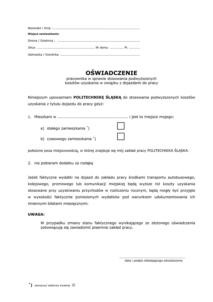 Nazwisko i Imię : .................................................................................... Miejsce zamieszkania: Gmina / Dzielnica : ................................................................................ Ulica: ........................................................ Nr domu ............. M. ........... Jednostka / Komórka: ............................................................................. OŚWIADCZENIE pracownika w sprawie stosowania podwyższonych kosztów uzyskania w związku z dojazdami do pracy Niniejszym upoważniam POLITECHNIKĘ ŚLĄSKĄ do stosowania podwyższonych kosztów uzyskania z tytułu dojazdu do pracy gdyż: 1. Mieszkam w ...................................................... i jest to miejsce mojego: a) stałego zamieszkania *) b) czasowego zamieszkania *) położone poza miejscowością, w której znajduje się mój zakład pracy POLITECHNIKA ŚLĄSKA. 2. nie pobieram dodatku za rozłąkę Jeżeli faktyczne wydatki na dojazd do zakładu pracy środkami transportu autobusowego, kolejowego, promowego lub komunikacji miejskiej będą wyższe niż koszty uzyskania stosowane przy uzyskiwaniu przychodów w rozliczeniu rocznym, będą mogły być przyjęte w wysokości faktycznie poniesionych wydatków pod warunkiem udokumentowania ich imiennymi biletami miesięcznymi. UWAGA: W przypadku zmiany stanu faktycznego wynikającego ze złożonego oświadczenia zobowiązuję się zawiadomić pisemnie zakład pracy. ................................................................ data i podpis składającego oświadczenie * ) zaznaczyć właściwy kwadrat 5
