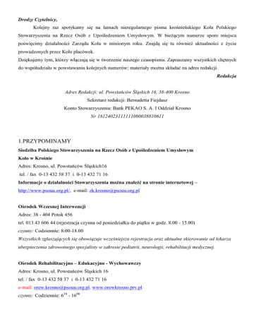 Drodzy Czytelnicy, Kolejny raz spotykamy się na łamach nieregularnego pisma krośnieńskiego Koła Polskiego Stowarzyszenia na Rzecz Osób z Upośledzeniem Umysłowym. W bieżącym numerze sporo miejsca poświęcimy działalności Zarządu Koła w minionym roku. Znajdą się tu również aktualności z życia prowadzonych przez Koło placówek. Dziękujemy tym, którzy włączają się w tworzenie naszego czasopisma. Zapraszamy wszystkich chętnych do współudziału w powstawaniu kolejnych numerów; materiały można składać na adres redakcji. Redakcja Adres Redakcji: ul. Powstańców Śląskich 16, 38-400 Krosno Sekretarz redakcji: Bernadetta Fiejdasz Konto Stowarzyszenia: Bank PEKAO S. A. I Oddział Krosno Nr 18124023111111000038810611 1.PRZYPOMINAMY Siedziba Polskiego Stowarzyszenia na Rzecz Osób z Upośledzeniem Umysłowym Koło w Krośnie Adres: Krosno, ul. Powstańców Śląskich16 tel. / fax 0-13 432 58 37 i 0-13 432 71 16 Informacje o działalności Stowarzyszenia można znaleźć na stronie internetowej – http://www.psouu.org.pl/, e-mail: [email protected] Ośrodek Wczesnej Interwencji Adres: 38 - 404 Potok 456 tel. 013 43 606 44 (rejestracja czynna od poniedziałku do piątku w godz. 8.00 - 15.00) czynny: Codziennie: 8.00-18.00 Wszystkich zgłaszających się obowiązuje wcześniejsza rejestracja oraz aktualne skierowanie od lekarza ubezpieczenia zdrowotnego specjalisty w zakresie pediatrii, neurologii, rehabilitacji medycznej. Ośrodek Rehabilitacyjno – Edukacyjno - Wychowawczy Adres: Krosno, ul. Powstańców Śląskich 16 tel. / fax 0-13 432 58 37 i 0-13 432 71 16 e-mail: [email protected], www.orewkrosno.prv.pl czynny: Codziennie: 630 - 1600 Warsztat Terapii Zajęciowej Adres: Krosno, ul. Grodzka 49 tel. 0-13 420 07 90, 0-13 420 07 91 e-mail: [email protected] czynny: Codziennie: 630 -1530 Środowiskowy Dom Samopomocy Adres: 38 – 404 Potok 456 tel. 0-13 436 06 50 e-mail: [email protected] czynne: Codziennie: 700 – 1530 Biblioteka: Krosno, ul. Powstańców Śląskich 16 czynna: Codziennie: 1400 - 1430 Spis treści: CO NOWEGO W NASZYM KOLE? • Minął rok ...................................................................................................................................................... • Zaangażowanie mile widziane ..................................................................................................................... • Uchwała w sprawie przyjęcia Programu Koła na najbliższe lata ................................................................. • Program działalności Koła na lata 2007 – 2010 ........................................................................................... OŚRODEK WCZESNEJ INTERWENCJI • Aktualności ................................................................................................................................................... OŚRODEK REHABILITACYJNO – EDUKACYJNO - WYCHOWAWCZY • Programy własne .......................................................................................................................................... • Terapia ......................................................................................................................................................... • Z Kroniki ...................................................................................................................................................... ŚRODOWISKOWY DOM SAMOPOMOCY • Co się dzieje w ŚDS? ................................................................................................................................... • Głos rodzica .................................................................................................................................................. • Wspomnienia z nad morza ........................................................................................................................... WARSZTAT TERAPII ZAJĘCIOWEJ.......................................................................................................... • Moja Łucznica .............................................................................................................................................. • Na Albertianie po raz drugi .......................................................................................................................... CO NOWEGO W NASZYM KOLE? Minął rok... Mija rok działalności Zarządu Koła Polskiego Stowarzyszenia na Rzecz Osób z Upośledzeniem Umysłowym w Krośnie pod moim przewodnictwem, a więc czas na pewne refleksje, z którymi chciałbym się podzielić na łamach naszego pisma. Na działalność naszego Koła składa się codzienna praca zatrudnionych pracowników, a także społeczne zaangażowanie członków Zarządu Koła. Rok 2007 postawił przed Zarządem szereg różnych problemów, które należało rozwiązać. Decyzje podejmowane przez Zarząd nie zawsze były łatwe do podjęcia. Uważam, że Zarząd Koła przed podjęciem każdej decyzji kierował się zasadą, że wszystko, co robimy to dla dobra naszych dzieci, młodzieży i osób dorosłych z niepełnosprawnością intelektualną. Jedną z pierwszych decyzji, z jaką zmierzył się Zarząd było utworzenie Biura Obsługi Placówek. Pragnę wyrazić podziękowanie byłemu Zarządowi za przygotowanie podwalin do utworzenia Biura. Pomocne były materiały dotyczące regulaminu BOP, zakresu obowiązków; w dużej mierze skorzystaliśmy z nich, co znacznie przyśpieszyło powstanie placówki. Jeżeli chodzi o funkcjonowanie Biura Obsługi Placówek, to uważam, że dokonaliśmy trafnego wyboru na stanowisko Dyrektora BOP. Niezwykle ważne decyzje zostały podjęte, co do prac remontowych w naszych ośrodkach. Budynek OREW został ocieplony i została położona nowa elewacja zewnętrzna, zakupiona została kostka brukowa. Niestety aura nie pozwoliła na dalsze prace w 2007 r., ale na pewno zostaną one dokończone 