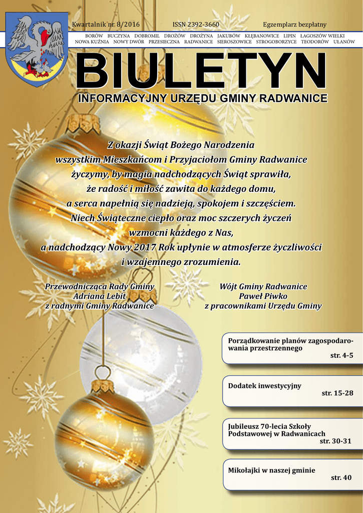Kwartalnik nr 8/2016 BIULETYN INFORMACYJNY ISSN 2392-3660 URZĘDU GMINY RADWANICE Egzemplarz bezpłatny BORÓW BUCZYNA DOBROMIL DROŻÓW DROŻYNA JAKUBÓW KŁĘBANOWICE LIPIN ŁAGOSZÓW WIELKI NOWA KUŹNIA NOWY DWÓR PRZESIECZNA RADWANICE SIEROSZOWICE STROGOBORZYCE TEODORÓW UŁANÓW BIULETYN INFORMACYJNY URZĘDU GMINY RADWANICE Z okazji Świąt Bożego Narodzenia wszystkim Mieszkańcom i Przyjaciołom Gminy Radwanice życzymy, by magia nadchodzących Świąt sprawiła, że radość i miłość zawita do każdego domu, a serca napełnią się nadzieją, spokojem i szczęściem. Niech Świąteczne ciepło oraz moc szczerych życzeń wzmocni każdego z Nas, a nadchodzący Nowy 2017 Rok upłynie w atmosferze życzliwości i wzajemnego zrozumienia. Przewodnicząca Rady Gminy Adriana Lebit z radnymi Gminy Radwanice Wójt Gminy Radwanice Paweł Piwko z pracownikami Urzędu Gminy Porządkowanie planów zagospodaro wania przestrzennego str. 4-5 Dodatek inwestycyjny str. 15-28 Jubileusz 70-lecia Szkoły Podstawowej w Radwanicach str. 30-31 Mikołajki w naszej gminie strona 1 str. 40 BIULETYN INFORMACYJNY URZĘDU GMINY RADWANICE Szanowni Państwo Kolejny rok naszej współpracy dobiega końca. To dobry czas na podsumowanie zadań inwestycyjnych oraz zaangażowania w działalność kulturalną i społeczną. Serdecznie dziękuję wszystkim mieszkańcom, sołtysom, Radzie Gminy, kierownikom i pracownikom jednostek organizacyjnych oraz urzędnikom za realizację zadań, które przyczyniają się do lepszego życia w naszej gminie. Z pełną odpowiedzialnością mogę stwierdzić, że jesteśmy dobrze przygotowani pod względem merytorycznym jak i planistycznym do dalszych działań zmierzających do rozwoju naszej gminy. Przez ostatnie dwa lata przygotowaliśmy i uchwaliliśmy dokumenty strategiczne (Strategię Rozwoju Gminy na lata 2015-2023, Lokalny Program Rewitalizacji na lata 2016-2023, Plan Gospodarki Niskoemisyjnej na lata 2015-2020), które są niezbędne do realizacji zadań inwestycyjnych oraz pozyskiwania środków pozabudżetowych. Aktualnie jesteśmy na etapie sporządzania nowego Studium Uwarunkowań i Kierunków Zagospodarowania Przestrzennego. Począwszy od roku 2015 przystąpiliśmy również do porządkowania planów zagospodarowania przestrzennego. Cel, jaki sobie określiliśmy to objęcie planem całego obszaru gminy. Pozdrawiam Wójt Gminy Radwanice Paweł Piwko XV i XVI SESJA RADY GMINY W dniu 17 października 2016r. odbyła się XV sesja Rady Gminy. Na sesji obecni byli wszyscy radni stanowiąc quorum do podejmowania uchwał. Podczas sesji zostały podjęte następujące uchwały; - w sprawie zmiany wieloletniej prognozy Finansowej Gminy Radwanice na lata 2016-2033, - w sprawie zmiany budżetu Gminy na rok 2016, - w sprawie przyjęcia Lokalnego Programu Rewitalizacji, - w sprawie zmiany Uchwały nr VII/25/11 Rady Gminy w Radwanicach z dnia 25 maja 2011 r. w sprawie ustalenia opłat za świadczenia przedszkola gminnego, - w sprawie ustalenia wysokości stawek opłat za zajecie pasa drogowego, - w sprawie rozpatrzenia skarg. Uchwały zostały podjęte jednogłośnie. W dniu 28 listopada 2016 roku odbyła się XVI sesja Rady Gminy. Na posiedzeniu obecni byli wszyscy radni. Podczas sesji podjęte zostały uchwały: - w sprawie zmiany Wieloletniej Prognozy Finansowej na lata 2016-2033, - w sprawie zmiany budżetu na 2016r., - w sprawie zmiany statutu GOPS, - w sprawie programu opieki nad zabytkami dla Gminy Radwanice na lata 2016-2019, - w sprawie obniżenia ceny skupu żyta będącej podstawą do ustalenia podatk rolnego na rok podatkowy 2017, - w sprawie zatwierdzenia Wieloletniego programu gospodarowania mieszkaniowym zasobem Gminy Radwanice na lata 2017-2021. Wszystkie uchwały zostały podjęte jednogłośnie. Daria Ciosek PRACE NAD LOKALNYM PROGRAMEM REWITALIZACJI DLA GMINY RADWANICE ZAKOŃCZONE SUKCESEM J ak informowaliśmy Państwa już wcześniej Gmina Radwanice uzyskała dofinansowanie, na opracowanie lokalnego programu rewitalizacji w ramach projektu Urzędu Marszałkowskiego Województwa Dolnośląskiego „Przygotowanie programów rewitalizacji na terenie Województwa Dolnośląskiego” współfinansowanego ze środków Programu Operacyjnego Pomoc Techniczna 2014-2020. W ramach sporządzenia niniejszego dokumentu zaplanowano działania kompleksowe obejmujące: szeroko pojętą diagnozę i analizę problemów wymagających rewitalizacji, powołanie zespołów zadaniowych, jak również warsztaty i konsultacje. Realizację dokumentu przewidziano na lata 2016-2023. Natomiast przygotostrona 2 wanie programu rewitalizacji pozwoli Gminie Radwanice na długofalowe działania zmierzające do poprawy warunków i jakości życia jej mieszkańców, zapobieganie dalszej degradacji obszarów, w których stwierdzono stany kryzysowe, jak również umożliwi Gminie ubieganie się o środki finansowe z Unii Europejskiej w ramach RPO WD 2014-2020 oraz uzyskanie dotacji. Głównym warunkiem refundacji niniejszej dotacji było zatwierdzenie ,,Lokalnego Programu Rewitalizacji dla Gminy Radwanice na lata 2016 – 2023” przez komisję weryfikacyjną w zakresie zgodności niniejszego dokumentu z Wytycznymi programowymi IŻ RPO WD dotyczącymi zasad przygotowania lokalnych programów rewitalizacji (lub dokumentów równorzędnych) w perspektywie finansowej 2014 – 2020. W dniu 21 listopada br. Urząd Marszałkowski Województwa Dolnośląskiego poinformował o pozytywnej ocenie naszego programu. Dziękujemy wszystkim mieszkańcom za zaangażowanie w realizację programu. Naszym szkołom za pomoc w rozpropagowaniu ankiet badawczych a uczestnikom warsztatów oraz debat za pracę nad samym dokumentem. Julita Wrzesińska BIULETYN INFORMACYJNY URZĘDU GMINY RADWANICE PROJEKT GMINY RADWANICE NA PIERWSZYM MIEJSCU W WOJEWÓDZTWIE DOLNOŚLĄSKIM S zanowni Państwo jest nam niezmiernie miło poinformować, że projekt Gminy Radwanice pn.: ,,Wdrożenie e-usług publicznych w Gminie Radwanice” zło