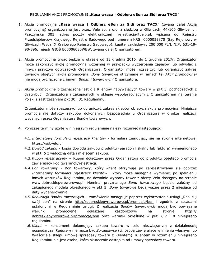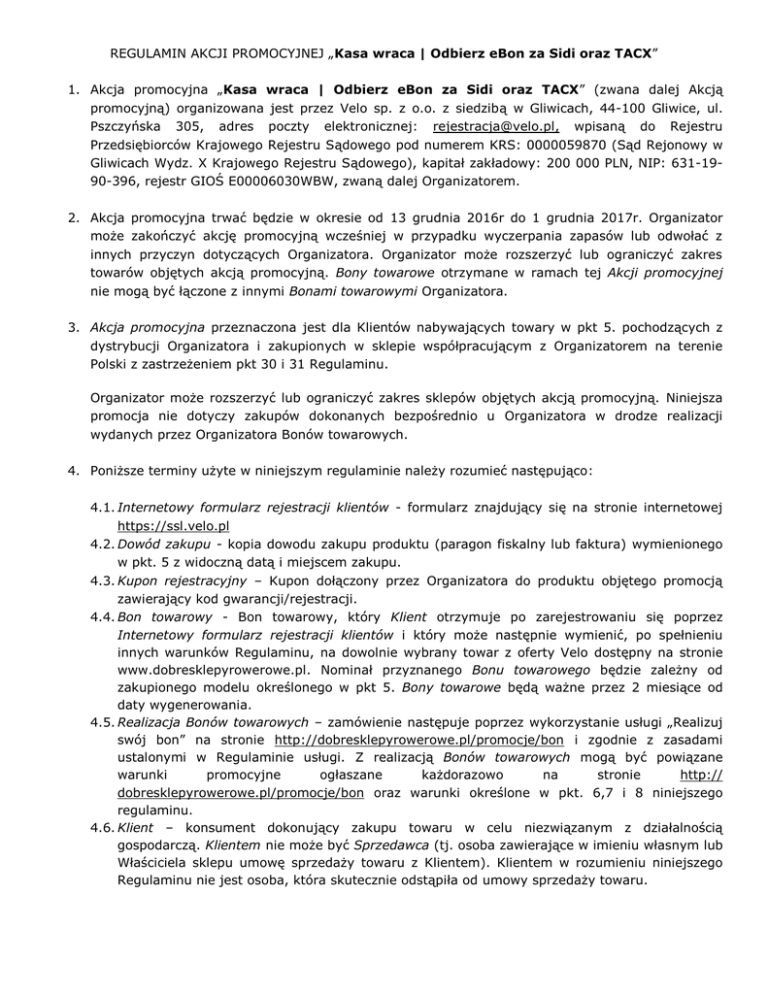 REGULAMIN AKCJI PROMOCYJNEJ „Kasa wraca | Odbierz eBon za Sidi oraz TACX” 1. Akcja promocyjna „Kasa wraca | Odbierz eBon za Sidi oraz TACX” (zwana dalej Akcją promocyjną) organizowana jest przez Velo sp. z o.o. z siedzibą w Gliwicach, 44-100 Gliwice, ul. Pszczyńska 305, adres poczty elektronicznej: [email protected], wpisaną do Rejestru Przedsiębiorców Krajowego Rejestru Sądowego pod numerem KRS: 0000059870 (Sąd Rejonowy w Gliwicach Wydz. X Krajowego Rejestru Sądowego), kapitał zakładowy: 200 000 PLN, NIP: 631-1990-396, rejestr GIOŚ E00006030WBW, zwaną dalej Organizatorem. 2. Akcja promocyjna trwać będzie w okresie od 13 grudnia 2016r do 1 grudnia 2017r. Organizator może zakończyć akcję promocyjną wcześniej w przypadku wyczerpania zapasów lub odwołać z innych przyczyn dotyczących Organizatora. Organizator może rozszerzyć lub ograniczyć zakres towarów objętych akcją promocyjną. Bony towarowe otrzymane w ramach tej Akcji promocyjnej nie mogą być łączone z innymi Bonami towarowymi Organizatora. 3. Akcja promocyjna przeznaczona jest dla Klientów nabywających towary w pkt 5. pochodzących z dystrybucji Organizatora i zakupionych w sklepie współpracującym z Organizatorem na terenie Polski z zastrzeżeniem pkt 30 i 31 Regulaminu. Organizator może rozszerzyć lub ograniczyć zakres sklepów objętych akcją promocyjną. Niniejsza promocja nie dotyczy zakupów dokonanych bezpośrednio u Organizatora w drodze realizacji wydanych przez Organizatora Bonów towarowych. 4. Poniższe terminy użyte w niniejszym regulaminie należy rozumieć następująco: 4.1. Internetowy formularz rejestracji klientów - formularz znajdujący się na stronie internetowej https://ssl.velo.pl 4.2. Dowód zakupu - kopia dowodu zakupu produktu (paragon fiskalny lub faktura) wymienionego w pkt. 5 z widoczną datą i miejscem zakupu. 4.3. Kupon rejestracyjny – Kupon dołączony przez Organizatora do produktu objętego promocją zawierający kod gwarancji/rejestracji. 4.4. Bon towarowy - Bon towarowy, który Klient otrzymuje po zarejestrowaniu się poprzez Internetowy formularz rejestracji klientów i który może następnie wymienić, po spełnieniu innych warunków Regulaminu, na dowolnie wybrany towar z oferty Velo dostępny na stronie www.dobresklepyrowerowe.pl. Nominał przyznanego Bonu towarowego będzie zależny od zakupionego modelu określonego w pkt 5. Bony towarowe będą ważne przez 2 miesiące od daty wygenerowania. 4.5. Realizacja Bonów towarowych – zamówienie następuje poprzez wykorzystanie usługi „Realizuj swój bon” na stronie http://dobresklepyrowerowe.pl/promocje/bon i zgodnie z zasadami ustalonymi w Regulaminie usługi. Z realizacją Bonów towarowych mogą być powiązane warunki promocyjne ogłaszane każdorazowo na stronie http:// dobresklepyrowerowe.pl/promocje/bon oraz warunki określone w pkt. 6,7 i 8 niniejszego regulaminu. 4.6. Klient – konsument dokonujący zakupu towaru w celu niezwiązanym z działalnością gospodarczą. Klientem nie może być Sprzedawca (tj. osoba zawierające w imieniu własnym lub Właściciela sklepu umowę sprzedaży towaru z Klientem). Klientem w rozumieniu niniejszego Regulaminu nie jest osoba, która skutecznie odstąpiła od umowy sprzedaży towaru. 5. Klient uczestniczący w Akcji promocyjnej zgodnie z poniższymi ustaleniami: 5.1 Za zakup: Model Buty MTB BUVEL niebiesko-białe Buty MTB BUVEL pomarańczowo-czarne Buty MTB BUVEL żółto-czarne Buty MTB BUVEL czarne Buty MTB BUVEL białe Buty MTB BUVEL czarno-czerwone Buty MTB BUVEL WOMAN fuxia-białe Buty MTB BUVEL WOMAN białe Buty szosa LEVEL niebiesko-białe Buty szosa LEVEL pomarańczowo-czarne Buty szosa LEVEL białe Buty szosa LEVEL czarne Buty szosa LEVEL żółto-czarne Buty szosa LEVEL czarno-czerwone Buty szosa LEVEL WOMAN fuxia-białe Buty szosa LEVEL WOMAN białe Buty MTB DOMINATOR MEGA czarne Buty MTB EAGLE 5 FIT kamuflaż Buty MTB LOGO XC białe vernice Buty MTB LOGO XC czarne vernice Buty MTB GIAU MEGA czarne Buty MTB GIAU perłowo-czarne Buty MTB DURAN czarne Buty MTB DURAN żółto-czarne Buty MTB INDOOR WOMAN białe Buty MTB TORK czarne Buty MTB EPIC czarne WZÓR Buty MTB EPIC czerwone WZÓR Buty MTB EPIC szare WZÓR Buty MTB GHIBLI czarne WZÓR Buty szosa GENIUS PRO czarne Buty szosa GENIUS PRO MEGA czarno-tytanowe Buty szosa LOGO białe vernice Buty szosa LOGO czarne vernice Buty szosa LOGO żółto-czarne WZÓR Buty szosa TARUS czarne Buty szosa TARUS żółto-czarne Buty szosa SPARK czarne Buty triathlon T-3 Carbon Composite biało-niebieskie Buty triathlon T-2 perłowe Buty triathlon T-3 Carbon Composite WOMAN srebrno-czerwone otrzyma Bon towarowy o wartości 30,00 zł; Marka SIDI SIDI SIDI SIDI SIDI SIDI SIDI SIDI SIDI SIDI SIDI SIDI SIDI SIDI SIDI SIDI SIDI SIDI SIDI SIDI SIDI SIDI SIDI SIDI SIDI SIDI SIDI SIDI SIDI SIDI SIDI SIDI SIDI SIDI SIDI SIDI SIDI SIDI SIDI SIDI SIDI 5.2 Za zakup: Model Buty MTB CAPE czarne Buty MTB CAPE białe Buty MTB CAPE żółto-czarne Buty MTB CAPE biało-czarno-czerwone Buty MTB CAPE AIR niebiesko-białe Marka SIDI SIDI SIDI SIDI SIDI Buty MTB CAPE AIR białe Buty MTB EAGLE 5 FIT czarne Buty MTB EAGLE 5 FIT biało-czarno-czerwone Buty MTB EAGLE 5 FIT czarno-niebiesko-czerwono-stalowe Buty MTB EAGLE 5 FIT żółto-czarne Buty MTB BREEZE RAIN czarne Buty MTB EAGLE 5 FIT WOMAN białe Buty MTB EAGLE 5 FIT WOMAN czarne Buty MTB EAGLE 7 czarne, czarno-czerwone, czarno-niebieskie, żółto-czarne Buty MTB EAGLE 7 WOMAN czarne Buty MTB DOMINATOR 5 FIT czarne Buty MTB DOMINATOR 5 FIT MEGA czarne Buty MTB DOMINATOR 7 czarne Buty MTB DOMINATOR 7 MEGA czarne Buty MTB OUTDOOR SD15 czarne Buty MTB OUTDOOR SD15 beżowo-czarne Buty szosa KAOS biało-pomarańczowe Buty szosa KAOS białe Buty szosa KAOS czarne Buty szosa KAOS żółto-czarne Buty szosa KAOS AIR niebiesko-białe Buty szosa KAOS AIR białe Buty szosa GENIUS 5 FIT Carbon biało-czarno-czerwone Buty szosa GENIUS 5 FIT Carbon białe Buty szosa GENIUS 