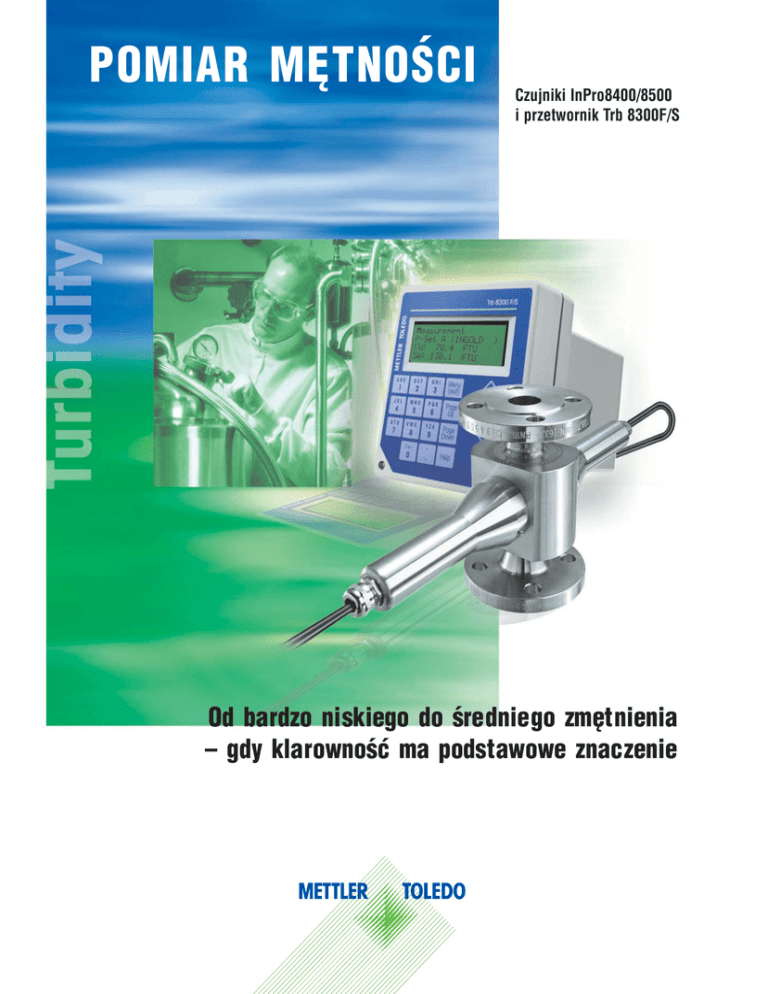 POMIAR MÊTNOŒCI Czujniki InPro8400/8500 i przetwornik Trb 8300F/S Od bardzo niskiego do œredniego zmêtnienia – gdy klarownoœæ ma podstawowe znaczenie System pomiarowy wykorzystuje zjawisko odbicia i rozproszenia œwiat³a przez nierozpuszczone cz¹steczki zawarte w cieczy. Sk³ada siê z przetwornika pomiarowego Trb8300 i czujników pomiarowych: InPro8400 lub InPro8500. Uk³ad jest przeznaczony do pomiaru i detekcji zawartoœci nierozpuszczonych cz¹stek sta³ych w cieczy. Dodatkowy pomiar w œwietle odbitym pod k¹tem 90o, w czujniku InPro8500, daje informacjê o strukturze cz¹stek zwartych w analizowanym oœrodku. System zosta³ zaprojektowany do zastosowania w nastêpuj¹cych bran¿ach: farmacja, biotechnologia, chemia, browarnictwo oraz przemys³ napojowy Ogólne korzyœci z wykorzystania InPro8400 lub InPro8500 Zwiêkszona jakoœæ pomiaru. Zastosowanie Ÿród³a œwiat³a o wysokiej intensywnoœci promieniowania umo¿liwia wykonywanie pomiarów w cieczach, które dla ludzkiego oka s¹ w pe³ni klarowne. Wykorzystanie kombinacji pomiaru w œwietle przechodz¹cym i odbitym pod k¹tem 90o pozwala na rozró¿nienie wielkoœci cz¹stek, powoduj¹cych powstanie zjawiska zmêtnienia. Browarnictwo: mêtnoœæ i klarownoœæ Zwiêkszenie produktywnoœci procesu. Zastosowanie pomiaru ci¹g³ego w znaczny sposób zwiêksza produktywnoœæ procesu produkcyjnego, zmniejszaj¹c iloœæ czasu potrzebnego na wykonanie pracoch³onnych i kosztownych analiz laboratoryjnych, a w nie-których przypadkach znacznie ogranicza koszty przez wyeliminowanie b³êdów produkcyjnych. InPro8400 i In-Pro8500 zapewniaj¹ pomiar zmêtnienia, który jest niezale¿ny od zmian barwy cieczy. Zastosowane materia³y pozwalaj¹ na wykonywanie pomiarów w bardzo agresywnych oœrodkach. Przemys³ chemiczny: pomiar zawartoœci cz¹stek sta³ych Szybka adaptacja Pomiary mog¹ byæ wyœwietlane praktycznie we wszystkich stosowanych jednostkach, tj. FTU, NTU, EBC, ppm, lub gr/l. Kalibracja wtórna odbywa siê przez porównanie wskazañ on-line z pomiarami wykonanymi w pobranej próbce. Uk³ady pomiarowe s¹ przystosowane do monta¿u w praktycznie wszystkich instalacjach produkcyjnych lub mog¹ byæ w ³atwy sposób zaadaptowane. Farmacja i biotechnologia Szeroki zakres zmêtnieñ, wystêpuj¹cych w cieczach, wymaga zastosowania optymalnych metod pomiarowych. Dla niskich i œrednich zmêtnieñ stosuje siê pomiary w œwietle przechodz¹cym oraz odbitym pod k¹tem 90o. W tym przypadku wykorzystuje siê czujniki serii InPro8400 oraz InPro8500. Przetwornik Bezpieczeñstwo i dok³adnoœæ procesu z wykorzystaniem przetwornika Trb8300 · mo¿liwoœæ zastosowania InPro8400 lub 8500 · kalibracja "na próbkê" lub wielopunktowa · diagnostyka uk³adu pomiarowego · dostêp do przetwornika zabezpieczony has³em na dwóch poziomach · wbudowany port RS232 · cztery galwanicznie izolowane wyjœcia pr¹dowe 0/4…20mA · dwa programowalne przekaŸniki progowe, jeden alarmowy · zasilanie 100…240VAC lub 24VDC Czujniki Zalety czujników InPro8400 i 8500 · wysoka dok³adnoœæ i precyzja pomiaru w niskich i œrednich zakresach · kompensacja wp³ywu zmian koloru cieczy mierzonej · niskie wymagania konserwacyjne dziêki zredukowaniu zjawiska oblepiania szkie³ toru pomiarowego · ³atwa adaptacja do instalacji produkcyjnej · fabrycznie skalibrowane czujniki pomiarowe · pomiary w FTU, NTU, EBC, ppm, g/l · przystosowane do instalacji w których jest wykonywany proces mycia CIP Budowa systemu pomiarowego Czujnik InPro8400 Czujniki InPro8400 s¹ idealnym narzêdziem do detekcji cz¹stek o wymiarze wiêkszym od 0,3 mm. Pomiar w œwietle przechodz¹cym pozwala na kompensowanie zmian koloru cieczy. S¹ to typowe wymagania stawiane tego typu urz¹dzeniom w nastêpuj¹cych zastosowaniach: · kontrola jakoœci procesu filtracji oraz detekcja nieszczelnoœci · kontrola wirówek · pomiar zawartoœci cz¹stek sta³ych w cieczy Pomiar w œwietle przechodz¹cym z kompensacj¹ zmian koloru Cechy czujników InPro8400 Zakres pomiarowy Pod³¹czenia Œrednica ruroci¹gu Materia³y Zakres temperaturowy pomiaru Zakres ciœnieniowy Certyfikaty InPro8400 0…400 FTU0…100 EBC, 0…1000ppm DIN, ANSI, APV, NPT, z³¹cza mleczarskie, Techenhagen Varivent, Neumo BioControl, TriClamp DN25...DN100, 1", 4" stal kwasoodporna, szk³o szfirowe, uszczelnienia polimerowe zgodne z wytycznymi FDA 0…140oC, (sterylizowane) 1…16 bar CE, kalibracyjny, 3A, 3.1B InPro8500 Czujniki InPro8500 dodatkowo pozwalaj¹ na okreœlenie zmiany wielkoœci nierozpuszczonych cz¹stek w mierzonym oœrodku, które wywo³uj¹ zjawisko zmêtnienia. Przyk³adowe zastosowania czujników z kompensacj¹ zmian wielkoœci cz¹stek: · jakoœæ filtracji w przemyœle browarniczym i napojowym · kontrola jakoœci produktu po procesach oczyszczania Pomiar w œwietle przechodz¹cym i odbitym pod k¹tem 90o, z kompensacj¹ zmian koloru. Cechy czujników InPro8500 InPro8500 0…100 EBC0…400 NTU DIN, ANSI, APV, NPT, z³¹cza mleczarskie, DN25...DN100, 1", 4" stal kwasoodporna, szk³o szfirowe, uszczelnienia polimerowe zgodne z wytycznymi FDA Zakres temperaturowy pomiaru 0…140oC, (sterylizowane) Zakres ciœnieniowy 1…16 bar Certyfikaty CE, kalibracyjny, 3A, 3.1B, Zakres pomiarowy Pod³¹czenia Œrednica ruroci¹gu Materia³y Przyk³adowe zastosowania Przemys³ Farmacja, Biotechnologia i Przemys³ Chemiczny Zakres zastosowania nadzorownie jakoœci filtracji pomiary czystoœci wody detekcja zawartoœci oleju w wodzie kontrola wymienników ciep³a pomiar zawartoœci cz¹stek Browarnictwo i przemys³ napojowy kontrola klarownoœci napoju kontrola kadzi filtracyjnej filtracja piwa kontrola wtr¹ceñ mleka w wodzie kontrola jakoœci procesu mycia A InPro8400 – – 3 3 3 – 3 – 3 3 A InPro8500 3 3 – – – 3 – 3 – – B Trb8300 F/S 3 3 3 3 3 3 3 3 3 3