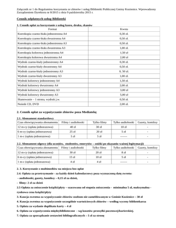 Załącznik nr 1 do Regulaminu korzystania ze zbiorów i usług Biblioteki Publicznej Gminy Kozienice. Wprowadzony Zarządzeniem Dyrektora nr 8/2015 z dnia 9 października 2015 r. Cennik odpłatnych usług Biblioteki 1. Cennik opłat za korzystanie z usług ksero, druku, skanów Format Kwota Kserokopia czarno-biała jednostronna A4 0,30 zł. Kserokopia czarno-biała dwustronna A4 0,50 zł. Kserokopia czarno-biała jednostronna A3 0,50 zł. Kserokopia czarno-biała dwustronna A3 1,00 zł. Kserokopia kolorowa jednostronna A4 1,50 zł Kserokopia kolorowa dwustronna A4 2,00 zł Wydruk czarno-biały jednostronny A4 0,30 zł. Wydruk czarno-biały dwustronny A4 0,50 zł. Wydruk czarno-biały jednostronny A3 0, 50 zł. Wydruk czarno-biały dwustronny A3 1,00 zł. Wydruk kolorowy jednostronny A4 1,50 zł. Wydruk kolorowy dwustronny A4 2,00 zł. Wydruk kolorowy jednostronny A3 3,00 zł Wydruk kolorowy dwustronny A3 5,00 zł Skanowanie – 1 strona, wydruk j.w. 0,50 zł. Nośnik CD, DVD 2,00 zł. 2. Cennik opłat za wypożyczanie zbiorów poza Mediatekę 2.1. Abonament standardowy Czas obowiązywania abonamentu Filmy i audiobooki Tylko filmy Tylko audiobooki Gazety, komiksy 12 m-cy (opłata jednorazowa) 40 zł 30 zł 10 zł - 6 m-cy (opłata jednorazowa) 25 zł 20 zł 5 zł - 1 m-c (opłata jednorazowa) 5 zł 5 zł ------- - 2.2. Abonament ulgowy (dla uczniów, studentów, emerytów – zniżki po okazaniu ważnej legitymacji) Czas obowiązywania abonamentu Filmy i audiobooki Tylko filmy Tylko audiobooki Gazety, komiksy 12 m-cy (opłata jednorazowa) 30 zł 20 zł 8 zł - 6 m-cy (opłata jednorazowa) 15 zł 10 zł 5 zł - 1 m-c (opłata jednorazowa) 4 zł 4 zł ------- - 2. 3. Korzystanie z multimediów na miejscu bez opłat 2.4. Opłata za przetrzymanie - za każdy dzień kalendarzowy poza wyznaczoną datę zwrotu: - audiobooki, gazety, komiksy – 0,15 zł za dzień, - filmy: 2 zł za dzień 2.5 Opłata za zniszczenie książki/płyty – szacowana od stopnia zniszczenia - minimalna 5 zł, maksymalna rynkowa cena książki/płyty 3. Kaucja zwrotna za wypożyczanie zbiorów osobom nie zameldowanym w Gminie Kozienice – 30 zł 4. Kaucja zwrotna za wypożyczenie szczególnie wartościowych zbiorów – według wyceny bibliotekarza 5. Opłata za wydanie duplikatu karty – 4 zł 6. Opłata za wypożyczenia międzybiblioteczne - wg kosztów przesyłki pocztowej/kurierskiej. 7. Opłata za sporządzanie zestawień bibliograficznych – 5 zł za stronę