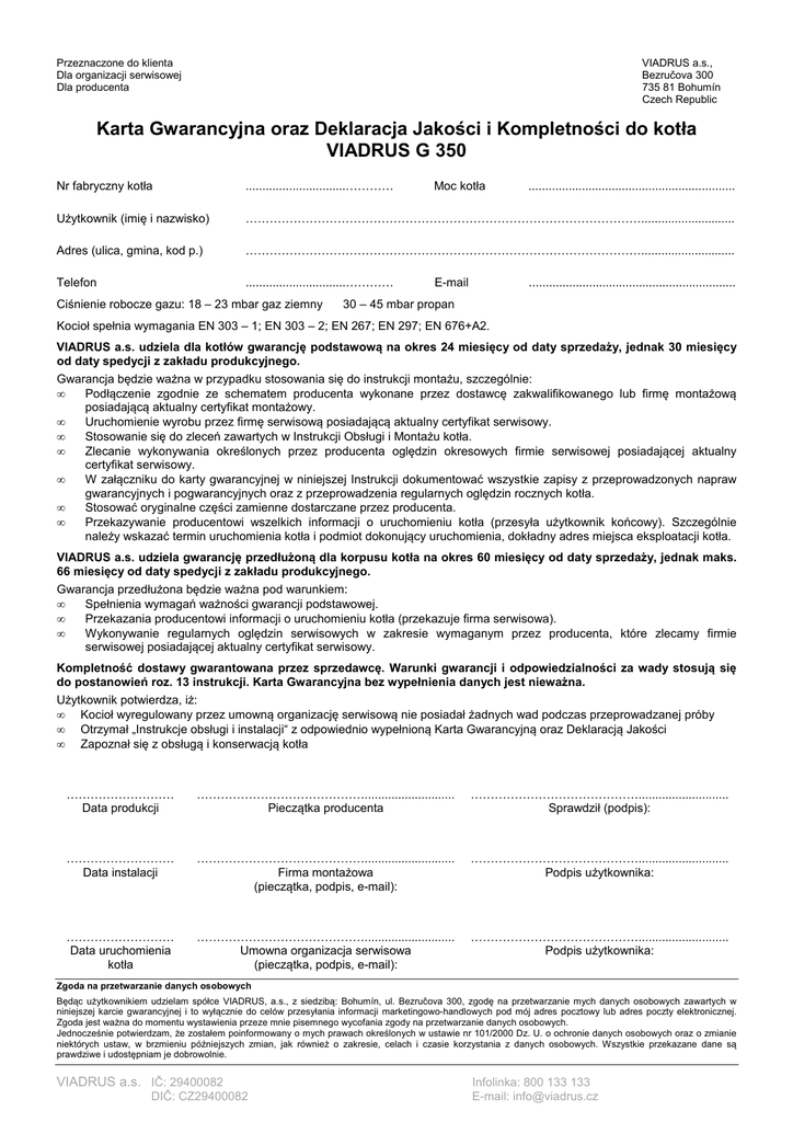 Przeznaczone do klienta Dla organizacji serwisowej Dla producenta VIADRUS a.s., Bezručova 300 735 81 Bohumín Czech Republic Karta Gwarancyjna oraz Deklaracja Jakości i Kompletności do kotła VIADRUS G 350 Nr fabryczny kotła ..............................………… Użytkownik (imię i nazwisko) ………………………………………………………………………………………............................ Adres (ulica, gmina, kod p.) ………………………………………………………………………………………............................ Telefon ..............................………… Ciśnienie robocze gazu: 18 – 23 mbar gaz ziemny Moc kotła E-mail .............................................................. .............................................................. 30 – 45 mbar propan Kocioł spełnia wymagania EN 303 – 1; EN 303 – 2; EN 267; EN 297; EN 676+A2. VIADRUS a.s. udziela dla kotłów gwarancję podstawową na okres 24 miesięcy od daty sprzedaży, jednak 30 miesięcy od daty spedycji z zakładu produkcyjnego. Gwarancja będzie ważna w przypadku stosowania się do instrukcji montażu, szczególnie: • Podłączenie zgodnie ze schematem producenta wykonane przez dostawcę zakwalifikowanego lub firmę montażową posiadającą aktualny certyfikat montażowy. • Uruchomienie wyrobu przez firmę serwisową posiadającą aktualny certyfikat serwisowy. • Stosowanie się do zleceń zawartych w Instrukcji Obsługi i Montażu kotła. • Zlecanie wykonywania określonych przez producenta oględzin okresowych firmie serwisowej posiadającej aktualny certyfikat serwisowy. • W załączniku do karty gwarancyjnej w niniejszej Instrukcji dokumentować wszystkie zapisy z przeprowadzonych napraw gwarancyjnych i pogwarancyjnych oraz z przeprowadzenia regularnych oględzin rocznych kotła. • Stosować oryginalne części zamienne dostarczane przez producenta. • Przekazywanie producentowi wszelkich informacji o uruchomieniu kotła (przesyła użytkownik końcowy). Szczególnie należy wskazać termin uruchomienia kotła i podmiot dokonujący uruchomienia, dokładny adres miejsca eksploatacji kotła. VIADRUS a.s. udziela gwarancję przedłużoną dla korpusu kotła na okres 60 miesięcy od daty sprzedaży, jednak maks. 66 miesięcy od daty spedycji z zakładu produkcyjnego. Gwarancja przedłużona będzie ważna pod warunkiem: • Spełnienia wymagań ważności gwarancji podstawowej. • Przekazania producentowi informacji o uruchomieniu kotła (przekazuje firma serwisowa). • Wykonywanie regularnych oględzin serwisowych w zakresie wymaganym przez producenta, które zlecamy firmie serwisowej posiadającej aktualny certyfikat serwisowy. Kompletność dostawy gwarantowana przez sprzedawcę. Warunki gwarancji i odpowiedzialności za wady stosują się do postanowień roz. 13 instrukcji. Karta Gwarancyjna bez wypełnienia danych jest nieważna. Użytkownik potwierdza, iż: • Kocioł wyregulowany przez umowną organizację serwisową nie posiadał żadnych wad podczas przeprowadzanej próby • Otrzymał „Instrukcje obsługi i instalacji“ z odpowiednio wypełnioną Karta Gwarancyjną oraz Deklaracją Jakości • Zapoznał się z obsługą i konserwacją kotła ……………………… Data produkcji ……………………………………........................... Pieczątka producenta ……………………………………........................... Sprawdził (podpis): ……………………… Data instalacji ……………………………………........................... Firma montażowa (pieczątka, podpis, e-mail): ……………………………………........................... Podpis użytkownika: ……………………… Data uruchomienia kotła ……………………………………........................... Umowna organizacja serwisowa (pieczątka, podpis, e-mail): ……………………………………........................... Podpis użytkownika: Zgoda na przetwarzanie danych osobowych Będąc użytkownikiem udzielam spółce VIADRUS, a.s., z siedzibą: Bohumín, ul. Bezručova 300, zgodę na przetwarzanie mych danych osobowych zawartych w niniejszej karcie gwarancyjnej i to wyłącznie do celów przesyłania informacji marketingowo-handlowych pod mój adres pocztowy lub adres poczty elektronicznej. Zgoda jest ważna do momentu wystawienia przeze mnie pisemnego wycofania zgody na przetwarzanie danych osobowych. Jednocześnie potwierdzam, że zostałem poinformowany o mych prawach określonych w ustawie nr 101/2000 Dz. U. o ochronie danych osobowych oraz o zmianie niektórych ustaw, w brzmieniu późniejszych zmian, jak również o zakresie, celach i czasie korzystania z danych osobowych. Wszystkie przekazane dane są prawdziwe i udostępniam je dobrowolnie. VIADRUS a.s. IČ: 29400082 DIČ: CZ29400082 Infolinka: 800 133 133 E-mail: [email protected]