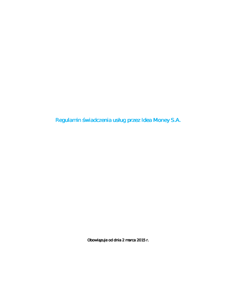 Regulamin świadczenia usług przez Idea Money S.A. Obowiązuje od dnia 2 marca 2015 r. SPIS TREŚCI CZĘŚĆ A POSTANOWIENIA WSPÓLNE Rozdział I. Postanowienia ogólne ................................................................ ................................................................................................ .................................................................................... .................................................... 4 § 1. Przepisy wstępne ..................................................................................................................................................... 4 § 2. Zabezpieczenia ......................................................................................................................................................... 8 § 3. Dane osobowe .......................................................................................................................................................... 8 § 4. Poufność Umowy ......................................................................................................................................................... 8 § 5. Przepisy ogólne ............................................................................................................................................................ 9 Rozdział II. Przedmiot Przedmiot Umowy ................................................................ ................................................................................................ .......................................................................................... .......................................................... 9 § 6. Przedmiot Umowy ................................................................................................................................................... 9 § 7. Przedmiot świadczenia Umowy i zakres obowiązków Faktora – Faktoring Globalny................................ 10 § 8. Oferowane rodzaje Faktoringu Dłużnego .......................................................................................................... 10 Rozdział III. Korzystanie z IdeaFaktor24 ................................................................ ................................................................................................ ......................................................................... ......................................... 11 § 9. Dostęp do IdeaFaktor24 ....................................................................................................................................... 11 § 10. Korzystanie z IdeaFaktor24 ................................................................................................................................. 11 § 11. Obowiązki Użytkownika ....................................................................................................................................... 12 § 12. Ograniczenia dostępu ........................................................................................................................................... 12 § 13. Odpowiedzialność .................................................................................................................................................. 13 § 14. Odpłatność .............................................................................................................................................................. 13 § 15. Reklamacje.............................................................................................................................................................. 13 Rozdział IV. Wynagrodzenie Idea Money ................................................................ ................................................................................................ ......................................................................... ......................................... 13 § 16. Prowizje i Opłaty ...................................................................................................................................................... 13 § 17. Odsetki za opóźnienie .............................................................................................................................................. 14 Rozdział V. Postanowienia dotyczące Regulaminu i Umowy ................................................................ ........................................................................ ........................................ 14 § 18. Zmiana Regulaminu i Umowy................................................................................................................................. 14 § 19. Wygaśnięcie Umowy ............................................................................................................................................... 15 CZĘŚĆ B POSTANOWIENIA DOTYCZĄCE USŁUG FAKTORINGOWYCH Rozdział VI. Nabywanie Wierzytelności i ich Finansowanie ................................................................ ........................................................................... ........................................... 16 § 20. Oświadczenia i zobowiązania Faktoranta ............................................................................................................ 16 § 21. Nabycie Wierzytelności w Faktoringu Globalnym ............................................................................................. 20 § 22. Finansowanie Wierzytelności w Faktoringu Globalnym ................................................................................... 20 § 23. Zasady Finansowania Wierzytelności w ramach Faktoringu Globalnego...................................................... 20 § 24. Zakres Finansowania Wierzytelności w ramach Faktoringu Dłużnego......................................................... 21 § 25. Finan