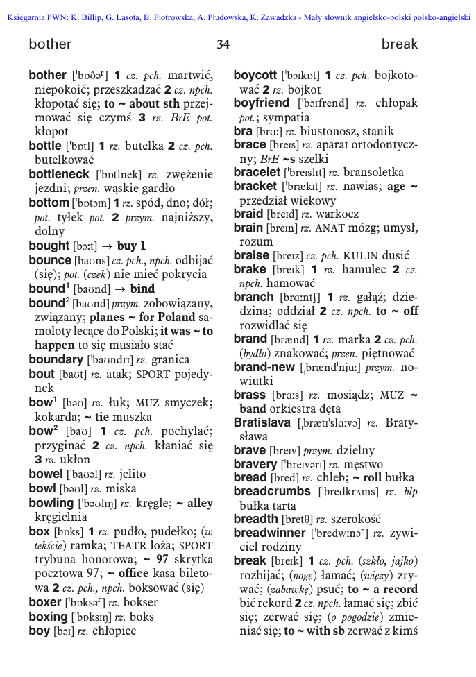 Księgarnia PWN: K. Billip, G. Lasota, B. Piotrowska, A. Płudowska, K. Zawadzka - Mały słownik angielsko-polski polsko-angielski bother bother [»b#+3r ] 1 cz. pch. martwić, niepokoić; przeszkadzać 2 cz. npch. kłopotać sie˛; to ~ about sth przejmować sie˛ czymś 3 rz. BrE pot. kłopot bottle [»b#tl] 1 rz. butelka 2 cz. pch. butelkować bottleneck [»b#tlnek] rz. zwe˛żenie jezdni; przen. wa˛skie gardło bottom [»b#t3m] 1 rz. spód, dno; dół; pot. tyłek pot. 2 przym. najniższy, dolny bought [b&ft] ? buy 1 bounce [baIns] cz. pch., npch. odbijać (sie˛); pot. (czek) nie mieć pokrycia bound1 [baInd] ? bind bound2 [baInd] przym. zobowia˛zany, zwia˛zany; planes ~ for Poland samoloty leca˛ce do Polski; it was ~ to happen to sie˛ musiało stać boundary [»baIndr=] rz. granica bout [baIt] rz. atak; SPORT pojedynek bow1 [b3I] rz. łuk; MUZ smyczek; kokarda; ~ tie muszka bow 2 [baI] 1 cz. pch. pochylać; przyginać 2 cz. npch. kłaniać sie˛ 3 rz. ukłon bowel [»baI3l] rz. jelito bowl [b3Il] rz. miska bowling [»b3Il=E] rz. kre˛gle; ~ alley kre˛gielnia box [b#ks] 1 rz. pudło, pudełko; (w tekście) ramka; TEATR loża; SPORT trybuna honorowa; ~ 97 skrytka pocztowa 97; ~ office kasa biletowa 2 cz. pch., npch. boksować (sie˛) boxer [»b#ks3r ] rz. bokser boxing [»b#ks=E] rz. boks boy [b&=] rz. chłopiec 34 break boycott [»b&=k#t] 1 cz. pch. bojkotować 2 rz. bojkot boyfriend [»b&=frend] rz. chłopak pot.; sympatia bra [br"f] rz. biustonosz, stanik brace [bre=s] rz. aparat ortodontyczny; BrE ~s szelki bracelet [»bre=sl=t] rz. bransoletka bracket [»brQk=t] rz. nawias; age ~ przedział wiekowy braid [bre=d] rz. warkocz brain [bre=n] rz. ANAT mózg; umysł, rozum braise [bre=z] cz. pch. KULIN dusić brake [bre=k] 1 rz. hamulec 2 cz. npch. hamować branch [br"fntR] 1 rz. gała˛ź; dziedzina; oddział 2 cz. npch. to ~ off rozwidlać sie˛ brand [brQnd] 1 rz. marka 2 cz. pch. (bydło) znakować; przen. pie˛tnować brand-new [«brQnd»njuf] przym. nowiutki brass [br"fs] rz. mosia˛dz; MUZ ~ band orkiestra de˛ta Bratislava [«brQt=»sl"fv3] rz. Bratysława brave [bre=v] przym. dzielny bravery [»bre=v3r=] rz. me˛stwo bread [bred] rz. chleb; ~ roll bułka breadcrumbs [»bredkrZms] rz. blp bułka tarta breadth [bretU] rz. szerokość breadwinner [»bredw=n3r ] rz. żywiciel rodziny break [bre=k] 1 cz. pch. (szkło, jajko) rozbijać; (noge˛) łamać; (wie˛zy) zrywać; (zabawke˛) psuć; to ~ a record bić rekord 2 cz. npch. łamać sie˛; zbić sie˛; zerwać sie˛; (o pogodzie) zmieniać sie˛; to ~ with sb zerwać z kimś breakdown 3 rz. przerwa, pauza r break down 1 cz. npch. (samochód) psuć sie˛; (osoba) załamywać sie˛ 2 cz. pch. wyłamywać r break in cz. npch. włamywać sie˛; wtra˛cać (sie˛); r break into cz. pch. to ~ into sth włamać sie˛ do czegoś r break off cz. npch., pch. odłamywać (sie˛), urywać (sie˛); (zare˛czyny) zrywać r break out cz. npch. (pożar) wybuchać; (burza) zrywać sie˛ r break up cz. npch. zrywać ze soba˛; (tłum) rozchodzić sie˛ breakdown [»bre=kdaIn] rz. TECHN awaria; MED załamanie nerwowe breakfast [»brekf3st] rz. śniadanie breakthrough [»bre=kUruf] rz. przełom breast [brest] rz. pierś breath [breU] rz. oddech; out of ~ bez tchu breathe [brif+] cz. pch., npch. oddychać r breathe in 1 cz. npch. robić wdech 2 cz. pch. wdychać r breathe out 1 cz. npch. robić wydech 2 cz. pch. wydychać bred [bred] ? breed 1, 2 breed [brifd] 1 cz. pch. hodować 2 cz. npch. rozmnażać sie˛ 3 rz. ZOOL rasa breeze [brifz] rz. wietrzyk brewery [»bruf3r=] rz. browar bribe [bra=b] 1 rz. łapówka 2 cz. pch. przekupywać brick [br=k] rz. cegła bricklayer [»br=kle=3r ] rz. murarz bride [bra=d] rz. panna młoda bridegroom [»bra=dgrufm] rz. pan młody bridesmaid [»bra=dzme=d] rz. druhna bridge [br=da] rz. most; przen. pomost; GRY brydż broken 35 brief [briff] 1 przym. krótki; zwie˛zły; in ~ krótko mówia˛c 2 cz. pch. informować; instruować 3 rz. BrE instrukcje; ~s majtki briefcase [»briffke=s] rz. teczka briefing [»briff=E] rz. odprawa briefly [»briffl=] przysł. zwie˛źle bright [bra=t] przym. jaskrawy; jasny; pogodny; bystry brighten [»bra=tn] cz. pch., npch. rozjaśniać (sie˛) brilliant [»br=l=3nt] przym. błyskotliwy; jaskrawy bring [br=E] cz. pch. przynosić, przywozić; to ~ sb along przyprowadzić kogoś r bring about cz. pch. powodować r bring down cz. pch. (dyktatora) obalać; (cene˛) obniżać r bring forward cz. pch. przyśpieszać r bring on cz. pch. wywoływać r bring out cz. pch. publikować, wydawać r bring round cz. pch. cucić r bring up cz. pch. (temat) poruszać; (dziecko) wychowywać Britain [»br=tn] ? Great Britain British [»br=t=R] przym. brytyjski; the ~ Brytyjczycy broad [br&fd] przym. szeroki, rozległy; (zarys) ogólny; ~ bean bób broadcast [»br&fdk"fst] 1 cz. pch., npch. nadawać 2 rz. program; audycja broaden [»br&fdn] cz. pch., npch. poszerzać (sie˛) broccoli [»br#k3l=] rz. brokuły brochure [»br3IR3r ] rz. folder broke1 [br3Ik] ? break 1, 2 broke2 [br3Ik] przym. pot. bez grosza pot. broken [»br3Ik3n] ? break 1, 2