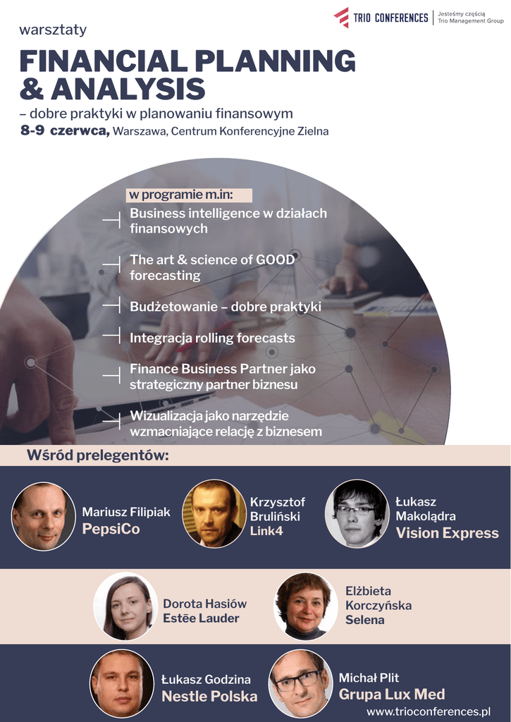 warsztaty FINANCIAL PLANNING & ANALYSIS – dobre praktyki w planowaniu finansowym 8-9 czerwca, Warszawa, Centrum Konferencyjne Zielna w programie m.in: Business intelligence w działach finansowych The art & science of GOOD forecasting Budżetowanie – dobre praktyki Integracja rolling forecasts Finance Business Partner jako strategiczny partner biznesu Wizualizacja jako narzędzie wzmacniające relację z biznesem Wśród prelegentów: Mariusz Filipiak PepsiCo Krzysztof Bruliński Link4 Dorota Hasiów Estee Lauder Łukasz Godzina Nestle Polska GOVERNANCE, CZYLI OD Łukasz Makolądra CZEGO ZACZĄĆ Vision Express Elżbieta Korczyńska Selena Michał Plit Grupa Lux Med www.trioconferences.pl Rozwój narzędzi business intelligence w działach finansowych to nie bez powodu jeden z najbardziej newralgicznych etapów podróży analitycznej organizacji. Transformacja działów finansowych w kierunku strategicznego partnera całego biznesu staje się faktem, a ilość czasu poświęcana na analizy w działach finansów rośnie z roku na rok. Wysiłki skupiają się na zwiększeniu trafności procesu prognozowania i śledzeniu tych elementów biznesu, które mają kluczowy wpływ na wynik finansowy. Warsztaty stanowią niepowtarzalną okazję, by sprawdzić jak wygląda planowanie finansowe w innych organizacjach, jakie są dobre praktyki związane z procesem budżetowania i prognozowania oraz jakie korzyści oferuje biznesowi finance business partnering. Wśród prowadzących ekspertów znajdziecie Państwo przedstawicieli firm: PepsiCo, Link4, Vision Express, Grupa LUX MED, Estee Lauder, Selena, Nestle Polska i inni: Do udziału zapraszamy przedstawicieli działów: financial planning&analysis finansów kontrolingu planowania i prognozowania W programie m.in.: Narzędzia business intelligence w działach finansowych Transformacja działu finansowego i jego nowa strategiczna funkcja Budżetowanie – cykl governance i integracja rolling forecasts Forecasting – jak stworzyć kulturę ciągłego prognozowania i doskonalić proces KPI &Financial performance Raportowanie i wizualizacja danych Serdecznie zapraszam do udziału! Marta Pawlikowska / Project Director kom. 519 047 625 [email protected] Dzień Pierwszy / 8 CZERWCA ŚRODA 9:30 Poranna kawa i rejestracja 10:00 Powitanie uczestników i rozpoczęcie warsztatów 10:00 BI w finansach vs. BI w biznesie – szersze spojrzenie na efektywne Business Intelligence w firmie Paweł Cieśla, Team Lider of Finance Business Intelligence Systems, ABB Group 10:45 Kalendarz budżetowania i planowania – planowanie w macierzowej strukturze grupy Kluczowe etapy procesu budżetowania; metody tworzenia założeń modelu Monitorowanie wyników: częstotliwość, kto i w jakim stopniu jest zaangażowany, kluczowe spotkania i ich agenda Słabe i mocne strony goverance cycle Ryzyka związane z procesem tradycyjnego budżetowania Automatyzacja&analytics - jak zredukować czas przygotowania budżetu, by poświęcić go na analizy Elżbieta Korczyńska, Dyrektor Działu Skarbca, Selena 11:45 The art & science of GOOD forecasting Zasady efektywnego procesu prognozowania - planning cycle Jak wykorzystać BIG Data do wzmocnienia prognozowania ? Prognozowanie długo - i krótkoterminowe Driver based planning – jak to podejście wspiera proces prognozowania Forecast decision support system - jak ustawić proces: standardy, ludzie i narzędzia, by sprzyjał kulturze ciągłego doskonalenia precyzyjności prognozowania Mariusz Filipiak, Headquarter Business Unit Planning Manager Europe&Africa, PepsiCo 12:30 Integracja Rolling Forecasts Kiedy warto rozważyć wykorzystanie RF 5 głównych zasad RF Kultura ciągłego planowania (Continous resource allocation/ relative performance targets) Rolling Forecasting vs. Budgeting Forecasts vs targets – jak wykorzystać prognozy do wyznaczenia konstruktywnych celów Case study Dorota Hasiów, Business Manager, Estee Lauder 14:00 Pricing – klucz do budowy wartości Cena jako kluczowy element budowania wartości Zintegrowane podejście do zarządzania cenami (Dynamika rynkowa->Wartość dlaKlienta->Transakcja) Narzędzia analityczne i wdrożeniowe Łukasz Makolądra, Finance Manager, Vision Express 15:00 Zakończenie I dnia warsztatów Dzień Drugi / 9 CZERWCA CZWARTEK 10:00 Finance Business Partner jako Strategiczny Doradca Biznesu Idea business partneringu – dostarczanie finansowych insightów, wskazywanie kierunków poprawy wyników, optymalizacja okazji biznesowych Analizy finansowe jako baza podejmowania decyzji biznesowych Korzyści i potencjalne zagrożenia Best practices Krzysztof Bruliński, FP&A Director, Link4 10:45 Finance transformation 2.0 – strategiczna rola działu finansów Nowy model operacyjny działu finansów - rosnące wymagania względem wiedzy i kompetencji Rola zintegrowanej architektury informacji Planowanie strategiczne w kontekście FP&A Zgodność planów operacyjnych ze strategią Case study 11:45 Key Performance Indicators & Financial Performance Dobór właściwych wskaźników do analiz (znaczący wpływ na biznes, dające się kontrolować i regularnie mierzone) Balans scorecared, lean six sigma, rozwiązania własne – które podejście wybrać Integracja danych i spójny widok na biznes na wszystkich raportujących poziomach Case study Michał Plit,Dyrektor Departamentu Analiz Strategicznych, LUX-MED 12:30 ‘A co jeśli’ – analiza scenariuszy jako strategiczne narzędzie wspomagające planowanie Co oferuje analiza scenariuszy Przewidywanie jako support procesu prognozowania Wartość dodana z continous foresight Case study 14:00 Raportowanie i wizualizacja danych Od data reporting do data analytics&results Raportowanie finansowe: data governance and control Raportowanie dla top managementu – dobre praktyki Jak wykorzystać wizualizację, by uwypuklić kluczowe dane Storytelling – wartość dodana w prezentacji danych Next Generation Reporting Management Solutions & Online Repor