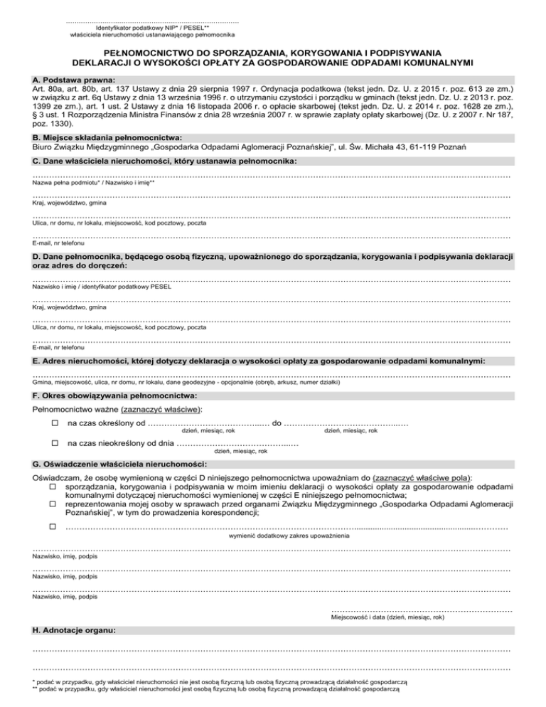 ……………………………………………………………………… Identyfikator podatkowy NIP* / PESEL** właściciela nieruchomości ustanawiającego pełnomocnika PEŁNOMOCNICTWO DO SPORZĄDZANIA, KORYGOWANIA I PODPISYWANIA DEKLARACJI O WYSOKOŚCI OPŁATY ZA GOSPODAROWANIE ODPADAMI KOMUNALNYMI A. Podstawa prawna: Art. 80a, art. 80b, art. 137 Ustawy z dnia 29 sierpnia 1997 r. Ordynacja podatkowa (tekst jedn. Dz. U. z 2015 r. poz. 613 ze zm.) w związku z art. 6q Ustawy z dnia 13 września 1996 r. o utrzymaniu czystości i porządku w gminach (tekst jedn. Dz. U. z 2013 r. poz. 1399 ze zm.), art. 1 ust. 2 Ustawy z dnia 16 listopada 2006 r. o opłacie skarbowej (tekst jedn. Dz. U. z 2014 r. poz. 1628 ze zm.), § 3 ust. 1 Rozporządzenia Ministra Finansów z dnia 28 września 2007 r. w sprawie zapłaty opłaty skarbowej (Dz. U. z 2007 r. Nr 187, poz. 1330). B. Miejsce składania pełnomocnictwa: Biuro Związku Międzygminnego „Gospodarka Odpadami Aglomeracji Poznańskiej”, ul. Św. Michała 43, 61-119 Poznań C. Dane właściciela nieruchomości, który ustanawia pełnomocnika: ………………………………………………………………………………………………………………………………………………………… Nazwa pełna podmiotu* / Nazwisko i imię** ………………………………………………………………………………………………………………………………………………………… Kraj, województwo, gmina ………………………………………………………………………………………………………………………………………………………… Ulica, nr domu, nr lokalu, miejscowość, kod pocztowy, poczta ………………………………………………………………………………………………………………………………………………………… E-mail, nr telefonu D. Dane pełnomocnika, będącego osobą fizyczną, upoważnionego do sporządzania, korygowania i podpisywania deklaracji oraz adres do doręczeń: ………………………………………………………………………………………………………………………………………………………… Nazwisko i imię / identyfikator podatkowy PESEL ………………………………………………………………………………………………………………………………………………………… Kraj, województwo, gmina ………………………………………………………………………………………………………………………………………………………… Ulica, nr domu, nr lokalu, miejscowość, kod pocztowy, poczta ………………………………………………………………………………………………………………………………………………………… E-mail, nr telefonu E. Adres nieruchomości, której dotyczy deklaracja o wysokości opłaty za gospodarowanie odpadami komunalnymi: ………………………………………………………………………………………………………………………………………………………… Gmina, miejscowość, ulica, nr domu, nr lokalu, dane geodezyjne - opcjonalnie (obręb, arkusz, numer działki) F. Okres obowiązywania pełnomocnictwa: Pełnomocnictwo ważne (zaznaczyć właściwe): na czas określony od …………………………………...… do …………………………………...…. dzień, miesiąc, rok dzień, miesiąc, rok na czas nieokreślony od dnia …………………………………...… dzień, miesiąc, rok G. Oświadczenie właściciela nieruchomości: Oświadczam, że osobę wymienioną w części D niniejszego pełnomocnictwa upoważniam do (zaznaczyć właściwe pola): sporządzania, korygowania i podpisywania w moim imieniu deklaracji o wysokości opłaty za gospodarowanie odpadami komunalnymi dotyczącej nieruchomości wymienionej w części E niniejszego pełnomocnictwa; reprezentowania mojej osoby w sprawach przed organami Związku Międzygminnego „Gospodarka Odpadami Aglomeracji Poznańskiej”, w tym do prowadzenia korespondencji; …………………………………………………………………………………………….....................................................………… . wymienić dodatkowy zakres upoważnienia ………………………………………………………………………………………………………………………………………………………… Nazwisko, imię, podpis ………………………………………………………………………………………………………………………………………………………… Nazwisko, imię, podpis ………………………………………………………………………………………………………………………………………………………… Nazwisko, imię, podpis ………………………………………………………… Miejscowość i data (dzień, miesiąc, rok) H. Adnotacje organu: ………………………………………………………………………………………………………………………………………………………… ………………………………………………………………………………………………………………………………………………………… * podać w przypadku, gdy właściciel nieruchomości nie jest osobą fizyczną lub osobą fizyczną prowadzącą działalność gospodarczą ** podać w przypadku, gdy właściciel nieruchomości jest osobą fizyczną lub osobą fizyczną prowadzącą działalność gospodarczą I. Załączniki: ……………………………………………………………………………………………………………………………
