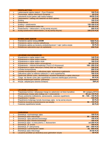 1 2 3 4 5 6 7 8 9 10 PROFILAKTYKA Lakierowanie zębów stałych - Fluor Protector Fluoryzacja zębów mlecznych Duraphat Lakowanie bruzd (jeden ząb/ każdy kolejny) Lapisowanie 1 zabieg (nie zależnie od ilości zębów) Scaling Piaskowanie Scaling + piaskowanie Scaling + piaskowanie jeden łuk Piaskowanie + lakierowani ( na tej samej wizycie) Scalig+piaskowani+lakierowanie ( na tej samej wizycie) 2 3 4 WYBIELANIE ZĘBÓW Wybielenie zębów lampą ZOOM Wybielanie zębów metodą nakładkową Wybielanie zębów po leczeniu endodontycznym 1 ząb / jedna wizyta Dodatkowe wykonanie szyn do wybielania 1 2 3 4 5 6 7 8 9 10 11 12 13 LECZENIE ZACHOWAWCZE Wypełnienie w zębie stałym małe Wypełnienie w zębie stałym średnie Wypełnienie w zębie stałym duże Wypełnienie w zębie stałym przyszyjkowe Wypełnienie – metoda kanapkowa ( Fuji II LC+Kompozyt) Wypełnienie w zębie mlecznym (Twinky Star lub Triage) Licówka kompozytową Licówka kompozytową z odbudową zęba wykonana w gabinecie Odbudowa zęba na włóknie szklanym (+ cena wypełnienia) Opatrunek (tlenek cynku, dewitalizacja, leczenie kanałowe) w zębie mlecznym Triage lub tlenek cynku jako wypełnienie czasowe stabilizujące próchnicę Wizyta adaptacyjna dziecka (pierwsza) Wizyta adaptacyjna dziecka (kolejna) 1 2 3 4 5 6 7 LECZENIE KANAŁOWE Trepanacja komory i ektyrpacja miazgi (w zależności od ilości kanałów) Dewitalizacja miazgi zęba stałego ew + znieczulenie Wizyty pośrednie (odkażenie, opracowanie, czasowe wypełnieni) Wypełnienie 1 kanału Wypełnienie kolejnego kanału leczonego zęba na tej samej wizycie Powtórne leczenia endodontyczne (za wizytę) Czasowe wypełnienie kanału 1 2 3 4 5 6 7 8 9 10 CHIRURGIA Ekstrakcja rozchwianego zęba Ekstrakcja zęba mlecznego Ekstrakcja zęba jednokorzeniowego Ekstrakcja zęba wielokorzeniowego Ekstrakcja zęba w znieczuleniu z dłutowaniem Ekstrakcja „8” prosta Ekstrakcja „8” zatrzymanej Ekstrakcja z zamknięciem zatoki Ekstrakcja zęba mlecznego Leczenie powikłań po ekstrakcji poza gabinetem wizyta 1 100 PLN 60 PLN 60/50 PLN 50 PLN 100 PLN 100 PLN 150-180 PLN 90-100 PLN 200 PLN 240-270 PLN 1000 PLN 650 PLN 50 PLN 250 PLN 140 PLN 150 PLN 160 PLN 90-120 PLN 160– 200 PLN 100 PLN 200 PLN 250 PLN 180 PLN 50 PLN 80 PLN bezpłatna 50PLN 80+ następny 20 PLN 80 ew.+20 PLN 50 – 100 – 150 PLN 100 PLN 80 PLN 50 – 150 PLN 80 PLN 100 PLN 80 – 100 PLN 150 PLN 180 PLN od 200 PLN 180 PLN 300 – 500 PLN ok. 500 PLN 30-50 PLN 40 PLN 11 12 Korekta wędzidełka Konsultacja chirurgiczna 1 2 3 4 5 6 7 8 9 10 11 12 13 14 15 16 17 18 19 LECZENIE PROTETYCZNE Korekta protezy wykonanej w gabinecie Korona akrylowa-tymczasowa wykonana w gabinecie Most tymczasowy wykonany w gabinecie ( za 1 pkt) Korona akrylowa-tymczasowa wykonana w pracowni Most tymczasowy wykonany w pracowni ( za 1 pkt) Korona akrylowa Korona porcelanowa na stali Most porcelanowy na stali (za 1 pkt) Korona porcelanowa cyrkonowa Wkład koronowo-korzeniowy pojedynczy Wkład koronowo-korzeniowy składany Wkład koronowo-korzeniowy z włokna szklanego jeden kanał Wkład koronowo-korzeniowy z włokna szklanego dwa trzy kanały Proteza akrylowa częściowa (liczone od punktu) Proteza akrylowa (całkowite bezzębie) jeden łuk Proteza akrylowa (całkowite bezzębie) dwa łuki Proteza acetalowa Klamra w protezie acetalowej w kolorze innym niż płyta lub naprawa Proteza szkieletowa 1 2 3 4 5 6 7 8 IMPLANTOLOGIA Wszczepienie implantu Nobel Biocare, Wszczepienie implantu Alpha Bio, Adin Założenie łącznika (standardowy) Nobel Biocare Łącznik indywidualny tytanowy Łącznik indywidualny porcelanowy Korona cyrkonowa Nobel Biocara Korona na imlancie Alpha Bio, Adin Konsultacja implantologiczna 1 2 3 4 5 6 7 8 9 10 11 12 13 14 15 16 17 1 ORTODONCJA Aparaty Stałe Konsultacja Wykonanie modeli diagnostycznych Ustalenie planu leczenia Aparat stały metalowy 1 łuk Aparat stały porcelanowy 1 łuk Wizyta kontrolna aparat metalowy 1 łuk Wizyta kontrolna aparat metalowy 2 łuk Wizyta kontrolna aparat porcelanowy 1 łuk Wizyta kontrolna aparat porcelanowy 2 łuk Wymiana lidatur Założennie separacja Naklejenie odklejonego zamka Płytka retencyjna Łuk podniebienny Hyrax Zdjęcie aparatu po leczenieu 1 łuk Reteiner stały Aparaty Ruchome Konsultacja i wizyty kontrolne 150 PLN 50 PLN bezpłatnie 50 PLN 40 PLN 150 PLN 100 PLN 280 PLN 650 PLN 650 PLN 1600 PLN 300 PLN 400 PLN 200 PLN 300 PLN 60 PLN 1000 PLN 1800 PLN 1300 PLN 150 PLN 1250 PLN 3000-3500 PLN 2000 PLN 1700 PLN 2000 PLN 2500 PLN 1800 PLN 2000 PLN 70 PLN 100 PLN 100 PLN 150 PLN 1400 PLN 2400 PLN 150 PLN 180 PLN 170 PLN 200 PLN 60 PLN 60 PLN 70 PLN 380 PLN 200-300 PLN 650 PLN 100 PLN 150-250 PLN 70 PLN 2 3 4 5 6 7 8 9 1 2 3 4 5 6 7 8 9 10 11 12 Płytka Schwrza Aparat blokowy Aparat Klamta Aparat Twin Block Aparat elastyczny Stockfish Kolorowana płyta aparatu Dodatkowe elementy (zapora, wał, sprężyny) Pudełko na aparat ruchomy DODATKI RTG RTG x 2 Pantomogram pacjent gabinetu bądź z naszym skierowaniem Pantomogram pacjent z zewnątrz Zdjęcie cefalometryczne pacjent gabinetu bądź z naszym skierowaniem Zdjęcie cefalometryczne pacjent z zewnątrz Znieczulenie Znieczulenie przewodowe Badanie jamy ustnej + porada ( pacjent nowy) Badanie jamy ustnej + porada ( pacjent stały) Recepta Pobranie wymazu z kieszonek + antybiogram 550 PLN 660 PLN 720 PLN 1200 PLN 1200 PLN 70 PLN 50 PLN 10 PLN 30 PLN 40 PLN 80 PLN 90 PLN 80 PLN 90 PLN 20 PLN 30 PLN 50 PLN bezpłatnie 30 PLN 200 PLN