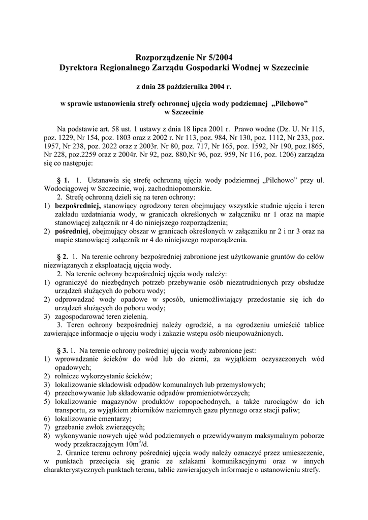 Rozporządzenie Nr 5/2004 Dyrektora Regionalnego Zarządu Gospodarki Wodnej w Szczecinie z dnia 28 października 2004 r. w sprawie ustanowienia strefy ochronnej ujęcia wody podziemnej „Pilchowo” w Szczecinie Na podstawie art. 58 ust. 1 ustawy z dnia 18 lipca 2001 r. Prawo wodne (Dz. U. Nr 115, poz. 1229, Nr 154, poz. 1803 oraz z 2002 r. Nr 113, poz. 984, Nr 130, poz. 1112, Nr 233, poz. 1957, Nr 238, poz. 2022 oraz z 2003r. Nr 80, poz. 717, Nr 165, poz. 1592, Nr 190, poz.1865, Nr 228, poz.2259 oraz z 2004r. Nr 92, poz. 880,Nr 96, poz. 959, Nr 116, poz. 1206) zarządza się co następuje: § 1. 1. Ustanawia się strefę ochronną ujęcia wody podziemnej „Pilchowo” przy ul. Wodociągowej w Szczecinie, woj. zachodniopomorskie. 2. Strefę ochronną dzieli się na teren ochrony: 1) bezpośredniej, stanowiący ogrodzony teren obejmujący wszystkie studnie ujęcia i teren zakładu uzdatniania wody, w granicach określonych w załączniku nr 1 oraz na mapie stanowiącej załącznik nr 4 do niniejszego rozporządzenia; 2) pośredniej, obejmujący obszar w granicach określonych w załączniku nr 2 i nr 3 oraz na mapie stanowiącej załącznik nr 4 do niniejszego rozporządzenia. § 2. 1. Na terenie ochrony bezpośredniej zabronione jest użytkowanie gruntów do celów niezwiązanych z eksploatacją ujęcia wody. 2. Na terenie ochrony bezpośredniej ujęcia wody należy: 1) ograniczyć do niezbędnych potrzeb przebywanie osób niezatrudnionych przy obsłudze urządzeń służących do poboru wody; 2) odprowadzać wody opadowe w sposób, uniemożliwiający przedostanie się ich do urządzeń służących do poboru wody; 3) zagospodarować teren zielenią. 3. Teren ochrony bezpośredniej należy ogrodzić, a na ogrodzeniu umieścić tablice zawierające informacje o ujęciu wody i zakazie wstępu osób nieupoważnionych. § 3. 1. Na terenie ochrony pośredniej ujęcia wody zabronione jest: 1) wprowadzanie ścieków do wód lub do ziemi, za wyjątkiem oczyszczonych wód opadowych; 2) rolnicze wykorzystanie ścieków; 3) lokalizowanie składowisk odpadów komunalnych lub przemysłowych; 4) przechowywanie lub składowanie odpadów promieniotwórczych; 5) lokalizowanie magazynów produktów ropopochodnych, a także rurociągów do ich transportu, za wyjątkiem zbiorników naziemnych gazu płynnego oraz stacji paliw; 6) lokalizowanie cmentarzy; 7) grzebanie zwłok zwierzęcych; 8) wykonywanie nowych ujęć wód podziemnych o przewidywanym maksymalnym poborze wody przekraczającym 10m3/d. 2. Granice terenu ochrony pośredniej ujęcia wody należy oznaczyć przez umieszczenie, w punktach przecięcia się granic ze szlakami komunikacyjnymi oraz w innych charakterystycznych punktach terenu, tablic zawierających informacje o ustanowieniu strefy. § 4. Traci moc rozporządzenie Nr 1/2002 Dyrektora Regionalnego Zarządu Gospodarki Wodnej w Szczecinie z dnia 08 października 2002r. w sprawie ustanowienia strefy ochronnej ujęcia wody podziemnej „Pilchowo” w Szczecinie, woj. zachodniopomorskie (Dz.U.Woj.Zach. Nr 73, poz. 1513). § 5. Rozporządzenie wchodzi w życie po upływie 14 dni od dnia ogłoszenia w Dzienniku Urzędowym Województwa Zachodniopomorskiego. UZASADNIENIE do Rozporządzenia nr 5/2004 Dyrektora Regionalnego Zarządu Gospodarki Wodnej w Szczecinie z dnia 28 października 2004 r. w sprawie ustanowienia strefy ochronnej ujęcia wody podziemnej „Pilchowo” w Szczecinie. Podstawą do wydania ww. rozporządzenia jest, zgodnie z art. 58 ust. 1 ustawy z dnia 18 lipca 2001 r. Prawo wodne (Dz. U. Nr 115, poz. 1229 z późn. zm.), wniosek właściciela ujęcia wody podziemnej „Pilchowo” w Szczecinie o dokonanie zmian w rozporządzeniu Dyrektora Regionalnego Zarządu Gospodarki Wodnej w Szczecinie z dnia 8 października 2002 r. w sprawie ustanowienia strefy ochronnej ujęcia wody podziemnej „Pilchowo” w Szczecinie, woj. zachodniopomorskie (Dz. U. Woj. Zach. Nr 73, poz. 1513). Powodem opracowania wniosku o dokonanie zmian w rozporządzeniu są: uwagi Ministra Środowiska wynikające z przeprowadzonej kontroli aktów prawa miejscowego ustanowionych przez wojewodę i organy administracji niezespolonej wyrażone w piśmie skierowanym do Dyrektora RZGW w Szczecinie z dnia 29.04.2004 r. (znak: DP-2178/03/GD). Uwagi te dotyczą zakazów i ograniczeń zapisanych w § 2 i 3 Rozporządzenia nr 1 Dyrektora RZGW w Szczecinie z dnia 08.10.2002 r. w sprawie ustanowienia strefy ochronnej ujęcia wody podziemnej „Pilchowo” w Szczecinie. Uwagi te uwzględniono w punkcie V. wniosku, gdzie zaproponowano nowe brzmienie zakazów, nakazów i ograniczeń obowiązujących w strefie ochronnej. Stosownie dokonano zmian zapisów zarówno dotyczących terenu ochrony bezpośredniej jak i pośredniej ujęcia wód podziemnych „Pilchowo” w Szczecinie; uwagi Ministerstwa Środowiska wynikające z przeprowadzonej kontroli innych aktów prawa miejscowego, jakimi są rozporządzenia dyrektora regionalnego zarządu gospodarki wodnej dotyczące ustanawiania stref ochronnych ujęć. Sugestie i wskazówki organu kontrolującego zostały uwzględnione przy zmianie przedmiotowego rozporządzenia; pismo z dnia 23.07.2004 r. Zachodniopomorskiego Zarządu Dróg Wojewódzkich w Koszalinie skierowane do ZWiK w Szczecinie z prośbą o rozważenie możliwości spowodowania zmiany zapisów w rozporządzeniu Dyrektora Regionalnego Zarządu Gospodarki Wodnej w Szczecinie z dnia 8 października 2002 r. w sprawie ustanowienia strefy ochronnej ujęcia wody podziemnej „Pilchowo” w Szczecinie, woj. zachodniopomorskie (Dz. U. Woj. Zach. Nr 73, poz. 1513) w § 3 ust. 1, tiret 1, który dotyczy zakazu wprowadzania ścieków do wód i do ziemi. Nie ulegają zmianie podstawowe dokumenty, na podstawie których opracowano pierwotny wniosek : − „Dokumentacja stref ochronnych komunalnego ujęcia wody podziemnej „Pilchowo”, opracowana przez firmę projektowo-budowlaną „AR – Tech”. 2001 r; -1− „Dodatek do dokumentacji h