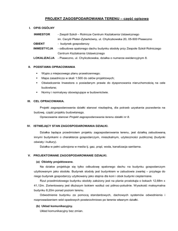PROJEKT ZAGOSPODAROWANIA TERENU – część opisowa I. OPIS OGÓLNY INWESTOR - Zespół Szkół – Rolnicze Centrum Kształcenia Ustawicznego im. Cecylii Plater-Zyberkówny, ul. Chyliczkowska 20, 05-500 Piaseczno OBIEKT - budynek gospodarczy INWESTYCJA - odbudowa spalonego dachu budynku stodoły przy Zespole Szkół Rolniczego Centrum Kształcenia Ustawicznego LOKALIZACJA - Piaseczno, ul. Chyliczkowska, działka o numerze ewidencyjnym 8. II. PODSTAWA OPRACOWANIA § Wypis z miejscowego planu przestrzennego; § Mapa zasadnicza w skali 1:500 do celów projektowych; § Oświadczenie Inwestora o posiadanym prawie do dysponowania nieruchomością na cele budowlane; § Normy i normatywy obowiązujące w budownictwie. III. CEL OPRACOWANIA. Projekt zagospodarowania działki stanowi niezbędną, dla potrzeb uzyskania pozwolenia na budowę, część projektu budowlanego. Opracowanie stanowi Projekt zagospodarowania terenu działki nr 8. IV. ISTNIEJĄCY STAN ZAGOSPODAROWANIA DZIAŁKI. Działka będąca przedmiotem projektu zagospodarowania terenu, jest działką zabudowaną innymi budynkami o charakterze gospodarczym, mieszkalnym, użyteczności publicznej (budynki oświaty i kultury). Działka w pełni uzbrojona w media tj. gaz, prąd, woda, kanalizacja sanitarna. V. PROJEKTOWANE ZAGOSPODAROWANIE DZIAŁKI. (a) Obiekty projektowane. Na działce projektuje się tylko odbudowę spalonego dachu na budynku gospodarczym użytkowanym jako stodoła. Budynek stodoły jest budynkiem w zabudowie zwartej – przylega do niego budynek gospodarczy użytkowany jako stajnia dla koni i obok budynki cieplarniane. Rzut przedmiotowego budynku stodoły założony jest na planie prostokąta o bokach 12,68m x 41,12m. Zorientowany jest dłuższym bokiem wzdłuż osi północ-południe. Wysokość maksymalna budynku 8,20m ponad poziom terenu. Odwodnienie budynku za pomocą standardowych, dachowych systemów odwodnienia i rozprowadzeniem wód opadowych powierzchniowo po terenie własnym działki. (b) Układ komunikacyjny. Układ komunikacyjny bez zmian. (c) Elementy istniejącej zieleni. Działka jest zadrzewiona. Na terenie działki znajduje się zieleń niska, średnia i wysoka, głównie liściasta – teren parku miejskiego. Odbudowa spalonego dachu nie ingeruje w istniejący drzewostan. (d) Ogrodzenie. Na terenie działki istnieją ogrodzenia poszczególnych terenów w zależności od użytkowania. Teren przedmiotowego budynku i jemu przyległych (stajnia, budynki cieplarni) ogrodzone są siatką stalową. Pozostały teren częściowo ogrodzony, częściowo otwarty. (e) Infrastruktura techniczna. Działka nr 8 w pełni uzbrojona w media. (f) Droga pożarowa. Do projektowanego budynku zapewniony jest dojazd przeciwpożarowy o szerokości min. 4,0m od strony drogi publicznej – ul. Chyliczkowska i Armii Krajowej. VI. ZESTAWIENIE POWIERZCHNI POSZCZEGÓLNYCH CZĘŚCI ZAGOSPODAROWANIA DZIAŁKI. Odbudowa spalonego dachu na budynku gospodarczym (stodoły) w żaden sposób nie zmieni istniejącego bilansu terenu i jego wskaźników intensywności zabudowy !!! VII. INFORMACJA O TERENIE DZIAŁKI. Teren działki płaski, zadrzewiony, częściowo ogrodzony. Średnia rzędna wysokości terenu 102,0÷102,5m.n.p.m Teren działki na którym projektuje się nowy dach na budynku stodoły, leży poza strefą ochrony urbanistycznej i konserwatorskiej, będącej przedmiotem ochrony ze względu na zasoby archeologiczne. Teren podlegający budowie znajduje się w strefie przeznaczonym pod zieleń miejską – parkową. VIII. DANE OKREŚLAJĄCE WPŁYW EKSPLOATACJI GÓRNICZEJ. Teren działki 6 nie znajduje się na terenach objętych oddziaływaniem szkód i eksploatacji górniczych. IX. INFORMACJE I DANE O PRZEWIDYWANYCH ZAGROŻENIACH DLA ŚRODOWISKA ORAZ HIGIENY I ZDROWIA UŻYTKOWNIKÓW OBIEKTÓW. Nie przewiduje się negatywnego wpływu na środowisko projektowanej inwestycji w fazie wykonawstwa i eksploatacji. Teren przedmiotowej inwestycji nie jest objęty jest formą ochrony przyrody. Projektowany nowy dach na budynku stodoły nie będzie stwarzać zanieczyszczenia powietrza, wody i gleby oraz stwarzać uciążliwości powodowane przez hałas, wibracje i zakłócenia elektryczne. Projektowany budynek zgodnie z Rozporządzeniem Rady Ministrów z dnia 9 listopada 2004r., w sprawie określenia rodzaju przedsięwzięć do sporządzenia raportu o oddziaływaniu na środowisko (Dz. U. Nr 257/04, poz. 2573) nie zalicza się do grupy przedsięwzięć, dla których sporządzanie raportu jest wymagane. Budowa dachu na budynku stodoły nie wymaga uzyskiwania decyzji o środowiskowych uwarunkowaniach. X. INNE DANE. Podczas realizacji planu zagospodarowania działki nr 8 należy przestrzegać przepisów BHP. Prace budowlane związane z wznoszeniem dachu na budynku należy prowadzić pod nadzorem osób posiadających odpowiedzenie uprawnienia budowlane do kierowania robotami w budownictwie. Projektant : ............................................. Sprawdzający: ............................................