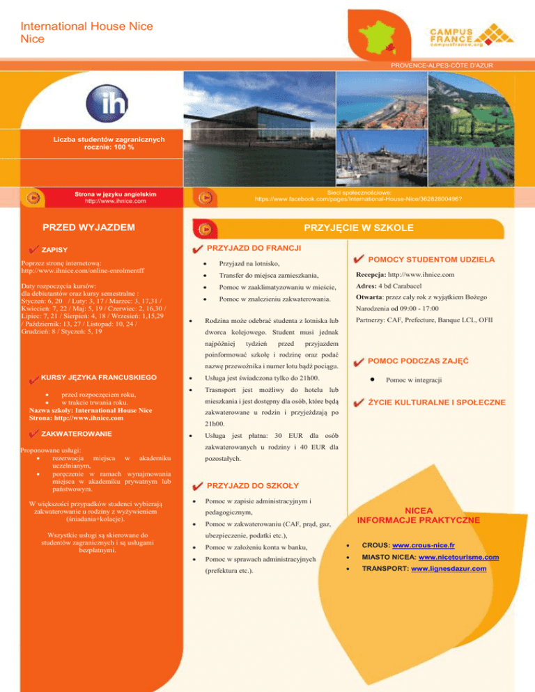 International House Nice Nice PROVENCE-ALPES-CÔTE D’AZUR Liczba studentów zagranicznych rocznie: 100 % Sieci społecznościowe: https://www.facebook.com/pages/International-House-Nice/36282800496? Strona w języku angielskim http://www.ihnice.com PRZYJĘCIE W SZKOLE PRZED WYJAZDEM PRZYJAZD DO FRANCJI ZAPISY POMOCY STUDENTOM UDZIELA Poprzez stronę internetową: http://www.ihnice.com/online-enrolmentff Przyjazd na lotnisko, Transfer do miejsca zamieszkania, Recepcja: http://www.ihnice.com Daty rozpoczęcia kursów: dla debiutantów oraz kursy semestralne : Styczeń: 6, 20 / Luty: 3, 17 / Marzec: 3, 17,31 / Kwiecień: 7, 22 / Maj: 5, 19 / Czerwiec: 2, 16,30 / Lipiec: 7, 21 / Sierpień: 4, 18 / Wrzesień: 1,15,29 / Październik: 13, 27 / Listopad: 10, 24 / Grudzień: 8 / Styczeń: 5, 19 Pomoc w zaaklimatyzowaniu w mieście, Adres: 4 bd Carabacel Pomoc w znalezieniu zakwaterowania. Otwarta: przez cały rok z wyjątkiem Bożego Narodzenia od 09:00 - 17:00 Rodzina może odebrać studenta z lotniska lub Partnerzy: CAF, Prefecture, Banque LCL, OFII dworca kolejowego. Student musi jednak najpóźniej tydzień przed przyjazdem poinformować szkołę i rodzinę oraz podać POMOC PODCZAS ZAJĘĆ nazwę przewoźnika i numer lotu bądź pociągu. KURSY JĘZYKA FRANCUSKIEGO przed rozpoczęciem roku, w trakcie trwania roku. Nazwa szkoły: International House Nice Strona: http://www.ihnice.com Usługa jest świadczona tylko do 21h00. Trasnsport jest możliwy do hotelu lub mieszkania i jest dostępny dla osób, które będą Pomoc w integracji ŻYCIE KULTURALNE I SPOŁECZNE zakwaterowane u rodzin i przyjeżdzają po 21h00. ZAKWATEROWANIE Usługa jest płatna: 30 EUR dla osób zakwaterowanych u rodziny i 40 EUR dla Proponowane usługi: rezerwacja miejsca w akademiku uczelnianym, poręczenie w ramach wynajmowania miejsca w akademiku prywatnym lub państwowym. W większości przypadków studenci wybierają zakwaterowanie u rodziny z wyżywieniem (śniadania+kolacje). Wszystkie usługi są skierowane do studentów zagranicznych i są usługami bezpłatnymi. pozostałych. PRZYJAZD DO SZKOŁY Pomoc w zapisie administracyjnym i NICEA INFORMACJE PRAKTYCZNE pedagogicznym, Pomoc w zakwaterowaniu (CAF, prąd, gaz, ubezpieczenie, podatki etc.), Pomoc w założeniu konta w banku, CROUS: www.crous-nice.fr Pomoc w sprawach administracyjnych MIASTO NICEA: www.nicetourisme.com (prefektura etc.). TRANSPORT: www.lignesdazur.com