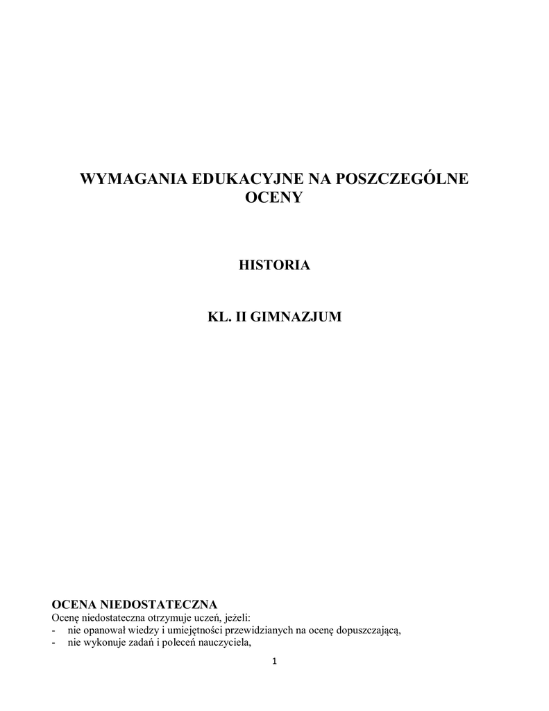 WYMAGANIA EDUKACYJNE NA POSZCZEGÓLNE OCENY HISTORIA KL. II GIMNAZJUM OCENA NIEDOSTATECZNA Ocenę niedostateczna otrzymuje uczeń, jeżeli: - nie opanował wiedzy i umiejętności przewidzianych na ocenę dopuszczającą, - nie wykonuje zadań i poleceń nauczyciela, 1 - nie uczestniczy aktywnie w lekcji, nie prowadzi zeszytu przedmiotowego, nie przezwycięża trudności, ma lekceważący stosunek do przedmiotu i nauczyciela, odrzuca pomoc nauczyciela i kolegów z klasy. OCENA DOPUSZCZAJĄCA Ocenę dopuszczającą otrzymuje uczeń, który potrafi przy pomocy nauczyciela wyjaśnić pojęcia i zagadnienia z następujących działów: Odrodzenie - wymienia najważniejszych twórców renesansu: Leonarda da Vinci, Michała Anioła, Rafaela - zna i wyjaśnia pojęcia: humanizm, renesans, odrodzenie, mecenat, druk - wymienia przedstawicieli polskiego renesansu: Mikołaja Kopernika, Andrzeja Frycza Modrzewskiego, Mikołaja Reja, Jana Kochanowskiego, Grzegorza z Sanoka - wskazuje przyczyny i skutki wielkich odkryć geograficznych - wymienia towary sprowadzane przez Europejczyków z Indii i Dalekiego Wschodu, a także z Ameryki - wymienia udoskonalenia techniczne w Europie w XVI wieku - wymienia czynniki rozwoju gospodarczego w Europie w XVI wieku - zna i posługuje się pojęciami: folwark, pańszczyzna - wyjaśnia genezę reformacji w Europie - potrafi scharakteryzować reformację w Polsce - zna i wyjaśnia pojęcia: odpust, celibat, reformacja, tolerancja religijna, sekularyzacja, pokój religijny, - wymienia najważniejszych reformatorów: Marcina Lutra, Jana Kalwina - zna datę: 1517 r., - wymienia najważniejsze przywileje szlacheckie - zna i wyjaśnia pojęcia: przywilej, prawo sukcesyjne, pospolite ruszenie, sejm, izba poselska, senat, sejm walny, „nihil novi”, - zna i posługuje się datami: 1525 r., 1569 r., 15621570, 1572 r., 1526 r., - wyjaśnia pojęcia i posługuje się nimi: sejm elekcyjny, konfederacja warszawska, - przedstawia postacie: Jana Zamojskiego, Henryka Walezego, Stefana Batorego, Anny Jagiellonki - zna i wyjaśnia daty: 1572 r., 1573 r., 1582 r. Barok - zna i potrafi wskazać charakterystyczne cechy sztuki baroku - wymienia zabytki sztuki barokowej w Polsce - opisuje strój polskiego szlachcica: żupan, kontusz, pas - zna i wyjaśnia pojęcia: absolutyzm, rewolucja burżuazyjna, parlament - zna i objaśnia pojęcia: dymitriada, samozwaniec, lisowczycy, husaria, regent, detronizacja - przedstawia postacie: Zygmunta III Wazy, Jana Karola Chodkiewicza, Stanisława Żółkiewskiego, Jana Zamojskiego, Gustawa II Adolfa - zna i posługuje się datami: 1605 r., 1610 r., 1620 r., 1655 r., 1657 r., 1660 r., 1683r., 1672 r. - zna i posługuje się pojęciami: Kozacy, unia, powstanie, ugoda, Sicz - wymienia przyczyny wojen ze Szwecją w połowie XVII wieku, - przedstawia postacie: Jana Karola Chodkiewicza, Stefana Czarnieckiego, Jana Kazimierza Wazy - zna zjawiska świadczące o kryzysie Rzeczypospolitej w 2. połowie XVII w. - wyjaśnia pojęcia: magnateria, absolutyzm, liberum veto, patron, - zna przyczyn i przebieg wojen z Turcją w 2. połowie XVII wieku. Oświecenie - wymienia przedstawicieli oświecenia: Monteskiusz, Wolter, 2 - zna i stosuje pojęcia: oświecenie, empiryzm, klasycyzm, ateizm, - wymienia wynalazki, dzięki którym nastąpił postęp techniczny: latające czółenko, mechaniczna przędzarka, maszyna parowa, - przedstawia reformy Piotra I Wielkiego , - zna i posługuje się pojęciami: elektor, król sierżant, rozbójnik Europy, - zna i wyjaśnia wkład Polaków w walkę o niepodległość Stanów Zjednoczonych - posługuje się pojęciami: kolonia, „herbata bostońska”, - zna i posługuje się datami: 1781 r., 1787 r. 1789 r. 1772 r., 1773 r., - zna i stosuje pojęcia: bezkrólewie, abdykacja, - przedstawia postaci: Augusta II Mocnego, Stanisława Leszczyńskiego, Augusta III - wyjaśnia pojęcie „unia personalna”, - przedstawia postaci: Stanisława Konarskiego, Stanisława Augusta Poniatowskiego, Ignacego Krasickiego, Hugo Kołłątaja, Ignacego Potockiego, - zna i wyjaśnia pojęcia: mecenat, Szkoła Rycerska, obiady czwartkowe, Komisja Edukacji Narodowej, Collegium Nobilium’ - wskazuje przyczyny I rozbioru Rzeczypospolitej, - przedstawia postaci: Hugo Kołłątaja, Ksawerego Branickiego, Ignacego Potockiego, Józefa Poniatowskiego, Tadeusza Kościuszko, Stanisława Małachowskiego, Jana Henryka Dąbrowskiego, Józefa Wybickiego, - wyjaśnia główne zmiany wprowadzone przez Konstytucję 3 maja, - sytuuje w czasie II rozbiór Rzeczypospolitej, - wyjaśnia pojęcia: Sejm Wielki, czarna procesja, - sytuuje w czasie i przestrzeni powstanie kościuszkowskie, wymienia jego następstwa, - wymienia daty i przyporządkowuje im odpowiednie wydarzenia: 24 marca 1794 r., 4 kwietnia 1794 r. i 24 października 1795 r., 1797 r., 1804 r., 1807 r., - zna i posługuje się pojęciami: uniwersał, insurekcja, naczelnik, - sytuuje w czasie III rozbiór Rzeczypospolitej i wskazuje na mapie zmiany terytorialne, - wymienia autora i okoliczności powstania Mazurka Dąbrowskiego - zna i opisuje okoliczności utworzenia Księstwa Warszawskiego. OCENA DOSTATECZNA Ocenę dostateczną otrzymuje uczeń, który zna podstawowe pojęcia, zagadnienia i umiejętności z następujących działów: Odrodzenie - wymienia przedstawicieli humanizmu europejskiego: Erazma z Rotterdamu, Mikołaja Machiavellego, Galileusza, Mikołaja Kopernika - zna i wyjaśnia pojęcia: akademia, makiawelizm, utopia, - wyjaśnia znaczenie miast włoskich jako ośrodków polityki, kultury i sztuki w XV-wiecznej Europie, - wymienia cechy stylu renesansowego w architekturze, malarstwie i rzeźbie, - zna i stosuje pojęcia występujące w sztuce renesansu: arkady, attyka, loggia, kopuła, sarkofag, pieta, - charakteryzuje sztukę renesansu w Polsce - rozpoznaje zabytki sztuki renesansowej w Polsce - zna daty i przyporządkowuje im wydarzenia: 1488 r., 1492 r., 1498 r., 15191521 r.,1494 r., - potrafi wymi