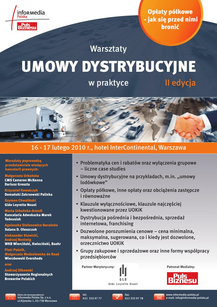 Op³aty pó³kowe - jak siê przed nimi broniæ Warsztaty UMOWY DYSTRYBUCYJNE w praktyce II edycja 16 - 17 lutego 2010 r., hotel InterContinental, Warszawa Warsztaty poprowadz¹ przedstawiciele wiod¹cych kancelarii prawnych: Problematyka cen i rabatów oraz wy³¹czenia grupowe ? – liczne case studies Ma³gorzata Urbañska CMS Cameron McKenna Dariusz Greszta ? Umowy dystrybucyjne na przyk³adach, m.in. „umowy lodówkowe” Krzysztof Kowalczyk Domañski Zakrzewski Palinka ? Op³aty pó³kowe, inne op³aty oraz obci¹¿enia zastêpcze i równowa¿ne Szymon Chwaliñski Gide Loyrette Nouel Marta Urbañska-Arendt Kancelaria Adwokacka Marek Tadeusiak Agnieszka Stefanowicz-Barañska Salans D. Oleszczuk ? Klauzule wy³¹cznoœciowe, klauzule najczêœciej kwestionowane przez UOKiK ? Dystrybucja poœrednia i bezpoœrednia, sprzeda¿ internetowa, franchising Aleksander Stawicki, Andrzej Nentwig WKB Wierciñski, Kwieciñski, Baehr ? Dozwolone porozumienia cenowe – cena minimalna, maksymalna, sugerowana, co i kiedy jest dozwolone, orzecznictwo UOKiK Piotr Paœnik, Ma³gorzata Modzelewska de Raad Wierzbowski Eversheds ? Grupy zakupowe i sprzeda¿owe oraz inne formy wspó³pracy przedsiêbiorców oraz Andrzej Olkowski Stowarzyszenie Regionalnych Browarów Polskich Adres do korespondencji: Informedia Polska Sp. z o.o. ul.Kijowska 1, 03-738 Warszawa Partner Merytoryczny: tel: 022 333 97 77 Patronat Medialny: fax: 022 333 97 78 www.informedia-polska.pl e-mail: [email protected] Warsztaty UMOWY DYSTRYBUCYJNE II edycja 16.02.2010, WTOREK 9.30 DLACZEGO WARTO WZI¥Æ UDZIA£ W WARSZTATACH: ? Wybór optymalnej formy dystrybucji przek³ada siê na wiêksz¹ sprzeda¿ Pañstwa produktów i us³ug, jednak¿e najwiêksze problemy stwarza napisanie dobrej umowy handlowej, zabezpieczaj¹cej Pañstwa interesy oraz nienaruszaj¹cej regulacji prawnych. ? Na spotkaniu omówimy najnowsze trendy w zakresie dystrybucji (m.in. dystrybucjê bezpoœredni¹). Przeanalizujemy: % liczne przyk³ady umów dystrybucyjnych, m.in. „umowy lodówkowe”, % umowy kwestionowane przez UOKiK i dystrybutorów, % klauzule umowne (tak¿e klauzule wy³¹cznoœciowe), % katalog dozwolonych porozumieñ cenowych, % grupy zakupowe i sprzeda¿owe, wy³¹czenia grupowe oraz problematykê cen i rabatów. Doradzimy tak¿e, jak napisaæ umowê, która pozwoli przeforsowaæ Pañstwa stanowisko w negocjacjach z dystrybutorami. ? Zaproszeni prelegenci to reprezentanci renomowanych kancelarii prawnych takich jak: CMS Cameron McKenna Dariusz Greszta, Domañski Zakrzewski Palinka, Gide Loyrette Nouel, Kancelaria Adwokacka Marek Tadeusiak, Salans D. Oleszczuk, Wierzbowski Eversheds, WKB Wierciñski, Kwieciñski, Baehr oraz Stowarzyszenie Regionalnych Browarów Polskich podziel¹ siê z Pañstwem swoj¹ praktyczn¹ wiedz¹ i doœwiadczeniem. KTO POWINIEN WZI¥Æ UDZIA£ W WARSZTATACH: Na Warsztatach spotkacie Pañstwo przedstawicieli departamentu prawnego oraz dzia³u handlowego producentów i dystrybutorów (sieci) bran¿: ? FMCG/Retailing ? Telekomunikacyjnej ? Farmaceutycznej ? Energetycznej ? Chemicznej ? Finansowej ? Budowlanej ZAPRASZAMY DO UDZIA£U W WARSZTATACH Sebastian Wojciechowski - Project Manager tel.: +48 22 333 97 77 fax: +48 22 333 97 78 [email protected] ZAPRASZAMY DO WSPÓ£PRACY W ZAKRESIE SPONSORINGU Dzia³ Sponsoringu tel.: +48 22 333 97 87 fax: +48 22 333 97 78 [email protected] Wszystkie treœci zawarte w programie Warsztatów stanowi¹ w³asnoœæ Informedia Polska Sp. z o.o. oraz powi¹zanych z ni¹ podmiotów. O ile Organizator nie postanowi inaczej, nie wolno ¿adnych materia³ów stanowi¹cych w³asnoœæ Informedia Polska odtwarzaæ, wykorzystywaæ, tworzyæ pochodnych prac na bazie materia³ów umieszczonych w programie, ani te¿ ponownie ich publikowaæ, zamieszczaæ w innych materia³ach czy te¿ w jakikolwiek inny sposób rozpowszechniaæ bez uprzedniej pisemnej zgody Informedia Polska. Poranna kawa, rejestracja i przywitanie 10.00 Umowy dystrybucyjne w kontekœcie prawa konkurencji – wprowadzenie ? Formy naruszania prawa konkurencji ? Porozumienia ograniczaj¹ce konkurencjê ? Nadu¿ywanie pozycji dominuj¹cej ? Konsekwencje naruszenia przepisów o ochronie konkurencji Szymon Chwaliñski, Gide Loyrette Nouel 11.00 Przerwa na kawê 11.15 Sprzedawcy internetowi kontra dystrybutorzy typu "brick and mortar" ? Wp³yw prawa antymonopolowego na wybór optymalnej struktury dystrybucji ? Wp³yw rozwoju Internetu na zmiany w prawie i praktyce orzeczniczej ? Pojêcie sprzeda¿y pasywnej i aktywnej, rola m.in. reklamy internetowej i praktyki web rerouting ? Dystrybucja internetowa a dystrybucja selektywna ? Aspekty cenowe przy równoleg³ej dystrybucji za poœrednictwem internetu i punktów sprzeda¿y ? Nowe rozporz¹dzenie wspólnotowe o ograniczeniach wertykalnych ? Pytanie o zakres swobody producenta w wyborze systemu dystrybucji Agnieszka Stefanowicz-Barañska, Salans D. Oleszczuk 12.30 Lunch 13.30 Postêpowanie przed Prezesem UOKiK w sprawach stosowania praktyk ograniczaj¹cych konkurencjê ? Charakter postêpowania przed Prezesem UOKiK ? Rodzaje postêpowañ - cechy charakterystyczne ? Postêpowanie dowodowe przed Prezesem UOKiK ? Kontrole i przeszukania jako narzêdzia postêpowania dowodowego ? Dostêp do akt postêpowania, ochrona tajemnicy przedsiêbiorstwa i tajemnicy zawodowej ? Kary pieniê¿ne za naruszenie przepisów o ochronie konkurencji - mo¿liwoœci unikniêcia lub ograniczenia kary Szymon Chwaliñski, Gide Loyrette Nouel 14.30 „Op³ata pó³kowa” category management w prawie konkurencji ? Zagro¿enia dla konkurencji w zwi¹zku z op³atami za miejsce na pó³ce w sklepie ? Category management: czy nadu¿ycie pozycji dominuj¹cej? ? Wp³yw pozycji rynkowej na ocenê "pó³kowego" i category management ? Swoboda przedsiêbiorców w stosowaniu "pó³kowego" i category management Ma³gorzata Modzelewska de Raad, Wierzbowski Eversheds 15.30 Przerwa na kawê 15.45 Jak broniæ siê przed op³atami pó³kowymi