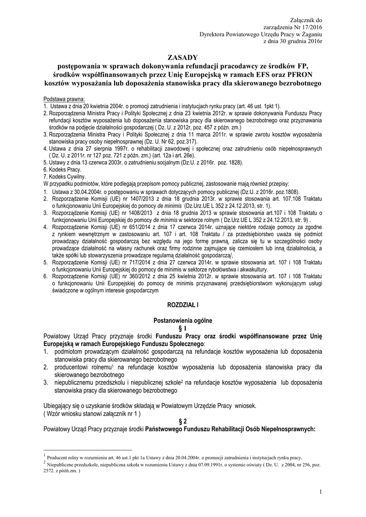 Załącznik do zarządzenia Nr 17/2016 Dyrektora Powiatowego Urzędu Pracy w Żaganiu z dnia 30 grudnia 2016r ZASADY postępowania w sprawach dokonywania refundacji pracodawcy ze środków FP, środków współfinansowanych przez Unię Europejską w ramach EFS oraz PFRON kosztów wyposażania lub doposażenia stanowiska pracy dla skierowanego bezrobotnego Podstawa prawna: 1. Ustawa z dnia 20 kwietnia 2004r. o promocji zatrudnienia i instytucjach rynku pracy (art. 46 ust. 1pkt 1). 2. Rozporządzenia Ministra Pracy i Polityki Społecznej z dnia 23 kwietnia 2012r. w sprawie dokonywania Funduszu Pracy refundacji kosztów wyposażenia lub doposażenia stanowiska pracy dla skierowanego bezrobotnego oraz przyznawania środków na podjęcie działalności gospodarczej ( Dz. U. z 2012r, poz. 457 z późn. zm.) 3. Rozporządzenia Ministra Pracy i Polityki Społecznej z dnia 11 marca 2011r. w sprawie zwrotu kosztów wyposażenia stanowiska pracy osoby niepełnosprawnej (Dz. U. Nr 62, poz.317). 4. Ustawa z dnia 27 sierpnia 1997r. o rehabilitacji zawodowej i społecznej oraz zatrudnieniu osób niepełnosprawnych ( Dz. U. z 2011r. nr 127 poz. 721 z późn. zm.) (art. 12a i art. 26e). 5. Ustawy z dnia 13 czerwca 2003r. o zatrudnieniu socjalnym (Dz.U. z 2016r. poz. 1828). 6. Kodeks Pracy. 7. Kodeks Cywilny. W przypadku podmiotów, które podlegają przepisom pomocy publicznej, zastosowanie mają również przepisy: 1. Ustawa z 30.04.2004r. o postępowaniu w sprawach dotyczących pomocy publicznej (Dz.U. z 2016r. poz.1808). 2. Rozporządzenie Komisji (UE) nr 1407/2013 z dnia 18 grudnia 2013r. w sprawie stosowania art. 107.108 Traktatu o funkcjonowaniu Unii Europejskiej do pomocy de minimis (Dz.Urz.UE L 352 z 24.12.2013, str. 1). 3. Rozporządzenie Komisji (UE) nr 1408/2013 z dnia 18 grudnia 2013 w sprawie stosowania art.107 i 108 Traktatu o funkcjonowaniu Unii Europejskiej do pomocy de minimis w sektorze rolnym ( Dz.Urz.UE L 352 z 24.12.2013, str. 9) . 4. Rozporządzenie Komisji (UE) nr 651/2014 z dnia 17 czerwca 2014r. uznające niektóre rodzaje pomocy za zgodne z rynkiem wewnętrznym w zastosowaniu art. 107 i art. 108 Traktatu / za przedsiębiorstwo uważa się podmiot prowadzący działalność gospodarczą bez względu na jego formę prawną, zalicza się tu w szczególności osoby prowadzące działalność na własny rachunek oraz firmy rodzinne zajmujące się rzemiosłem lub inną działalnością, a także spółki lub stowarzyszenia prowadzące regularną działalność gospodarczą/, 5. Rozporządzenie Komisji (UE) nr 717/2014 z dnia 27 czerwca 2014r. w sprawie stosowania art. 107 i 108 Traktatu o funkcjonowaniu Unii Europejskiej do pomocy de minimis w sektorze rybołówstwa i akwakultury. 6. Rozporządzenie Komisji (UE) nr 360/2012 z dnia 25 kwietnia 2012r. w sprawie stosowania art. 107 i 108 Traktatu o funkcjonowaniu Unii Europejskiej do pomocy de minimis przyznawanej przedsiębiorstwom wykonującym usługi świadczone w ogólnym interesie gospodarczym ROZDZIAŁ I Postanowienia ogólne §1 Powiatowy Urząd Pracy przyznaje środki Funduszu Pracy oraz środki współfinansowane przez Unię Europejską w ramach Europejskiego Funduszu Społecznego: 1. podmiotom prowadzącym działalność gospodarczą na refundacje kosztów wyposażenia lub doposażenia stanowiska pracy dla skierowanego bezrobotnego 2. producentowi rolnemu1 na refundacje kosztów wyposażenia lub doposażenia stanowiska pracy dla skierowanego bezrobotnego 3. niepublicznemu przedszkolu i niepublicznej szkole2 na refundacje kosztów wyposażenia lub doposażenia stanowiska pracy dla skierowanego bezrobotnego Ubiegający się o uzyskanie środków składają w Powiatowym Urzędzie Pracy wniosek. ( Wzór wniosku stanowi załącznik nr 1 ) §2 Powiatowy Urząd Pracy przyznaje środki Państwowego Funduszu Rehabilitacji Osób Niepełnosprawnych: 1 Producent rolny w rozumieniu art. 46 ust.1 pkt 1a Ustawy z dnia 20.04.2004r. o promocji zatrudnienia i instytucjach rynku pracy. Niepubliczne przedszkole, niepubliczna szkoła w rozumieniu Ustawy z dnia 07.09.1991r. o systemie oświaty ( Dz. U. z 2004, nr 256, poz. 2572. z późń.zm. ) 2 1 pracodawcom, którzy przez okres co najmniej 36 miesięcy zatrudnią osobę niepełnosprawną zarejestrowaną w Powiatowym Urzędzie Pracy jako bezrobotna albo poszukująca pracy nie pozostająca w zatrudnieniu tytułem zwrotu kosztów wyposażenia stanowiska pracy. Ubiegający się o uzyskanie środków składają w Powiatowym Urzędzie Pracy wniosek. (Wzór wniosku stanowi załącznik nr 2 ) §3 Przyznanie środków następuje na podstawie umowy cywilno-prawnej zawartej między podmiotem, określonym w § 1 ust. 1-3 oraz w § 2 ust. 1 a upoważnionym przez Starostę Dyrektorem Powiatowego Urzędu Pracy. §4 1. Wysokość wnioskowanych środków z Funduszu Pracy na 1 stanowisko pracy określona jest w umowie, nie wyższa jednak niż 20.000,00 zł brutto. 2. Wysokość wnioskowanych środków z Państwowego Funduszu Rehabilitacji Osób niepełnosprawnych na wyposażenie stanowiska pracy osoby niepełnosprawnej określona jest w umowie, nie wyższa jednak niż 20.000,00 zł brutto ( kwota może ulec zwiększeniu jeżeli stanowisko pracy wymaga dodatkowego dostosowania do posiadanej niepełnosprawności ) 3. Maksymalna wysokość środków o których mowa w pkt. 1 i 2 ustalona jest odrębnie w każdym roku kalendarzowym w zależności od możliwości finansowych Urzędu. ROZDZIAŁ II Warunki i tryb przyznawania środków z Funduszu Pracy, środków współfinansowanych przez Unię Europejską w ramach Europejskiego Funduszu Społecznego oraz Państwowego Funduszu Rehabilitacji Osób Niepełnosprawnych §5 Wysokość przyznanych środków z FP i PFRON oraz formy zabezpieczenia zwrotu środków wydatkowanych niezgodnie z warunkami umowy mogą być przedmiotem negocjacji pomiędzy stronami. Uzgodnione warunki stanowią podstawę do zawarcia umowy. Przed podpisaniem umowy, pracownik PUP może przeprowadza wizy