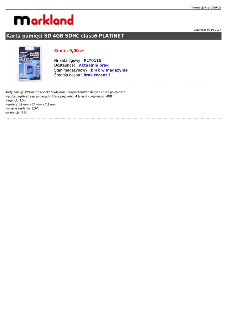 Informacje o produkcie Utworzono 02-03-2017 Karta pamięci SD 4GB SDHC class6 PLATINET Cena : 0,00 zł Nr katalogowy : PLY0115 Dostępność : Aktualnie brak Stan magazynowy : brak w magazynie Średnia ocena : brak recenzji Karty pamięci Platinet to wysoka wydajność, bezpieczeństwo danych i duża pojemność. wysoka prędkość zapisu danych - klasa prędkości: 4 (class4) pojemność: 4GB waga: ok. 1,5g, wymiary: 32 mm x 24 mm x 2,1 mm, napięcie zasilania: 3,3V, gwarancja: 5 lat