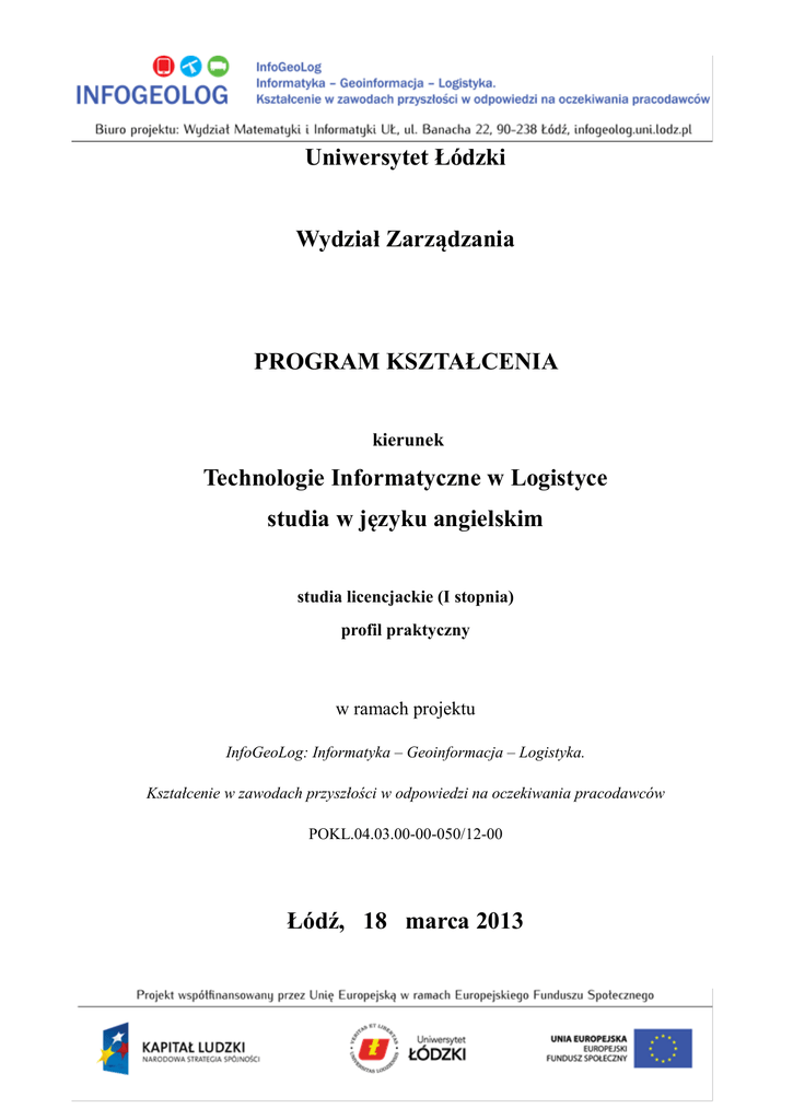 Uniwersytet Łódzki Wydział Zarządzania PROGRAM KSZTAŁCENIA kierunek Technologie Informatyczne w Logistyce studia w języku angielskim studia licencjackie (I stopnia) profil praktyczny w ramach projektu InfoGeoLog: Informatyka – Geoinformacja – Logistyka. Kształcenie w zawodach przyszłości w odpowiedzi na oczekiwania pracodawców POKL.04.03.00-00-050/12-00 Łódź, 18 marca 2013 1. Kierunek: Technologie informatyczne w logistyce studia w języku angielskim 2. Zwięzły opis kierunku Program studiów Technologie Informacyjne w Logistyce został opracowany w oparciu o rzeczywiste potrzeby przedsiębiorstw i instytucji, w których mogą zostać zatrudnieni absolwenci. Uwzględniono w nim nowoczesne rozwiązania w zakresie technologii wykorzystywanych w logistyce, co zapewnia unikalny charakter tego kierunku. Studenci kształceni będą w zakresie: ekonomii, zarządzania, finansów i rachunkowości, nowoczesnych rozwiązań w transporcie krajowymi i międzynarodowym, gospodarki magazynowej, z naciskiem na automatykę, robotykę i inne nowoczesne technologie, telekomunikacji i informatycznych systemów wykorzystywanych w logistyce, zastosowania proekologicznych technologii transportowych, stosowanych w magazynach, opakowaniach i logistyce zwrotnej. Zajęcia będą prowadzone, przy współpracy Wydziału Zarządzania UŁ, Wydziału Matematyki i Informatyki UŁ, Wydziału Ekonomiczno-Socjologicznego UŁ oraz Wydziału Fizyki i Informatyki Stosowanej, przez doświadczoną kadrę akademicką UŁ oraz praktyków z kraju i zagranicy. 3. Poziom: pierwszy stopień 4. Profil: praktyczny 5. Forma studiów: stacjonarne 6. Zasadnicze cele kształcenia: Celem studiów jest kształcenie specjalistów zgodnie z oczekiwaniami interesariuszy - przedsiębiorstw produkcyjnych, handlowych, operatorów świadczących usługi transportu i magazynowania, a także szeroko pojętego sektora usług publicznych w zakresie obsługi procesów logistycznych (obsługa klienta, zakupy, zarządzanie zapasami, magazynowanie, spedycja). Absolwenci studiów będą posiadać wiedzę na temat obecnie stosowanych technologii informatycznych i będą potrafili wykorzystać ją do usprawniania i optymalizowania procesów logistycznych, związanych z przepływem towarów (surowców, materiałów, wyrobów gotowych), materiałów i informacji. Specjalność dostarcza studentom kompleksowej wiedzy o działaniu i możliwościach efektywnego wykorzystania narzędzi informatycznych w logistyce. Program kierunku pozwala studentowi nabyć umiejętności najbardziej przydatnych w praktyce, związanych z: zasadami planowania, organizowania i kontrolowania procesów logistycznych; różnorodnymi instrumentami wykorzystywanymi w procesach zakupu, organizacji produkcji, magazynowaniu, transporcie, obsługi klienta; najnowszymi metodami optymalizacji decyzji logistycznych, jak np. ilości zapasów, lokalizacji źródeł zakupu; automatyką w procesach logistycznych. Absolwent posiada umiejętność doboru i odpowiedniego wykorzystania narzędzi informatycznych do budowy modeli analitycznych i analizy predykcyjnej oraz sprawnie posługuje się narzędziami informatycznymi w celu rozwiązania konkretnych problemów w logistyce. Potrafi modelować i optymalizować procesy realizowane w łańcuchu dostaw z wykorzystaniem zaawansowanych metod i narzędzi ilościowych oraz jakościowych, dostępnych jako osobne oprogramowanie specjalistyczne, funkcjonalności w systemach klasy ERP lub w narzędziach ogólnodostępnych np. arkuszu kalkulacyjnym. 7. Tytuł zawodowy uzyskiwany przez absolwenta: licencjat 8. Możliwość zatrudnienia i kontynuacji kształcenia absolwenta Rozwijająca się infrastruktura regionu łódzkiego oczekuje wysoko wyspecjalizowanych pracowników przygotowanych do pełnienia kluczowych zadań związanych z obsługą procesów w łańcuchu logistycznym. Każda współczesna organizacja zajmująca się logistyką powinna być wyposażona w narzędzia informatyczne, bo tylko przy ich użyciu jest w stanie w pełni wykorzystywać wszystkie możliwości jakie podsuwa współczesna koncepcja logistyki. Absolwenci specjalności mogą znaleźć zatrudnienie na stanowiskach związanych z wykorzystaniem systemów i narzędzi informatycznych w podmiotach gospodarczych, w których zaimplementowane są procesy logistyczne. Docelowym rynkiem pracy absolwentów kierunku pierwszego stopnia są stanowiska średniego szczebla. Absolwenci mogą być zatrudniani m.in. na stanowiskach: specjalista do spraw organizacji i rozwoju transportu; specjalista do spraw sprzedaży; agent do spraw zakupów; zaopatrzeniowiec; pracownik działu logistyki; spedytor i specjaliści ds. zarządzania magazynem. 9. Wymagania wstępne, oczekiwane kompetencje kandydata: Studia są kierowane do absolwentów szkół średnich, legitymujących się dobrą znajomością języka angielskiego oraz zainteresowanych pogłębianiem swojej wiedzy z zakresu logistyki i informatyki. Specjalistyczna wiedza informatyczna nie jest wymagana. W ramach struktury studiów będą prowadzone obligatoryjne zajęcia wyrównawcze z zakresu matematyki, języka angielskiego i kompetencji interpersonalnych. Podczas zajęć student będzie miał możliwość poznania wybranych narzędzi informatycznych stosowanych w przedsiębiorstwach. 10. Zasady rekrutacji z limitem na kolejny rok akademicki Kierunek: Technologie Informatyczne w Logistyce (studia w języku angielskim)* *od kandydatów wymagana jest znajomość języka angielskiego na poziomie zaawansowanym Orientacyjny limit miejsc: 60 (Kierunek zostanie uruchomiony, gdy zgłosi się co najmniej 48 osób) Zasady rekrutacji: Kategoria przedmiotu 1 maksymalnie jeden (wymagany) PP x 1,5 PR x 4 2 maksymalnie jeden (wymagany) PP x 1 PR x 3 3 maksymalnie dwa (nie wymagane) PP x 0,5 PR x 1 Przedmioty: Język obcy ( angielski, niemiecki, rosyjski, francuski) Matematyka Geografia Historia WOS Informatyka Matematyka Geografia Historia WOS Informaty