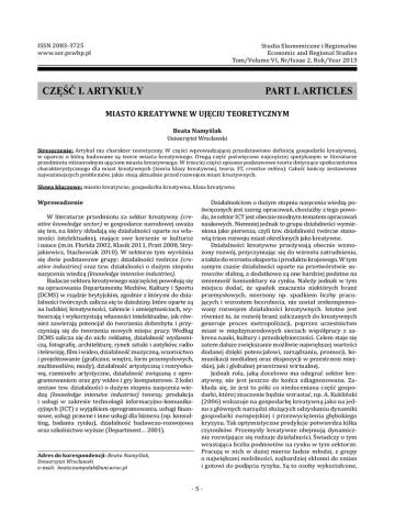 ISSN 2083-3725 www.ser.pswbp.pl Studia Ekonomiczne i Regionalne Economic and Regional Studies Tom/Volume VI, Nr/Issue 2, Rok/Year 2013 CZĘŚĆ I. ARTYKUŁY PART I. ARTICLES MIASTO KREATYWNE W UJĘCIU TEORETYCZNYM Beata Namyślak Uniwersytet Wrocławski Streszczenie: Artykuł ma charakter teoretyczny. W części wprowadzającej przedstawiono de inicję gospodarki kreatywnej, w oparciu o którą budowane są teorie miasta kreatywnego. Drugą część poświęcono najczęściej spotykanym w literaturze przedmiotu różnorodnym ujęciom miasta kreatywnego. W trzeciej części opisano podstawowe teorie dotyczące społeczeństwa charakterystycznego dla miast kreatywnych (teoria klasy kreatywnej, teoria 3T, creative milieu). Całość kończy zestawienie najważniejszych problemów, jakie stoją aktualnie przed rozwojem miast kreatywnych. Słowa kluczowe: miasto kreatywne, gospodarka kreatywna, klasa kreatywna Wprowadzenie W literaturze przedmiotu za sektor kreatywny (creative knowledge sector) w gospodarce narodowej uważa się ten, na który składają się działalności oparte na własności intelektualnej, mające swe korzenie w kulturze i nauce (m.in. Florida 2002, Klasik 2011, Pratt 2008, Stryjakiewicz, Stachowiak 2010). W sektorze tym wyróżnia się dwie podstawowe grupy: działalności twórcze (creative industries) oraz tzw. działalności o dużym stopniu nasycenia wiedzą (knowledge intensive industries). Badacze sektora kreatywnego najczęściej powołują się na opracowania Departamentu Mediów, Kultury i Sportu (DCMS) w rządzie brytyjskim, zgodnie z którymi do działalności twórczych zalicza się te dziedziny, które oparte są na ludzkiej kreatywności, talencie i umiejętnościach, wytwarzają i wykorzystują własności intelektualne, jak również zawierają potencjał do tworzenia dobrobytu i przyczyniają się do tworzenia nowych miejsc pracy. Według DCMS zalicza się do nich: reklamę, działalność wydawniczą, fotogra ię, architekturę, rynek sztuki i antyków, radio i telewizję, ilm i wideo, działalność muzyczną, wzornictwo i projektowanie (gra iczne, wnętrz, form przemysłowych, multimediów, mody), działalność artystyczną i rozrywkową, rzemiosło artystyczne, działalność związaną z oprogramowaniem oraz gry wideo i gry komputerowe. Z kolei zestaw tzw. działalności o dużym stopniu nasycenia wiedzą (knowledge intensive industries) tworzą: produkcja i usługi w zakresie technologii informacyjno-komunikacyjnych (ICT) z wyjątkiem oprogramowania, usługi inansowe, usługi prawne i inne usługi dla biznesu (np. konsulting, badania rynku), działalność badawczo-rozwojowa oraz szkolnictwo wyższe (Department… 2001). Adres do korespondencji: Beata Namyślak, Uniwersytet Wrocławski e-mail: [email protected] Działalnościom o dużym stopniu nasycenia wiedzą poświęconych jest szereg opracowań, chociażby z tego powodu, że sektor ICT jest obecnie modnym tematem opracowań naukowych. Niemniej jednak to grupa działalności wymieniona jako pierwsza, czyli tzw. działalności twórcze stanowią trzon rozwoju miast określonych jako kreatywne. Działalności kreatywne przeżywają obecnie wzmożony rozwój, przyczyniając się do wzrostu zatrudnienia, a także do wzrostu eksportu i produktu krajowego. W tym samym czasie działalności oparte na przetwórstwie surowców słabną, a dodatkowo są one bardziej podatne na zmienność koniunktury na rynku. Należy jednak w tym miejscu dodać, że spadek znaczenia niektórych branż przemysłowych, mierzony np. spadkiem liczby pracujących i wzrostem bezrobocia, nie został zrekompensowany rozwojem działalności kreatywnych. Istotne jest również to, że rozwój branż zaliczanych do kreatywnych generuje proces metropolizacji, poprzez uczestnictwo miast w międzynarodowych sieciach współpracy z zakresu nauki, kultury i przedsiębiorczości. Celem staje się zatem dalsze zwiększanie możliwie największej wartości dodanej dzięki potencjałowi, zarządzaniu, promocji, komunikacji medialnej oraz ekspozycji w przestrzeni miejskiej, jak i globalnej przestrzeni wirtualnej. Jednak rola, jaką docelowo ma odegrać sektor kreatywny, nie jest jeszcze do końca zdiagnozowana. Zakłada się, że jest to póki co niedoceniana część gospodarki, której znaczenie będzie wzrastać, np. A. Kukliński (2006) wskazuje na gospodarkę kreatywną jako na jedno z głównych narzędzi służących odzyskaniu dynamiki gospodarki europejskiej i przezwyciężenia głębokiego kryzysu. Tak optymistyczne predykcje potwierdza kilka czynników. Przemysły kreatywne obejmują dynamicznie rozwijające się rodzaje działalności. Świadczy o tym wrastająca liczba podmiotów na rynku w tym sektorze. Pracują w nich w dużej mierze ludzie młodzi, z grupy o największej mobilności, najbardziej skłonni do zmian i gotowi do podjęcia ryzyka. Są to osoby wykształcone, -5- Studia Ekonomiczne i Regionalne Nr 2 (VI) 2013 Miasto kreatywne w ujęciu teoretycznym mieszkające przeważnie w dużych miastach. Już chociażby te wymienione cechy mogą sugerować, że sektor kreatywny będzie cechowała wysoka dynamika zmian, prawdopodobnie zmian o charakterze progresywnym. Poza tym, działalności kreatywne są narzędziem rewitalizacji obszarów zdegradowanych, a zmiana charakteru dzielnic miejskich na takie, które oparte są o przemysły kreatywne, staje się coraz częściej celem polityki urbanistycznej. Miasto kreatywne - definicja pojęcia Za miasto kreatywne uznaje się takie, które ma zdolność do generowania i wprowadzania w życie nowych idei, projektów, innowacji oraz zdolność do przyciągania i zatrzymywania twórczych/przedsiębiorczych ludzi oraz podmiotów z sektora kreatywnego. Takie miasto powinna cechować obecność: działalności kreatywnych, które powinny się pojawić jako odpowiedź na formowanie struktur nowej gospodarki; klasy kreatywnej, czyli pewnej części społeczeństwa o wysokich kompetencj