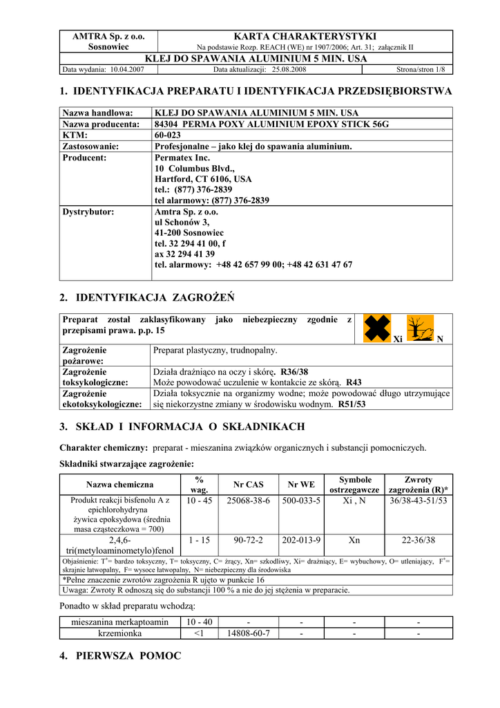 AMTRA Sp. z o.o. Sosnowiec KARTA CHARAKTERYSTYKI Na podstawie Rozp. REACH (WE) nr 1907/2006; Art. 31; załącznik II KLEJ DO SPAWANIA ALUMINIUM 5 MIN. USA Data wydania: 10.04.2007 Data aktualizacji: 25.08.2008 Strona/stron 1/8 1. IDENTYFIKACJA PREPARATU I IDENTYFIKACJA PRZEDSIĘBIORSTWA Nazwa handlowa: Nazwa producenta: KTM: Zastosowanie: Producent: KLEJ DO SPAWANIA ALUMINIUM 5 MIN. USA 84304 PERMA POXY ALUMINIUM EPOXY STICK 56G 60-023 Profesjonalne – jako klej do spawania aluminium. Permatex Inc. 10 Columbus Blvd., Hartford, CT 6106, USA tel.: (877) 376-2839 tel alarmowy: (877) 376-2839 Amtra Sp. z o.o. ul Schonów 3, 41-200 Sosnowiec tel. 32 294 41 00, f ax 32 294 41 39 tel. alarmowy: +48 42 657 99 00; +48 42 631 47 67 Dystrybutor: 2. IDENTYFIKACJA ZAGROśEŃ Preparat został zaklasyfikowany przepisami prawa. p.p. 15 jako niebezpieczny zgodnie z Xi ZagroŜenie poŜarowe: ZagroŜenie toksykologiczne: ZagroŜenie ekotoksykologiczne: N Preparat plastyczny, trudnopalny. Działa draŜniąco na oczy i skórę. R36/38 MoŜe powodować uczulenie w kontakcie ze skórą. R43 Działa toksycznie na organizmy wodne; moŜe powodować długo utrzymujące się niekorzystne zmiany w środowisku wodnym. R51/53 3. SKŁAD I INFORMACJA O SKŁADNIKACH Charakter chemiczny: preparat - mieszanina związków organicznych i substancji pomocniczych. Składniki stwarzające zagroŜenie: Nazwa chemiczna Produkt reakcji bisfenolu A z epichlorohydryna Ŝywica epoksydowa (średnia masa cząsteczkowa = 700) 2,4,6tri(metyloaminometylo)fenol % wag. 10 - 45 Nr CAS Nr WE 500-033-5 Symbole ostrzegawcze Xi , N Zwroty zagroŜenia (R)* 36/38-43-51/53 25068-38-6 1 - 15 90-72-2 202-013-9 Xn 22-36/38 Objaśnienie: T+= bardzo toksyczny, T= toksyczny, C= Ŝrący, Xn= szkodliwy, Xi= draŜniący, E= wybuchowy, O= utleniający, F+= skrajnie łatwopalny, F= wysoce łatwopalny, N= niebezpieczny dla środowiska *Pełne znaczenie zwrotów zagroŜenia R ujęto w punkcie 16 Uwaga: Zwroty R odnoszą się do substancji 100 % a nie do jej stęŜenia w preparacie. Ponadto w skład preparatu wchodzą: mieszanina merkaptoamin krzemionka 4. PIERWSZA POMOC 10 - 40 <1 14808-60-7 - - - AMTRA Sp. z o.o. Sosnowiec KARTA CHARAKTERYSTYKI Na podstawie Rozp. REACH (WE) nr 1907/2006; Art. 31; załącznik II KLEJ DO SPAWANIA ALUMINIUM 5 MIN. USA Data wydania: 10.04.2007 Data aktualizacji: 25.08.2008 Strona/stron 2/8 Następstwa wdychania: • Wyprowadzić poszkodowana osobę na świeŜe powietrze. UłoŜyć w wygodnej pozycji. Zapewnić ciepło i spokój. • W przypadku wystąpienia takiej potrzeby - wykonać sztuczne oddychanie lub w razie potrzeby podać tlen - najlepiej jeśli tego dokona osoba przeszkolona. Chronić przed utratą ciepła. • Zapewnić pomoc lekarską. Następstwa połknięcia: • Przepłukać usta wodą, dać do wypicia 2-3 szklanki wody, skontaktować się z lekarzem lub centrum toksykologicznym. Nie wywoływać wymiotów. W przypadku samoczynnego wystąpienia wymiotów, ułoŜyć głowę tak, aby nie dopuścić do zachłyśnięcia. • W razie potrzeby przetransportować do szpitala. Choremu zapewnić spokój, leŜenie i ciepło. Kontakt z oczami: • Usunąć szkła kontaktowe. Przemyć zanieczyszczone oczy większą ilością letniej wody przez 15 minut, przy wywiniętych powiekach. Co pewien czas nakładać górną na dolną powiekę. Przykryć oczy opatrunkiem. • W razie potrzeby zapewnić pomoc okulisty. Kontakt ze skórą: • Zdjąć zanieczyszczone ubranie i buty. Oczyścić mechanicznie zanieczyszczoną skórę, przemyć duŜą ilością wody a następnie wodą z łagodnym mydłem. Nie uŜywać jakichkolwiek rozpuszczalników lub rozcieńczalników. • W przypadku gdy podraŜnienie skóry nie przemija, skonsultować się z lekarzem dermatologiem. 5. POSTĘPOWANIE W PRZYPADKU POśARU Preparat plastyczny, trudnopalny. • pianę gaśniczą (odporną na alkohol) • ditlenek węgla (CO2) • proszek gaśniczy, • mgłę wodną. Środki gaśnicze, jakich Nie stosować zwartych strumieni wody. nie naleŜy stosować: Mały poŜar gasić gaśnicą pianową lub ditlenkiem węgla, duŜy poŜar gasić Gaszenie poŜaru: pianą gaśniczą odporną na alkohol lub rozproszoną wodą. Opary strącać mgłą wodną. Pojemniki naraŜone na działania ognia lub wysokiej temperatury chłodzić wodą i w miarę moŜliwości usunąć z zagroŜonego obszaru. Pełne wyposaŜenie ochronne. Aparaty izolujące drogi oddechowe. Sprzęt ochronny straŜaków: Czarne dymy zawierające niebezpieczne produkty spalania, w tym tlenek i Produkty spalania: ditlenek węgla, tlenki azotu. W wyniku podgrzewania produktu wytwarzają się mieszaniny wybuchowe. Uwaga dodatkowa: Do zbierania rozlanej cieczy uŜywać materiały absorbujące. Chronić kanalizację, wody powierzchniowe i grunt przed zanieczyszczeniem. ZagroŜenia poŜarowe: Środki gaśnicze: 6. POSTĘPOWANIE W PRZYPADKU NIEZAMIERZONEGO UWOLNIENIA DO ŚRODOWISKA Środki ochrony indywidualnej: Ubrania ochronne ze zwartej tkaniny, rękawice z tworzywa nitrylowego lub neoprenowego, buty z tworzywa neoprenowego, okulary ochronne w szczelnej obudowie, ochrony dróg oddechowych (filtr cząsteczkowy oznaczony kolorem białym i AMTRA Sp. z o.o. Sosnowiec KARTA CHARAKTERYSTYKI Na podstawie Rozp. REACH (WE) nr 1907/2006; Art. 31; załącznik II KLEJ DO SPAWANIA ALUMINIUM 5 MIN. USA Data wydania: 10.04.2007 Metody oczyszczania: Zabezpieczenie środowiska: Data aktualizacji: 25.08.2008 Strona/stron 3/8 symbolem P2). Usunąć wszelkie potencjalne źródła zapłonu, zabezpieczyć uszkodzone opakowania, na drodze przemieszczającego się preparatu sypać tamy. Stosować obojętne materiały absorbujące (ziemia, suchy piasek, diatomit, wermikulit). Zebraną ze środowiska ciecz umieścić w opakowaniu zastępczym i skierować do zniszczenia. Nie wolno uŜywać rozpuszczalników. Do czyszczenia stosować detergenty. Zabezpieczyć studzienki ściekowe. W przypadku powaŜnego zanieczyszczenia jakichkolwiek elemen