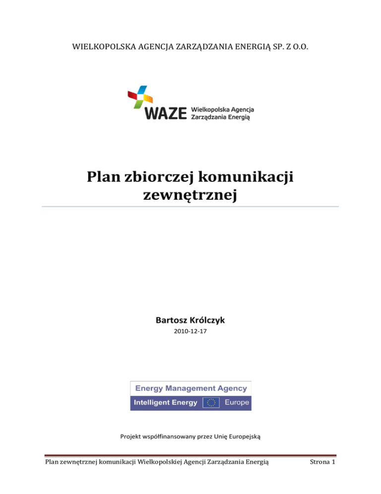 WIELKOPOLSKA AGENCJA ZARZĄDZANIA ENERGIĄ SP. Z O.O. Plan zbiorczej komunikacji zewnętrznej Bartosz Królczyk 2010-12-17 Projekt współfinansowany przez Unię Europejską Plan zewnętrznej komunikacji Wielkopolskiej Agencji Zarządzania Energią Strona 1 (w ramach Programu Inteligentna Energia –Europa) Zawartość Cel stworzenia systemu zbiorczej komunikacji zewnętrznej................................................................... 4 Opis organizacji ....................................................................................................................................... 5 Wizja WAZE i jej działania.................................................................................................................... 5 Podstawy istnienia WAZE .................................................................................................................... 5 Struktura organizacyjna....................................................................................................................... 6 Pracownicy WAZE ................................................................................................................................ 6 Charakterystyka kultury organizacyjnej i wizerunku Agencji .............................................................. 7 Wstępna analiza wymagao .................................................................................................................. 7 Analiza możliwości operacyjnych ........................................................................................................ 9 Analiza możliwości finansowych ....................................................................................................... 10 Analiza ryzyka .................................................................................................................................... 10 Narzędzia i taktyki używane w zewnętrznej komunikacji firmy WAZE ................................................. 10 Podział dokumentów i informacji ze względu na odbiorców i stopieo jawności .............................. 10 Strona internetowej Agencji.............................................................................................................. 11 Komunikacja e-mailowa .................................................................................................................... 12 Komunikacja pisemna........................................................................................................................ 12 Komunikacja typu fax ........................................................................................................................ 13 Telefon stacjonarny ........................................................................................................................... 13 Telefon mobilny................................................................................................................................. 13 Wiadomości tekstowe SMS ............................................................................................................... 13 Komunikacja bezpośrednia ............................................................................................................... 13 Broszury ............................................................................................................................................. 15 Współpraca i komunikacja z mediami ............................................................................................... 15 Portale społecznościowe ................................................................................................................... 16 Plan wdrożenia systemu zbiorczej komunikacji zewnętrznej .............................................................. 16 Kalendarium projektu........................................................................................................................ 16 Fazy Projektu ................................................................................................................................. 16 Produkty związane z fazami projektów ......................................................................................... 18 Działania niezbędne do stworzenia produktów koocowych poszczególnych faz ......................... 19 Zależności następstwa między działaniami ................................................................................... 20 Plan zewnętrznej komunikacji Wielkopolskiej Agencji Zarządzania Energią Strona 2 Plan zewnętrznej komunikacji Wielkopolskiej Agencji Zarządzania Energią Strona 3 Cel stworzenia systemu zbiorczej komunikacji zewnętrznej Celem systemu zewnętrznej komunikacji Wielkopolskiej Agencji Zarządzania Energią jest umożliwienie, udokumentowanie i usprawnienie systemu interakcji między Agencją a podmiotami zewnętrznymi. Komunikacja polega na przepływie informacji pomiędzy stronami, rozumieniu i oddziaływaniu oraz wzajemnej interakcji. Stanowi więc element procesu wymiany wiedzy. Istotą przepływu informacji jest uzgodnienie przez strony jednakowego, wspólnego rozumienia danej sytuacji lub stanu. Komunikowanie się jest skuteczne tylko wówczas, gdy dana sytuacja jest rozumiana w taki sam sposób. Niniejszy dokument będzie zawierał opis wykorzystania narzędzi i taktyk zarówno komunikacji ustnej, jak i pisemnej, ze szczególnym uwzględnieniem komunikacji elektronicznej, mających na celu osiąganie optymalnego sposobu komunikacji zewnętrznej. Głównym celem stworzenia zewnętrznego systemu komunikacji jest zapewnienie pracownikom Agencji oraz podmiotom zewnętrznym możliwości wzajemnej komunikacji i dostępu do niezbędnych faktów potrzebnych w podejmowaniu optymalnych decyzji biznesowych, przy zapewnieniu standardów poufności, prywatności i spójności informacji. Cel główny będzie realizowany poprzez cele pomniejsze: 1. Zapewnienie by każdy z pracowników i wszystki