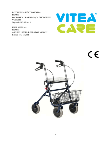 INSTRUKCJA UŻYTKOWNIKA FRANK PODPÓRKA UŁATWIAJĄCA CHODZENIE VCBK221 Wydanie MG 12.2015 USER MANUAL FRANK 4-WHEEL STEEL ROLLATOR VCBK221 Edition MG 12.2015 1 Spis treści/Table of contents 1. Wstęp / Introduction ........................................................................................................................ 3 2. Opis produktu / Description of product ........................................................................................... 3 3. Zastosowanie / Use .......................................................................................................................... 5 4. Przeciwwskazania / Contraindications ............................................................................................ 5 5. Użytkowanie / Usage....................................................................................................................... 5 6. Bezpieczeństwo użytkowania / Safety of use ................................................................................. 8 7. Czynności obsługi i konserwacji / Everyday use and maintenance .............................................. 10 8. Parametry techniczne / Technical parametres ............................................................................... 15 9. Symbole / Symbols ........................................................................................................................ 15 10. Dane teleadresowe / Contact details .............................................................................................. 17 PRZED UŻYCIEM PRZECZYTAJ UWAŻNIE CAŁĄ INSTRUKCJĘ PLEASE READ WHOLE INSTRUCTION CAREFULLY BEFORE USE 2 1. Wstęp / Introduction Składana podpórka czterokołowa, wyposażona w dwa stałe koła tylne z hamulcem i blokadą kół oraz dwa przednie koła obrotowe. Umożliwia łatwe poruszanie się po każdej powierzchni, wewnątrz i na zewnątrz budynku. Uchwyty anatomiczne wykonane z polietylenu, rama ze stali. Four wheel steel rollator with footrest, equipped with two fixed rear wheels with brake and locking the wheels and the two front wheels swivel. It lets you easily navigate through any surface, inside and outside the building. Handles anatomical made of polyethylene, steel frame. 2. Opis produktu / Description of product 1 2 7 3 8 4 9 10 11 5 12 6 Ilustracja / Illustration 1. 1. Rączki 1. Handle holder 2. Dźwignia hamulca z możliwością blokady 2. Brake lever with locking rotation of the wheels. obrotu kół 3. Handles height screw adjustment 3. Śruba regulacji wysokości rączek 4. Lock 4. Blokada 5. Side frame 5. Rama boczna 6. Rear wheel 6. Koło tylne 7. Tray 7. Taca 8. Seat 8. Siedzisko 9. Transverse frame 9. Rama poprzeczna 10. Basket for small items 10. Koszyk na drobne przedmioty 11. Seat 12. Caster front wheels 11. Uchwyt na kulę 12. Skrętne koło przednie Elementy, które powinny znajdować się wewnątrz Elements that should be inside the packaging: opakowania: 3 Ilustracja / Illustration 2. Taca na drobne przedmioty / Tray for small items Ilustracja / Illustration 3. Koszyk na drobne przedmioty / Basket for small items Ilustracja / Illustration 4. Zestaw mocujący (dwa pokrętła ze śrubkami oraz podkładkami do mocowania rączek i podłokietników) ) / The mounting kit (two knobs with screws and washer to mount hand holder and armrests) 4 Ilustracja / Illustration 5. Podpórka / Rollator 3. Zastosowanie / Use Podpórki rehabilitacyjne są sprzętem pomocniczym ułatwiającym pionizację i poruszanie się pacjentów o różnym typie zaburzeń motorycznych. Mogą być stosowane jako pomoc dla pacjentów po zabiegach chirurgicznych (operacje w obrębie kończyn dolnych) nie mogących posługiwać się kulami, nie wykazujących zaburzeń koordynacyjnych, pacjentów z lekką dysfunkcją kończyn dolnych lub ich osłabieniem. Są stosowane w przypadku pacjentów z zaburzeniami równowagi uniemożliwiającymi samodzielną pionizację i lokomocję oraz różnego typu dysfunkcjami krążeniowymi (np. chromanie przestankowe). Podpórki mogą być również stosowane jako pomoc w lokomocji pacjentów geriatrycznych. Rehabilitation supports are an ancillary equipment to facilitate tilting and moving of patients with different types of motor disorders. They can be used as an aid for patients after surgery (lower limbs) who are unable to use crutches, showing no coordination disorders, patients with mild dysfunction of the lower limbs or weakness. They are used in patients with in patients with impaired balance preventing them from independent vertical position and locomotion, as well as various types of circulatory dysfunction (e.g. intermittent claudication). Supports can also be used as an aid for geriatric patients. 4. Przeciwwskazania / Contraindications Przeciwwskazania do pionizacji, urazy i dysfunkcje Contraindications to the upright position, injuries and kończyn górnych uniemożliwiające wspieranie się dysfunctions of upper limbs preventing the patient from supporting themselves, impaired coordination na podpórce, zaburzenia koordynacji. and perception. 5. Użytkowanie / Usage • Produkt pakowany jest w pozycji złożonej. • The product is packed In folder position. • Po wyjęciu z opakowania należy sprawdzić • After unpacking the package, check if it czy zawiera ono wszystkie części zgodnie contains all parts in accordance with the list of z wykazem elementów zamieszczonym elements set out above. powyżej. • Ensure that all components have no visible • Należy upewnić się, że wszystkie elementy damage. If any doubts, please contact the nie posiadają widocznych uszkodzeń manufacturer. 5 • • • • mechanicznych. W przypadku wątpliwości należy skontaktować się z wytwórcą. Nie używaj podpórki dopóki wszystkie części nie zostaną właściwie połączone. Montaż – proszę zapoznać się z Ilustracją 1. Aby rozłożyć podpórkę należy nacisnąć dłonią na siedzisko oraz ramę poprz