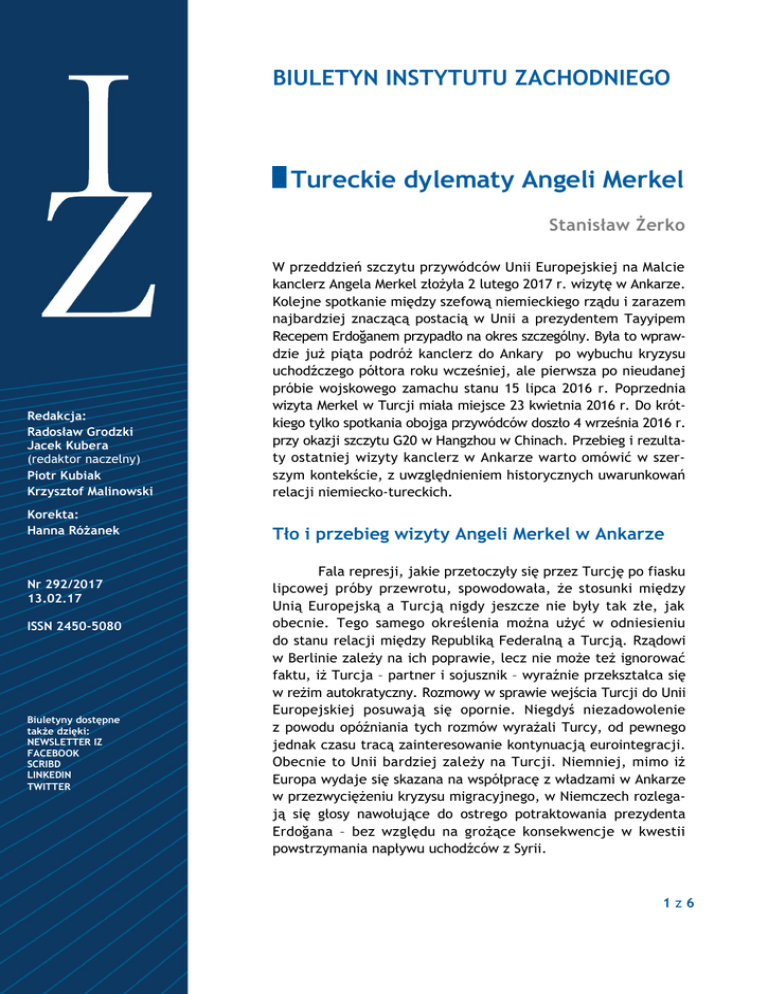 BIULETYN INSTYTUTU ZACHODNIEGO Tureckie dylematy Angeli Merkel Stanisław Żerko Redakcja: Radosław Grodzki Jacek Kubera (redaktor naczelny) Piotr Kubiak Krzysztof Malinowski W przeddzień szczytu przywódców Unii Europejskiej na Malcie kanclerz Angela Merkel złożyła 2 lutego 2017 r. wizytę w Ankarze. Kolejne spotkanie między szefową niemieckiego rządu i zarazem najbardziej znaczącą postacią w Unii a prezydentem Tayyipem Recepem Erdoğanem przypadło na okres szczególny. Była to wprawdzie już piąta podróż kanclerz do Ankary po wybuchu kryzysu uchodźczego półtora roku wcześniej, ale pierwsza po nieudanej próbie wojskowego zamachu stanu 15 lipca 2016 r. Poprzednia wizyta Merkel w Turcji miała miejsce 23 kwietnia 2016 r. Do krótkiego tylko spotkania obojga przywódców doszło 4 września 2016 r. przy okazji szczytu G20 w Hangzhou w Chinach. Przebieg i rezultaty ostatniej wizyty kanclerz w Ankarze warto omówić w szerszym kontekście, z uwzględnieniem historycznych uwarunkowań relacji niemiecko-tureckich. Korekta: Hanna Różanek Tło i przebieg wizyty Angeli Merkel w Ankarze Nr 292/2017 13.02.17 ISSN 2450-5080 Biuletyny dostępne także dzięki: NEWSLETTER IZ FACEBOOK SCRIBD LINKEDIN TWITTER Fala represji, jakie przetoczyły się przez Turcję po fiasku lipcowej próby przewrotu, spowodowała, że stosunki między Unią Europejską a Turcją nigdy jeszcze nie były tak złe, jak obecnie. Tego samego określenia można użyć w odniesieniu do stanu relacji między Republiką Federalną a Turcją. Rządowi w Berlinie zależy na ich poprawie, lecz nie może też ignorować faktu, iż Turcja – partner i sojusznik – wyraźnie przekształca się w reżim autokratyczny. Rozmowy w sprawie wejścia Turcji do Unii Europejskiej posuwają się opornie. Niegdyś niezadowolenie z powodu opóźniania tych rozmów wyrażali Turcy, od pewnego jednak czasu tracą zainteresowanie kontynuacją eurointegracji. Obecnie to Unii bardziej zależy na Turcji. Niemniej, mimo iż Europa wydaje się skazana na współpracę z władzami w Ankarze w przezwyciężeniu kryzysu migracyjnego, w Niemczech rozlegają się głosy nawołujące do ostrego potraktowania prezydenta Erdoğana – bez względu na grożące konsekwencje w kwestii powstrzymania napływu uchodźców z Syrii. 1z6 Procesy zachodzące w Turcji spotkały się na ogół z potępieniem w Republice Federalnej. Krytycznych uwag pod adresem Erdoğana nie szczędzili zarówno przedstawiciele obu partii rządzących, jak też ugrupowań opozycyjnych. Z kolei Turcja oskarża Berlin o pośrednie wspieranie terroryzmu poprzez udzielanie schronienia zwolennikom kaznodziei Fethullaha Gülena, któremu Ankara zarzuca inspirowanie lipcowego puczu. Domaga się też wydania ok. 40 pracujących w instytucjach natowskich tureckich wojskowych oraz dwóch prokuratorów, którzy poprosili w Niemczech o azyl polityczny. Atmosferę rozmów komentatorzy oceniali jako chłodną, ale rzeczową. Afrontem wobec kanclerz był rzucający się w oczy brak niemieckich flag, zwyczajowo wywieszanych podczas poprzednich wizyt Merkel. Stale korygowany był też program wizyty, tak aby szefowa niemieckiego rządu musiała czekać na swych tureckich rozmówców. W rozmowach oraz podczas konferencji prasowych Angela Merkel apelowała o przestrzeganie swobód i praw obywatelskich, w tym wolności prasy, a także wzywała do respektowania zasady trójpodziału władzy. W gmachu niemieckiej ambasady spotkała się też z przedstawicielami opozycji, w tym z jednym z przywódców prokurdyjskiej partii HDP Irisem Balkenem, który kilka dni wcześniej został (po trzech miesiącach) zwolniony z więzienia. Podczas dwuipółgodzinnej rozmowy z Erdoğanem Merkel zaproponowała, by zapowiedziane w Turcji na kwiecień referendum w sprawie wzmocnienia władzy prezydenta mogło być monitorowane przez OBWE. Erdoğan z kolei prosił o udzielenie Turcji wsparcia w jej „walce z terroryzmem”, niedwuznacznie sugerując, jakoby jego kraj walkę tę prowadził samotnie. Prezydent oznajmił jednak, że jego rząd zamierza przestrzegać zawartego w marcu 2016 r. porozumienia z Unią Europejską o ograniczeniu napływu uchodźców i migrantów drogą morską z wybrzeży tureckich do Grecji, a stamtąd do zamożnych państw zachodniej Europy. Jak się ocenia, wskutek działań władz tureckich liczbę migrantów zdążających do Europy tą drogą udało się ograniczyć o ok. 90 proc. („Der Spiegel” nr 5/2017). Na konferencji prasowej z premierem Binalim Yıldırımem Merkel powiedziała, że Niemcy ze swej strony będą przyjmować z Turcji każdego miesiąca po 500 uciekinierów z Syrii. Historyczne uwarunkowania relacji między Berlinem a Ankarą Stosunki niemiecko-tureckie obfitowały w ostatnich dziesięcioleciach w zaskakujące zwroty. Podwaliny pod zbliżenie między dwoma państwami położył już Otto von Bismarck, któremu strona turecka zawdzięczała ograniczenie na kongresie berlińskim w 1878 r. negatywnych konsekwencji przegranej przez Turcję wojny z Rosją. W słabnącym kraju, będącym cieniem dawnego Imperium Osmańskiego, mógł umacniać swą pozycję kapitał niemiecki, a projekt kolei Berlin-Bagdad przeszedł do historii jako próba ekspansji Rzeszy w kierunku Bliskiego i Środkowego Wschodu. Do zbliżenia z Niemcami parł zwłaszcza nacjonalistyczny ruch tzw. młodoturków, którzy doszli do władzy w 1913 r., a I wojna światowa przyniosła już niemiecko-tureckie braterstwo broni. Dopiero niedawno niemieccy historycy zaczęli ujawniać fakty, świadczące o pewnej współodpowiedzialności wilhelmińskiej Rzeszy za dokonaną przez Turków 2z6 masakrę półtora miliona Ormian w latach 1915-1916. Dysponując informacjami o zorganizowanej zbrodniczej akcji, dyplomacja niemiecka nie próbowała jej powstrzymać. Po Wielkiej Wojnie stosunki między obydwoma państwami rozluźniły się. U progu II wojny światowej władze w Ankarze zbliżyły się do moca