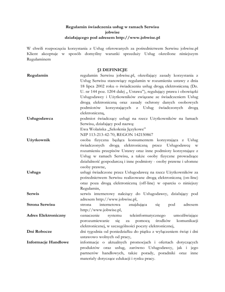 Regulamin świadczenia usług w ramach Serwisu jobwise