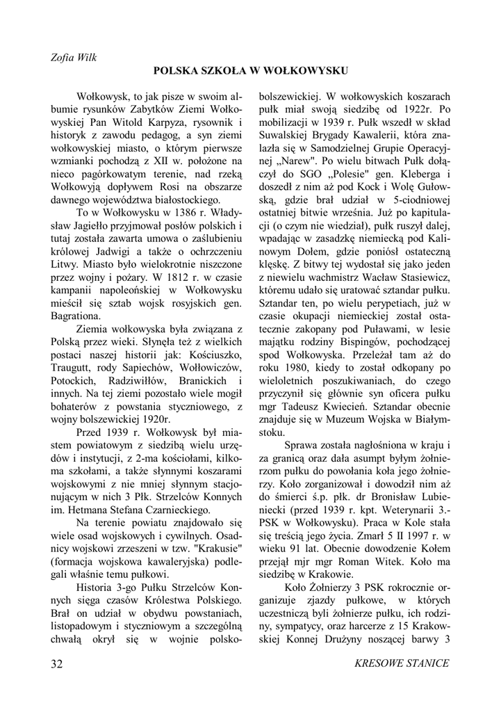 Zofia Wilk POLSKA SZKOŁA W WOŁKOWYSKU Wołkowysk, to jak pisze w swoim albumie rysunków Zabytków Ziemi Wołkowyskiej Pan Witold Karpyza, rysownik i historyk z zawodu pedagog, a syn ziemi wołkowyskiej miasto, o którym pierwsze wzmianki pochodzą z XII w. położone na nieco pagórkowatym terenie, nad rzeką Wołkowyją dopływem Rosi na obszarze dawnego województwa białostockiego. To w Wołkowysku w 1386 r. Władysław Jagiełło przyjmował posłów polskich i tutaj została zawarta umowa o zaślubieniu królowej Jadwigi a także o ochrzczeniu Litwy. Miasto było wielokrotnie niszczone przez wojny i pożary. W 1812 r. w czasie kampanii napoleońskiej w Wołkowysku mieścił się sztab wojsk rosyjskich gen. Bagrationa. Ziemia wołkowyska była związana z Polską przez wieki. Słynęła też z wielkich postaci naszej historii jak: Kościuszko, Traugutt, rody Sapiechów, Wołłowiczów, Potockich, Radziwiłłów, Branickich i innych. Na tej ziemi pozostało wiele mogił bohaterów z powstania styczniowego, z wojny bolszewickiej 1920r. Przed 1939 r. Wołkowysk był miastem powiatowym z siedzibą wielu urzędów i instytucji, z 2-ma kościołami, kilkoma szkołami, a także słynnymi koszarami wojskowymi z nie mniej słynnym stacjonującym w nich 3 Płk. Strzelców Konnych im. Hetmana Stefana Czarnieckiego. Na terenie powiatu znajdowało się wiele osad wojskowych i cywilnych. Osadnicy wojskowi zrzeszeni w tzw. "Krakusie" (formacja wojskowa kawaleryjska) podlegali właśnie temu pułkowi. Historia 3-go Pułku Strzelców Konnych sięga czasów Królestwa Polskiego. Brał on udział w obydwu powstaniach, listopadowym i styczniowym a szczególną chwałą okrył się w wojnie polsko- 32 bolszewickiej. W wołkowyskich koszarach pułk miał swoją siedzibę od 1922r. Po mobilizacji w 1939 r. Pułk wszedł w skład Suwalskiej Brygady Kawalerii, która znalazła się w Samodzielnej Grupie Operacyjnej „Narew". Po wielu bitwach Pułk dołączył do SGO „Polesie" gen. Kleberga i doszedł z nim aż pod Kock i Wolę Gułowską, gdzie brał udział w 5-ciodniowej ostatniej bitwie września. Już po kapitulacji (o czym nie wiedział), pułk ruszył dalej, wpadając w zasadzkę niemiecką pod Kalinowym Dołem, gdzie poniósł ostateczną klęskę. Z bitwy tej wydostał się jako jeden z niewielu wachmistrz Wacław Stasiewicz, któremu udało się uratować sztandar pułku. Sztandar ten, po wielu perypetiach, już w czasie okupacji niemieckiej został ostatecznie zakopany pod Puławami, w lesie majątku rodziny Bispingów, pochodzącej spod Wołkowyska. Przeleżał tam aż do roku 1980, kiedy to został odkopany po wieloletnich poszukiwaniach, do czego przyczynił się głównie syn oficera pułku mgr Tadeusz Kwiecień. Sztandar obecnie znajduje się w Muzeum Wojska w Białymstoku. Sprawa została nagłośniona w kraju i za granicą oraz dała asumpt byłym żołnierzom pułku do powołania koła jego żołnierzy. Koło zorganizował i dowodził nim aż do śmierci ś.p. płk. dr Bronisław Lubieniecki (przed 1939 r. kpt. Weterynarii 3.PSK w Wołkowysku). Praca w Kole stała się treścią jego życia. Zmarł 5 II 1997 r. w wieku 91 lat. Obecnie dowodzenie Kołem przejął mjr mgr Roman Witek. Koło ma siedzibę w Krakowie. Koło Żołnierzy 3 PSK rokrocznie organizuje zjazdy pułkowe, w których uczestniczą byli żołnierze pułku, ich rodziny, sympatycy, oraz harcerze z 15 Krakowskiej Konnej Drużyny noszącej barwy 3 KRESOWE STANICE PSK z dh.hm. Dariuszem Waligórskim i Ks. phm. Maciejem Kozickim kapelanem harcerstwa. W roku 1994 po wielu staraniach udało się zorganizować, pierwszy raz po wojnie, zjazd (już jako XV) na Ziemi Wołkowyskiej. Był on ziszczeniem marzeń już nielicznie żyjących żołnierzy pułku. Miałam szczęście uczestniczyć w tym Zjeździe jako sympatyk Koła i córka żołnierza pułku. Mój ojciec należący do „Krakusa” podlegał 3 PSK. Zjazd odbył się w dn. 14-18 IX i obfitował w ogromne przeżycia i wzruszenia. Zwiedzanie wielu miejsc pamięci, dla żołnierzy zaś szczególnie ich koszar (gdzie niespodziewanie serdecznie przyjęło nas dowództwo jednostki białoruskiej), spotkania z Polakami na zorganizowanych dla nas przez Oddział Związku Polaków w Wołkowysku koncertach, pozostawiły niezapomniane wrażenia. Wołkowysk rozbudowany, Polacy dobrze zorganizowani (stanowią ok. 30% ludności), język polski wszystkim znany, rozwija się wspaniale polska kultura, patriotyzm starszego i młodego pokolenia godny pozazdroszczenia. Polacy podejmowali nas bardzo serdecznie, po wspaniałym koncercie polskich zespołów artystycznych (poezja, śpiew i taniec) nastąpiły rozmowy, pytania, zwierzenia, łzy i jedna wielka błagalna prośba: pomóżcie nam zbudować polską szkolę, prosimy was pomóżcie. Tyle polskich dzieci, a nie ma polskiej szkoły. Jeszcze tego samego wieczoru w naszym miejscu zakwaterowania w Rosi, uczestnicy Zjazdu podjęli uchwalę o objęciu patronatu nad budową szkoły polskiej w Wołkowysku przez Koło 3 PSK oraz zorganizowali pierwszą zbiórkę na ten cel. Po powrocie decyzja ta została potwierdzona rozkazem pułkowym Nr 2/94 z dnia 11 XI 1994 r. wraz z powołaniem Komitetu Pomocy Budowy Szkoły Polskiej w Wołkowysku, w skład którego weszło 5 osób. KRESOWE STANICE W rozkazie czytamy „Komitet będzie działał w ramach Koła Żołnierzy Pułku, jest otwarty dla wszystkich, którzy zgłoszą akces do jego prac a jego zadaniem będzie pozyskanie środków finansowych i rzeczowych dla szkoły polskiej w Wołkowysku. Komitet działa bardzo prężnie. Rozpropagował sprawę w kraju i za granicą, występował wielokrotnie w sprawie sfinansowania budowy szkoły do Wspólnoty Polskiej w Warszawie, zbiera i gromadzi fundusze oraz utrzymuje stały kontakt z Oddziałem Związku Polaków w Wołkowysku”. Wszystkie datki na szkołę gromadzone są na koncie bankowym w Krakowie założonym przez komitet. Zgromadzono już ponad 10000 z