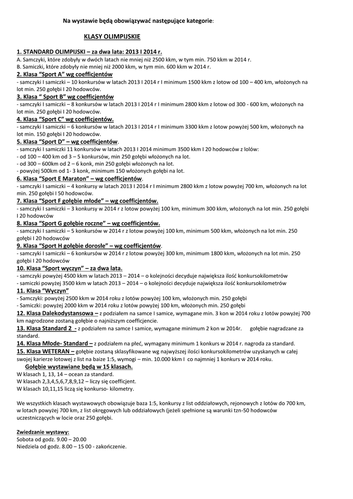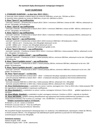 Na wystawie będą obowiązywać następujące kategorie: KLASY OLIMPIJSKIE 1. STANDARD OLIMPIJSKI – za dwa lata: 2013 I 2014 r. A. Samczyki, które zdobyły w dwóch latach nie mniej niż 2500 kkm, w tym min. 750 kkm w 2014 r. B. Samiczki, które zdobyły nie mniej niż 2000 kkm, w tym min. 600 kkm w 2014 r. 2. Klasa “Sport A” wg coefficjentów - samczyki I samiczki – 10 konkursów w latach 2013 I 2014 r I minimum 1500 kkm z lotow od 100 – 400 km, włożonych na lot min. 250 gołębi I 20 hodowców. 3. Klasa “ Sport B” wg coefficjentów - samczyki I samiczki – 8 konkursów w latach 2013 I 2014 r I minimum 2800 kkm z lotow od 300 - 600 km, włożonych na lot min. 250 gołębi I 20 hodowców. 4. Klasa “Sport C” wg coefficjentów. - samczyki I samiczki – 6 konkursów w latach 2013 I 2014 r I minimum 3300 kkm z lotow powyżej 500 km, włożonych na lot min. 150 gołębi I 20 hodowców. 5. Klasa “Sport D” – wg coefficjentów. - samczyki I samiczki 11 konkursów w latach 2013 I 2014 minimum 3500 kkm I 20 hodowców z lolów: - od 100 – 400 km od 3 – 5 konkursów, min 250 gołębi włożonych na lot. - od 300 – 600km od 2 – 6 konk, min 250 gołębi włożonych na lot. - powyżej 500km od 1- 3 konk, minimum 150 włożonych gołębi na lot. 6. Klasa “Sport E Maraton” – wg coefficjentów. - samczyki I samiczki – 4 konkursy w latach 2013 I 2014 r I minimum 2800 kkm z lotow powyżej 700 km, włożonych na lot min. 250 gołębi I 50 hodowców. 7. Klasa “Sport F gołębie młode” – wg coefficjentów. - samczyki I samiczki – 3 konkursy w 2014 r z lotow powyżej 100 km, minimum 300 kkm, włożonych na lot min. 250 gołębi I 20 hodowców 8. Klasa “Sport G gołębie roczne” – wg coefficjentów. - samczyki I samiczki – 5 konkursów w 2014 r z lotow powyżej 100 km, minimum 500 kkm, włożonych na lot min. 250 gołębi I 20 hodowców 9. Klasa “Sport H gołębie dorosłe” – wg coefficjentów. - samczyki I samiczki – 6 konkursów w 2014 r z lotow powyżej 300 km, minimum 1800 kkm, włożonych na lot min. 250 gołębi I 20 hodowców 10. Klasa “Sport wyczyn” – za dwa lata. - samczyki powyżej 4500 kkm w latach 2013 – 2014 – o kolejności decyduje największa ilość konkursokilometrów - samiczki powyżej 3500 kkm w latach 2013 – 2014 – o kolejności decyduje największa ilość konkursokilometrów 11. Klasa “Wyczyn” - Samczyki: powyżej 2500 kkm w 2014 roku z lotów powyżej 100 km, włożonych min. 250 gołębi - Samiczki: powyżej 2000 kkm w 2014 roku z lotów powyżej 100 km, włożonych min. 250 gołębi 12. Klasa Dalekodystansowa – z podziałem na samce I samice, wymagane min. 3 kon w 2014 roku z lotów powyżej 700 km nagrodzone zostaną gołębie o najniższym coefficjencie. 13. Klasa Standard 2 - z podziałem na samce I samice, wymagane minimum 2 kon w 2014r. gołębie nagradzane za standard. 14. Klasa Młode- Standard – z podziałem na płeć, wymagany minimum 1 konkurs w 2014 r. nagroda za standard. 15. Klasa WETERAN – gołębie zostaną sklasyfikowane wg najwyższej ilości konkursokilometrów uzyskanych w całej swojej karierze lotowej z list na baize 1:5, wymogi – min. 10.000 kkm I co najmniej 1 konkurs w 2014 roku. Gołębie wystawiane będą w 15 klasach. W klasach 1, 13, 14 – ocean za standard. W klasach 2,3,4,5,6,7,8,9,12 – liczy się coefficjent. W klasach 10,11,15 liczą się konkurso- kilometry. We wszystkich klasach wystawowych obowiązuje baza 1:5, konkursy z list oddziałowych, rejonowych z lotów do 700 km, w lotach powyżej 700 km, z list okręgowych lub oddziałowych (jeżeli spełnione są warunki tzn-50 hodowców uczestniczących w locie oraz 250 gołębi. Zwiedzanie wystawy: Sobota od godz. 9.00 – 20.00 Niedziela od godz. 8.00 – 15 00 - zakończenie. UWAGI ORGZNIZACYJNE: 1. 2. Klasy od 1 do 10 są bezpłatne W klasach od 11 do 15 opłata od gołębia 5 zł, opłatę należy uiścić w dniu dostarczenia dokumentacji wystawowej do okręgu. 3. Zarządy Oddziałów skompletują całą dokumentację wystawową składającą się z deklaracji zgłoszeniowych poszczególnych hodowców wraz z deklaracjami na poszczególne gołębie I po sprawdzeniu jej I podpisaniu dostarczą osobiście do siedziby Okręgu Tarnów ul. Kolejowa w dniu 25.11.2014 (wtorek) godz. 17.00 4. Obowiązujące listy konkursowe za lata 2013 – 2014 dostarczy Okręg Tarnów ( V-ce Prezes d/s Lotowych Okręgu Tarnów - Marcin Rzepka). 5. Zarząd Okręgu planuje wystawić reprezentację na Wystawę Ogólnopolską w Styczniu 2015 r, we wszystkich klasach olimpijskich tj.: Standard Olimpijski samczyki I samiczki po 5 gołębi. Sport Olimpijski - Kat.- A,B,C,D,E,F,G,H, oraz Sport Wyczyn za dwa lata po 3 gołębie w klasie. 6. Termin dostarczenia gołębi na Wystawę Okręgową – 05.12.2014 godz. 14.00 – 17.00. 7. Wręczenie nagród z wystawy oraz za współzawodnictwo Okręgu Tarnów za sezon lotowy 2014 odbędzie się w dniu 7 grudzień (niedziela)2014 r, o godz., 13.00 8. Odbiór gołębi z wystawy w niedzielę godz., 16.00 9. Zobowiązuje się Zarządy Oddziałów do poinformowania swoich członków, których gołębie zostały zakwalifikowane na Wystawę Ogólnopolską, że mają obowiązkowo dostarczyć swoje gołębię na wyznaczone miejsce. Hodowcy którzy nie będą mogli wystawić swoich gołębi na Wystawę Ogólnopolską z przyczyn losowych, muszą to zgłosić niezwłocznie. 10. Adresy Korespondencyjne Organizatora Wystawy; Przewodniczący Wystawy: Sekretarz; Skarbnik; Porębski Stanisław Kubies Mariusz Grodny Andrzej tel. 504 756 218 tel. 661 478 725 tel. 600 385 840 Adres Wystawy: Dom Strażaka w Dębnie Dębno 260 32-852 Dębno