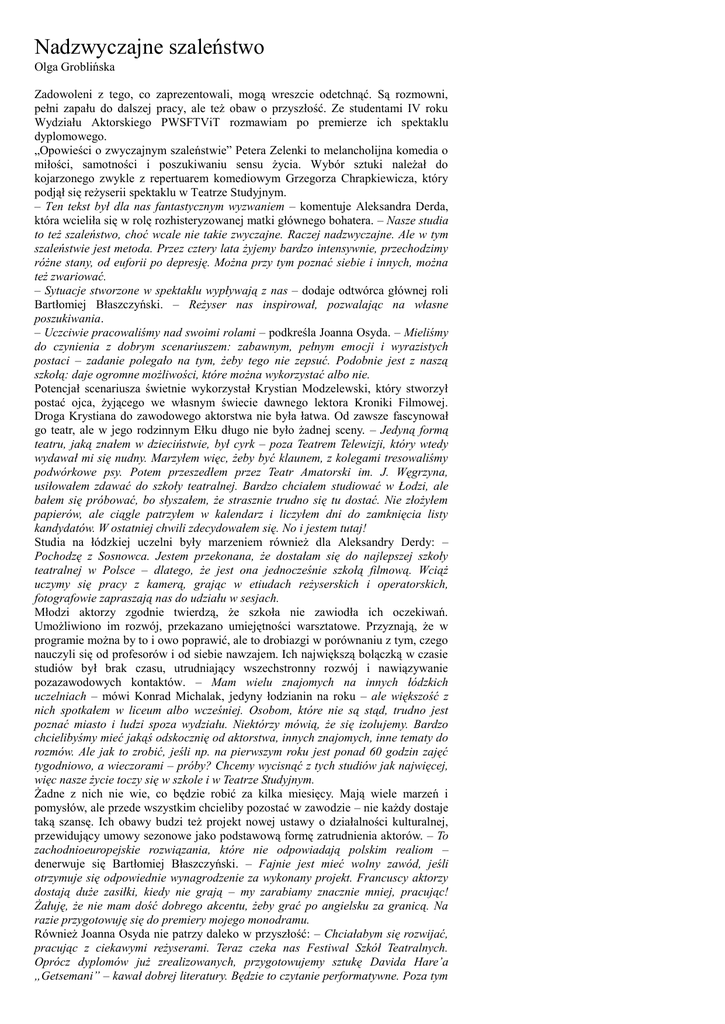 Nadzwyczajne szaleństwo Olga Groblińska Zadowoleni z tego, co zaprezentowali, mogą wreszcie odetchnąć. Są rozmowni, pełni zapału do dalszej pracy, ale też obaw o przyszłość. Ze studentami IV roku Wydziału Aktorskiego PWSFTViT rozmawiam po premierze ich spektaklu dyplomowego. „Opowieści o zwyczajnym szaleństwie” Petera Zelenki to melancholijna komedia o miłości, samotności i poszukiwaniu sensu życia. Wybór sztuki należał do kojarzonego zwykle z repertuarem komediowym Grzegorza Chrapkiewicza, który podjął się reżyserii spektaklu w Teatrze Studyjnym. – Ten tekst był dla nas fantastycznym wyzwaniem – komentuje Aleksandra Derda, która wcieliła się w rolę rozhisteryzowanej matki głównego bohatera. – Nasze studia to też szaleństwo, choć wcale nie takie zwyczajne. Raczej nadzwyczajne. Ale w tym szaleństwie jest metoda. Przez cztery lata żyjemy bardzo intensywnie, przechodzimy różne stany, od euforii po depresję. Można przy tym poznać siebie i innych, można też zwariować. – Sytuacje stworzone w spektaklu wypływają z nas – dodaje odtwórca głównej roli Bartłomiej Błaszczyński. – Reżyser nas inspirował, pozwalając na własne poszukiwania. – Uczciwie pracowaliśmy nad swoimi rolami – podkreśla Joanna Osyda. – Mieliśmy do czynienia z dobrym scenariuszem: zabawnym, pełnym emocji i wyrazistych postaci – zadanie polegało na tym, żeby tego nie zepsuć. Podobnie jest z naszą szkołą: daje ogromne możliwości, które można wykorzystać albo nie. Potencjał scenariusza świetnie wykorzystał Krystian Modzelewski, który stworzył postać ojca, żyjącego we własnym świecie dawnego lektora Kroniki Filmowej. Droga Krystiana do zawodowego aktorstwa nie była łatwa. Od zawsze fascynował go teatr, ale w jego rodzinnym Ełku długo nie było żadnej sceny. – Jedyną formą teatru, jaką znałem w dzieciństwie, był cyrk – poza Teatrem Telewizji, który wtedy wydawał mi się nudny. Marzyłem więc, żeby być klaunem, z kolegami tresowaliśmy podwórkowe psy. Potem przeszedłem przez Teatr Amatorski im. J. Węgrzyna, usiłowałem zdawać do szkoły teatralnej. Bardzo chciałem studiować w Łodzi, ale bałem się próbować, bo słyszałem, że strasznie trudno się tu dostać. Nie złożyłem papierów, ale ciągle patrzyłem w kalendarz i liczyłem dni do zamknięcia listy kandydatów. W ostatniej chwili zdecydowałem się. No i jestem tutaj! Studia na łódzkiej uczelni były marzeniem również dla Aleksandry Derdy: – Pochodzę z Sosnowca. Jestem przekonana, że dostałam się do najlepszej szkoły teatralnej w Polsce – dlatego, że jest ona jednocześnie szkołą filmową. Wciąż uczymy się pracy z kamerą, grając w etiudach reżyserskich i operatorskich, fotografowie zapraszają nas do udziału w sesjach. Młodzi aktorzy zgodnie twierdzą, że szkoła nie zawiodła ich oczekiwań. Umożliwiono im rozwój, przekazano umiejętności warsztatowe. Przyznają, że w programie można by to i owo poprawić, ale to drobiazgi w porównaniu z tym, czego nauczyli się od profesorów i od siebie nawzajem. Ich największą bolączką w czasie studiów był brak czasu, utrudniający wszechstronny rozwój i nawiązywanie pozazawodowych kontaktów. – Mam wielu znajomych na innych łódzkich uczelniach – mówi Konrad Michalak, jedyny łodzianin na roku – ale większość z nich spotkałem w liceum albo wcześniej. Osobom, które nie są stąd, trudno jest poznać miasto i ludzi spoza wydziału. Niektórzy mówią, że się izolujemy. Bardzo chcielibyśmy mieć jakąś odskocznię od aktorstwa, innych znajomych, inne tematy do rozmów. Ale jak to zrobić, jeśli np. na pierwszym roku jest ponad 60 godzin zajęć tygodniowo, a wieczorami – próby? Chcemy wycisnąć z tych studiów jak najwięcej, więc nasze życie toczy się w szkole i w Teatrze Studyjnym. Żadne z nich nie wie, co będzie robić za kilka miesięcy. Mają wiele marzeń i pomysłów, ale przede wszystkim chcieliby pozostać w zawodzie – nie każdy dostaje taką szansę. Ich obawy budzi też projekt nowej ustawy o działalności kulturalnej, przewidujący umowy sezonowe jako podstawową formę zatrudnienia aktorów. – To zachodnioeuropejskie rozwiązania, które nie odpowiadają polskim realiom – denerwuje się Bartłomiej Błaszczyński. – Fajnie jest mieć wolny zawód, jeśli otrzymuje się odpowiednie wynagrodzenie za wykonany projekt. Francuscy aktorzy dostają duże zasiłki, kiedy nie grają – my zarabiamy znacznie mniej, pracując! Żałuję, że nie mam dość dobrego akcentu, żeby grać po angielsku za granicą. Na razie przygotowuję się do premiery mojego monodramu. Również Joanna Osyda nie patrzy daleko w przyszłość: – Chciałabym się rozwijać, pracując z ciekawymi reżyserami. Teraz czeka nas Festiwal Szkół Teatralnych. Oprócz dyplomów już zrealizowanych, przygotowujemy sztukę Davida Hare’a „Getsemani” – kawał dobrej literatury. Będzie to czytanie performatywne. Poza tym już niedługo przy ul. Struga 90 ponownie zacznie działać Teatr Szwalnia, któremu bardzo kibicuję. Mam nadzieję, że łodzianie docenią tę inicjatywę i będą tam zaglądać.