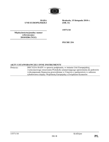 RADA UNII EUROPEJSKIEJ Bruksela, 15 listopada 2010 r. (OR. fr) 15571/10 Międzyinstytucjonalny numer referencyjny: 2010/0286 (NLE) PECHE 254 AKTY USTAWODAWCZE I INNE INSTRUMENTY Dotyczy: DECYZJA RADY w sprawie podpisania, w imieniu Unii Europejskiej, i tymczasowego stosowania Protokołu ustanawiającego uprawnienia do połowów i rekompensatę finansową przewidziane w Umowie o partnerstwie w sektorze rybołówstwa między Wspólnotą Europejską a Związkiem Komorów 15571/10 KAD/jaw DG B PL DECYZJA RADY nr …/2010/UE z dnia w sprawie podpisania, w imieniu Unii Europejskiej, i tymczasowego stosowania Protokołu ustanawiającego uprawnienia do połowów i rekompensatę finansową przewidziane w Umowie o partnerstwie w sektorze rybołówstwa między Wspólnotą Europejską a Związkiem Komorów RADA UNII EUROPEJSKIEJ, uwzględniając Traktat o funkcjonowaniu Unii Europejskiej, w szczególności jego art. 43 w związku z art. 218 ust. 5, uwzględniając wniosek Komisji Europejskiej, 15571/10 KAD/jaw DG B 1 PL a także mając na uwadze, co następuje: (1) W dniu 5 października 2006 r. Rada przyjęła rozporządzenie (WE) nr 1563/2006 w sprawie zawarcia Umowy o partnerstwie w sektorze rybołówstwa między Wspólnotą Europejską a Związkiem Komorów1 (2) Protokół załączony do tej umowy wygasa w dniu 31 grudnia 2010 r. (3) Unia Europejska negocjowała ze Związkiem Komorów (zwanym dalej „Komorami”) nowy protokół przyznający statkom UE uprawnienia do połowów na wodach objętych zwierzchnictwem i jurysdykcją Związku Komorów w zakresie rybołówstwa. Aby statki UE mogły kontynuować działalność połowową, art. 13 nowego protokołu przewiduje jego tymczasowe stosowanie. (4) W wyniku negocjacji nowy protokół został parafowany w dniu 21 maja 2010 r. i zmieniony poprzez wymianę listów w dniu 16 września 2010 r. (5) W oczekiwaniu na zakończenie procedur niezbędnych do jego zawarcia, nowy protokół powinien zostać podpisany i tymczasowo stosowany, PRZYJMUJE NINIEJSZĄ DECYZJĘ: 1 Dz.U. L 290 z 20.10.2006, s. 6. 15571/10 KAD/jaw DG B 2 PL Artykuł 1 Niniejszym zatwierdza się w imieniu Unii Europejskiej podpisanie Protokołu ustalającego uprawnienia do połowów i rekompensatę finansową przewidziane w Umowie o partnerstwie w sektorze rybołówstwa między Wspólnotą Europejską a Związkiem Komorów, z zastrzeżeniem zawarcia tego protokołu. Tekst protokołu dołącza się do niniejszej decyzji. Artykuł 2 Niniejszym upoważnia się przewodniczącego Rady do wyznaczenia osoby lub osób umocowanych do podpisania protokołu w imieniu Unii Europejskiej, z zastrzeżeniem jego zawarcia. Artykuł 3 W oczekiwaniu na zakończenie procedur niezbędnych do jego zawarcia, protokół jest tymczasowo stosowany zgodnie z jego art. 13. Artykuł 4 Niniejsza decyzja wchodzi w życie z dniem jej przyjęcia. Sporządzono w … dnia … W imieniu Rady Przewodniczący ________________________ 15571/10 KAD/jaw DG B 3 PL PROTOKÓŁ USTALAJĄCY UPRAWNIENIA DO POŁOWÓW I REKOMPENSATĘ FINANSOWĄ PRZEWIDZIANE W UMOWIE O PARTNERSTWIE W SEKTORZE RYBOŁÓWSTWA MIĘDZY WSPÓLNOTĄ EUROPEJSKĄ A ZWIĄZKIEM KOMORÓW P/EU/KM/pl 1 ARTYKUŁ 1 Okres stosowania i uprawnienia do połowów 1. Przez okres 3 lat uprawnienia do połowów przyznane statkom Unii Europejskiej na mocy art. 5 umowy o partnerstwie w sektorze rybołówstwa ustala się w następujący sposób: – sejnery tuńczykowe: 45 statków – taklowce powierzchniowe: 25 statków. 2. Ust. 1 stosuje się z zastrzeżeniem postanowień art. 5, 6, 8 i 9 niniejszego protokołu. ARTYKUŁ 2 Rekompensata finansowa – warunki płatności 1. Ustala się rekompensatę finansową, o której mowa w art. 7 umowy o partnerstwie w sektorze rybołówstwa, na okres, o którym mowa w art. 1, w wysokości 1 845 750 EUR. 2. Rekompensata finansowa obejmuje: a) roczną kwotę z tytułu dostępu do w.s.e. Komorów w wysokości 315 250 EUR, stanowiącą równoważność pojemności referencyjnej 4 850 ton rocznie, oraz P/EU/KM/pl 2 b) specjalną kwotę w wysokości 300 000 EUR rocznie przeznaczoną na wsparcie realizacji sektorowej polityki rybołówstwa Komorów. 3. Ust. 1 stosuje się z zastrzeżeniem postanowień art. 3, 4, 5 i 6 niniejszego protokołu oraz art. 12 i 13 umowy. 4. Rekompensata finansowa, o której mowa w ust. 1, jest wypłacana przez Unię Europejską co roku w okresie stosowania niniejszego protokołu, w kwocie 615 250 EUR odpowiadającej sumie rocznych kwot, o których mowa w ust. 2 lit. a) i b). 5. Jeżeli całkowita wielkość połowów statków Unii Europejskiej na wodach Komorów przekracza 4 850 ton rocznie, łączna kwota rocznej rekompensaty finansowej zostanie zwiększona o 65 EUR za każdą dodatkową tonę połowu. Łączna roczna kwota wypłacana przez Unię Europejską nie może być jednak wyższa niż dwukrotność kwoty wskazanej w ust. 2 lit. a) (630 500 EUR). W przypadku gdy wielkość połowów statków Unii Europejskiej przekracza ilość odpowiadającą dwukrotności łącznej rocznej kwoty, kwota należna za nadwyżkę ponad ten limit jest wypłacana w roku następnym. 6. Płatność za pierwszy rok jest dokonywana najpóźniej 30 dni po wejściu w życie protokołu, a w latach następnych – najpóźniej do dnia rocznicy wejścia w życie protokołu. 7. Przeznaczenie rekompensaty finansowej, o której mowa w ust. 2 lit. a), podlega wyłącznej kompetencji władz Komorów. P/EU/KM/pl 3 8. Całość rekompensaty finansowej wskazanej w art. 2 ust. 2 niniejszego protokołu jest przelewana na rachunek odrębny Skarbu Państwa otwarty w Banque Centrale des Comores. 9. Kwota odpowiadająca rekompensacie finansowej, o której mowa w art. 2 lit. b), zostanie przelana z tego rachunku odrębnego na rachunek TR 5006 otwarty w banku centralnym przez ministerstwo odpowiedzialne za rybołówstwo. ARTYKUŁ 3 Propagowanie odpowiedzialnego i zrównoważonego rybołówstwa na wodach Komorów 1. Strony uzgadniają w ramach wspólnego ko