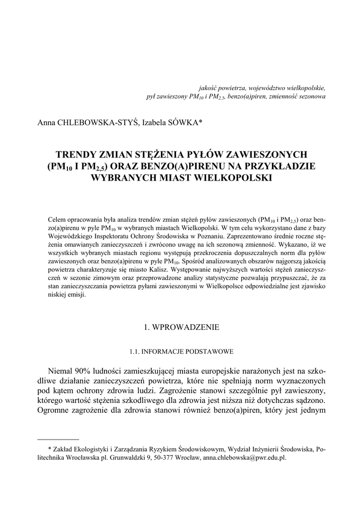 jakość powietrza, województwo wielkopolskie, pył zawieszony PM10 i PM2,5, benzo(a)piren, zmienność sezonowa Anna CHLEBOWSKA-STYŚ, Izabela SÓWKA* TRENDY ZMIAN STĘŻENIA PYŁÓW ZAWIESZONYCH (PM10 I PM2,5) ORAZ BENZO(A)PIRENU NA PRZYKŁADZIE WYBRANYCH MIAST WIELKOPOLSKI Celem opracowania była analiza trendów zmian stężeń pyłów zawieszonych (PM10 i PM2,5) oraz benzo(a)pirenu w pyle PM10 w wybranych miastach Wielkopolski. W tym celu wykorzystano dane z bazy Wojewódzkiego Inspektoratu Ochrony Środowiska w Poznaniu. Zaprezentowano średnie roczne stężenia omawianych zanieczyszczeń i zwrócono uwagę na ich sezonową zmienność. Wykazano, iż we wszystkich wybranych miastach regionu występują przekroczenia dopuszczalnych norm dla pyłów zawieszonych oraz benzo(a)pirenu w pyle PM10. Spośród analizowanych obszarów najgorszą jakością powietrza charakteryzuje się miasto Kalisz. Występowanie najwyższych wartości stężeń zanieczyszczeń w sezonie zimowym oraz przeprowadzone analizy statystyczne pozwalają przypuszczać, że za stan zanieczyszczania powietrza pyłami zawieszonymi w Wielkopolsce odpowiedzialne jest zjawisko niskiej emisji. 1. WPROWADZENIE 1.1. INFORMACJE PODSTAWOWE Niemal 90% ludności zamieszkującej miasta europejskie narażonych jest na szkodliwe działanie zanieczyszczeń powietrza, które nie spełniają norm wyznaczonych pod kątem ochrony zdrowia ludzi. Zagrożenie stanowi szczególnie pył zawieszony, którego wartość stężenia szkodliwego dla zdrowia jest niższa niż dotychczas sądzono. Ogromne zagrożenie dla zdrowia stanowi również benzo(a)piren, który jest jednym __________ * Zakład Ekologistyki i Zarządzania Ryzykiem Środowiskowym, Wydział Inżynierii Środowiska, Politechnika Wrocławska pl. Grunwaldzki 9, 50-377 Wrocław, [email protected]. Trendy zmian stężenia pyłów zawieszonych (PM10 i PM2,5) oraz benzo(a)pirenu… 41 z najgroźniejszych przedstawicieli wielopierścieniowych węglowodorów aromatycznych - charakteryzują go bowiem silne właściwości rakotwórcze [10, 16]. Zanieczyszczenia pyłowe zawierają w swym składzie części respirabilne, które z powietrzem trafiają do płuc powodując poważne szkody w organizmie. Wpływ pyłów na zdrowie determinowany jest wielkością ich ziaren. Cząstki o średnicy ziaren poniżej 2,5µm powodują największe problemy zdrowotne ponieważ wnikają głęboko do płuc dochodząc do pęcherzyków płucnych; część z nich przedostaje się do krwiobiegu. Ekspozycja na zanieczyszczenia pyłowe może powodować uszkodzenia układu oddechowego i krwionośnego, a nawet serca, zwłaszcza u dzieci, osób starszych czy chorujących na astmę. Większe frakcje pyłów podrażniają oczy, nos oraz gardło [2, 3]. Rośliny również są narażone na szkodliwe działanie zanieczyszczeń pyłowych, które osiadają na powierzchnie liści i blokują aparaty szparkowe, przez co zaburzają procesy fotosyntezy [15]. Warunki meteorologiczne mają istotny wpływ na eliminację cząstek pyłu z atmosfery, głównie poprzez procesy wymywania oraz inicjacje reakcji chemicznych [4, 13]. W wyniku opadania mogą powodować zakwaszenie jezior i rzek, zmieniać skład organiczny gleb, niszczyć wrażliwe drzewostany i uprawy oraz powodować zmiany w różnorodności ekosystemów. Ponadto powodują uszkodzenia budowli z kamienia lub betonu, które często mają istotną wartość historyczną i kulturową, a także znacznie obniżają widoczność. Wykazano również wpływ pyłów na zmiany klimatu [14]. Pyły składają się z ziaren i kropel tysięcy różnych związków chemicznym o różnorodnym kształcie i rozmiarze. Głównym źródłem emisji pierwotnych zanieczyszczeń pyłowych są pożary, pola uprawne, ścieranie opon samochodowych oraz emisja ze stacjonarnych źródeł przemysłowych [6]. Zanieczyszczenia pyłowe wtórne są wynikiem skomplikowanych przemian chemicznych i fizycznych prekursorów powstawania pyłu (głównie SO2 i NO2) zachodzących w atmosferze. Prekursory pyłu do atmosfery emitowane są z elektrowni, przemysłu oraz pojazdów samochodowych. W atmosferze charakter dominujący mają pyły wtórne [8, 11]. W związku z toksycznymi właściwościami pyłu drobnego oraz częstym przekraczaniem norm dopuszczalnych ustanowionych ze względu na ochronę zdrowia ludzi, analizy w zakresie identyfikacji źródeł emisji i tendencji zmian pyłu drobnego w powietrzu wzbudzają duże zainteresowanie zarówno wśród naukowców, jak i władz rządowych i samorządowych odpowiedzialnych za wprowadzanie programów ochrony powietrza, wdrażanie polityki ekologicznej oraz ochronę zdrowia publicznego [1, 7]. Ocena jakości powietrza w Polsce prowadzona jest zgodnie z kryteriami określonymi w dyrektywie Parlamentu Europejskiego i Rady 2008/50/WE z 21 maja 2008 roku w sprawie jakości powietrza i czystszego powietrza dla Europy oraz dyrektywie Parlamentu Europejskiego i Rady 2004/107/WE z 15 grudnia 2004 roku w sprawie arsenu, kadmu, niklu, rtęci i wielopierścieniowych węglowodorów aromatycznych w otaczającym powietrzu. Zgodnie z nimi dla pyłów zawieszonych (PM10 i PM2,5) I. CHLEBOWSKA-STYŚ, I. SÓWKA 42 oraz benzo(a)pirenu wyznaczono m.in. poziomy dopuszczalne, dopuszczalne wartości częstości przekraczania poziomu dopuszczalnego i marginesy tolerancji (tab. 1.) Tabela 1. Wartości kryterialne dla pyłów zawieszonych wyznaczone pod kątem ochrony zdrowia 2013 2014 Pył PM2,5 2012 Pył PM10 Poziom dopuszczalny [µg/m3] 2011 Nazwa substancji Margines tolerancji [µg/m3] Dopuszczalna częstość przekraczania poziomu dopuszczalnego w roku kalendarzowym 2010 Okres uśredniania wyników pomiarów 50 35 0 0 0 0 0 40 - 0 0 0 0 0 25 - 4 3 2 1 1 20 - 0 0 0 0 0 24 godziny rok kalendarzowy rok kalendarzowy rok kalendarzowy Tabela 2. Wartości kryterialne dla benzo(a)pirenu wyznaczone pod kątem ochrony zdrowia Nazwa substancji Okres uśredniania wyników pomiarowych Poziom docelowy