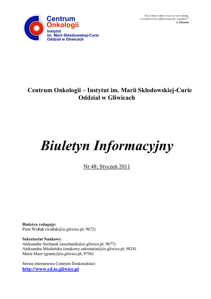“If we knew what it was we were doing, it would not be called research, would it?” A. Einstein Centrum Onkologii – Instytut im. Marii Skłodowskiej-Curie Oddział w Gliwicach Biuletyn Informacyjny Nr 48; Styczeń 2011 Biuletyn redaguje: Piotr Widłak ([email protected]; 9672) Sekretariat Naukowy Aleksander Sochanik ([email protected]; 9677) Aleksandra Miodońska ([email protected]; 9824) Maria Maor ([email protected]; 9756) Strona internetowa Centrum Doskonałości: http://www.cd.io.gliwice.pl 1. Informacja o zebraniach naukowych. ******************************************************************************* Seminaria Działu Badawczego (czwartki, godzina 9.15, Sala Wykładowa im. Święckiego) 13.01.2011 Iwona Mitrus (CBT): Liposomowa postać bisantracykliny WP760 o działaniu przeciwczerniakowym 20.01.2011 Piotr Widłak (CBT): Pracowna Proteomiki Klinicznej – prezentacja zespołu 28.01.2011 Stanisław Szala (CBT): Pracownia Terapii Doświadczalnej / Pracownia Guzów Mózgu – prezentacja zespołu ********************************************************************************* Kliniczne Zebrania Naukowe (środy, godzina 8.15, Sala Konsyliarna Przychodni): 05.01.2011 Michał Jarząb (III KRt): Przedoperacyjna chemio(radio)terapia w raku piersi jako model leczenia radykalnego: wykorzystanie metod diagnostyki i obrazowania molekularnego 12.01.2011 Magdalena Kustra (KOKiD): Uzupełniające leczenie systemowe chorych na raka piersi - aspekty praktyczne oraz perspektywy 19.01.2011 Klinika Chirurgii Onkologicznej i Rekonstrukcyjnej 27.01.2011 Krwiolecznictwo Piotr Widłak (CBT): Informacja o Centrum Badań Translacyjnych i Biologii Molekularnej Nowotworów. ****************************************************************************** Redakcja Biuletynu prosi o nadsyłanie informacji dotyczących seminariów i zebrań naukowych odbywających się we wszystkich jednostkach naszego Instytutu. Przypominam, że udział w wykładach, seminariach i zebraniach naukowych należy do podstawowych obowiązków pracowników naukowych [pw]. ****************************************************************************** 2. Inne informacje ******************************************************************************* W kolejnym 40 (ostatnim już) konkursie grantowym Ministerstwa Nauki (lipiec 2010) pozytywnie ocenione i zakwalifikowane do finansowania zostały następujące projekty zgłoszone z naszego Instytutu: N401 683740 Tytuł: Rola białka HspA2 należącego do rodziny białek opiekuńczych Hsp70 w procesie proliferacji komórek warstwy bazalnej naskórka. Kierownik: prof. Zdzisław Krawczyk N401 612440 Tytuł: Rak brodawkowaty tarczycy indukowany aktywującą mutacją kinazy BRAF: badanie na modelu myszy transgenicznej i ocena różnych stadiów nowotworzenia metodami genomiki funkcjonalnej. Kierownik: prof. Barbara Jarząb N401 597240 Tytuł: Badanie mechanizmów reakcji komórek na działanie substancji symulujących obniżoną podaż energii - rola w kancerogenezie i odpowiedzi komórek na terapię. Kierownik: dr hab. Marek Rusin N401 587540 Tytuł: Immunologiczna odpowiedź przeciwnowotworowa: rola leków indukujących śmierć nekrotyczną. Kierownik: prof. Stanisław Szala N401 563740 Tytuł: Analiza wpływu czynnika transkrypcyjnego HSF1 na ścieżkę sygnałową zależną od NFκB (promotorski). Kierownik: prof. Piotr Widłak N402 193740 Tytuł: Analiza predyspozycji genetycznej do zróżnicowanych raków tarczycy w oparciu o walidacyjne badanie polimorfizmów SNP wytypowanych na podstawie badań GWAS ze szczególnym uwzględnieniem predyspozycji do zachorowania w wieku dojrzewania. Kierownik: dr Daria Handkiewicz-Junak N402 685640 Tytuł: Analiza toksycznego działania promieniowania jonizującego i antracyklin na układ sercowo-naczyniowy. Kierownik: dr Dorota Gabryś N402 686140 Tytuł: Ocena molekularnych sygnatur predykcyjnych dla przewidywania odpowiedzi na chemioterapię neoadjuwantową w raku piersi techniką badania ekspresji genów. Kierownik: dr Michał Jarząb N403 194340 Tytuł: Molekularne czynniki rokownicze w raku brodawkowatym tarczycy: poszukiwanie genomicznej sygnatury wysokiego ryzyka nawrotu choroby i badanie walidacyjne. Kierownik: dr Agnieszka Czarniecka N403 283140 Tytuł: Porównanie tolerancji i skuteczności przedoperacyjnej i pooperacyjnej radiochemioterapii u chorych na operacyjnego raka żołądka (badanie kliniczne III fazy); ocena możliwości indywidualizacji leczenia w oparciu o markery molekularne. Kierownik: dr hab. Jerzy Wydmański ******************************************************************************* Instytut Badawczy IRIBHM znajdujący się w strukturze Medical School of the Free University of Brussels (Université Libre de Bruxelles, ULB) ogłasza nabór na międzynarodowe studia doktoranckie. Oferowane tematyka dotyczy między innymi nowotworów, komórek macierzystych, neurobiologii, bioinformatyki, nowych celów terapii molekularnych. Termin składania aplikacji do 31 marca 2011. Więcej informacji na stronie: http://iribhmphdprogramme.ulb.ac.be ******************************************************************************* ******************************************************************************* Biuletyn Informacyjny Ministra Nauki i Szkolnictwa Wyższego Nr 1/2011 Nowe gremia naukowe powołane 3 stycznia 2011 r. minister Barbara Kudrycka powołała członków Komitetu Polityki Naukowej, kierując się zasadami zapewnienia zrównoważonej reprezentacji różnych dziedzin naukowych, rodzajów jednostek naukowych i dziedzin życia społeczno-gospodarczego. Informacje na temat Komitetu oraz komunikat o powołaniu jego członków znajdująsię na stronie internetowej MNiSW. W dniu 30 grudnia 2010 r. powołany został Komitet Ewaluacji Jednostek Naukowych. W skład nowego organu opiniodawczo-doradczego ministra weszło 30 członków. Na stronie internetowej MNiSW można się zapoznać z pełną listą członków KEJN oraz komuni