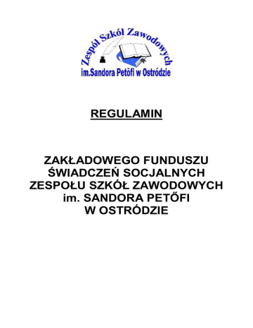 REGULAMIN ZAKŁADOWEGO FUNDUSZU ŚWIADCZEŃ SOCJALNYCH ZESPOŁU SZKÓŁ ZAWODOWYCH im. SANDORA PETŐFI W OSTRÓDZIE SPIS TREŚCI Rozdział I Postanowienia ogólne Rozdział II Zasady gospodarowania środkami ZFŚS Rozdział III Osoby uprawnione do korzystania z ZFŚS oraz warunki korzystania Rozdział IV Przeznaczenie środków ZFŚS Rozdział V Zasady i warunki przyznawania świadczeń socjalnych Rozdział VI Postanowienia końcowe Załączniki: Załącznik Nr 1 – Aktualizacja informacji o sytuacji życiowej i materialnej osoby zamierzającej skorzystać w danym roku ze świadczeń finansowanych z Zakładowego Funduszu Świadczeń Socjalnych ZSZ im. Sandora Petőfi w Ostródzie Załącznik Nr 2 – Zgłoszenie uczestnictwa w świadczeniu dofinansowanym z Zakładowego Funduszu Świadczeń Socjalnych ZSZ im. Sandora Petőfi w Ostródzie Załącznik Nr 3 – Tabela wysokości świadczeń finansowanych z Zakładowego Funduszu Świadczeń Socjalnych ZSZ im. Sandora Petőfi w Ostródzie Załącznik Nr 4 – Wniosek o udzielenie pożyczki mieszkaniowej z Zakładowego Funduszu Świadczeń Socjalnych ZSZ im. Sandora Petőfi w Ostródzie Załącznik Nr 5 – Umowa w sprawie pożyczki mieszkaniowej z Zakładowego Funduszu Świadczeń Socjalnych ZSZ im. Sandora Petőfi w Ostródzie Załącznik Nr 6 – Wniosek o dofinansowanie z Zakładowego Funduszu Świadczeń Socjalnych wypoczynku indywidualnego tzw. „wczasów pod gruszą” Załącznik Nr 7 – Wniosek o przyznanie dofinansowania z Zakładowego Funduszu Świadczeń Socjalnych do indywidualnie zakupionego wypoczynku dla dzieci Załącznik Nr 8 – Wniosek o przyznanie bezzwrotnej zapomogi z Zakładowego Funduszu Świadczeń Socjalnych ZSZ im. Sandora Petőfi w Ostródzie s. 3 s. 4 s. 5 s. 7 s. 8 s. 11 s. 12 s. 14 s. 15 s. 16 s. 17 s. 19 s. 20 s. 21 Rozdział I Postanowienia ogólne 1. Regulamin ZFŚS, zwany dalej „funduszem”, został opracowany na podstawie: a. Ustawy z 4 marca 1994 r. o zakładowym funduszu świadczeń socjalnych (t.j. Dz. U. z 1996 r. Nr 70, poz. 335 z późniejszymi zmianami); b. Ustawy z 23 maja 1991 r. o związkach zawodowych (t.j. Dz. U. z 2001 r. Nr 79, poz. 854 z późniejszymi zmianami) c. Ustawy z 26 lipca 1991 r. o podatku dochodowym od osób fizycznych (t.j. Dz. U. z 2000 r. Nr 14, poz. 176 z późniejszymi zmianami); d. Ustawy z 26 stycznia 1982 r. – Karta Nauczyciela (t.j. Dz. U. z 2003 r. Nr 118, poz. 1112, Nr 137, poz. 1304, Nr 203, poz. 1966, Nr 213, poz. 2081; Dz. U. z 2004 r. Nr 96, poz. 956 oraz Nr 179 poz. 1845); Rozdział II Zasady gospodarowania środkami ZFŚS 1. Zasobami ZFŚS administruje Pracodawca, przy pomocy Komisji Socjalnej, w uzgodnieniu z działającymi w Zespole związkami zawodowymi. 2. Wysokość rocznych odpisów na fundusz wynosi: Dla nauczycieli w wysokości ustalanej jako iloczyn planowanej, przeciętnej w danym roku kalendarzowym liczby nauczycieli zatrudnionych w pełnym i niepełnym wymiarze zajęć (po przeliczeniu na pełny wymiar zajęć) skorygowanej w końcu roku do faktycznej przeciętnej liczby zatrudnionych nauczycieli (po przeliczeniu na pełny wymiar zajęć) i 110% kwoty bazowej, określanej dla pracowników państwowej sfery budżetowej na podstawie art. 5 pkt 1 lit. a) i art. 6 ust. 1 pkt 2 ustawy o kształtowaniu wynagrodzeń w państwowej sferze budżetowej oraz o zmianie niektórych ustaw ustalanej corocznie w ustawie budżetowej; a) z odpisu na fundusz wypłacane jest nauczycielowi do końca sierpnia każdego roku świadczenie urlopowe w wysokości odpisu podstawowego, o którym mowa w przepisach o ZFŚS, ustalonego proporcjonalnie do wymiaru czasu pracy i okresu zatrudnienia nauczyciela w danym roku szkolnym. Dla nauczycieli będących emerytami i rencistami dokonuje się odpisu na fundusz w wysokości 5% pobieranych przez nich emerytur i rent. Odpis na fundusz w skali rocznej na jednego pracownika administracji i obsługi wynosi 37,5% przeciętnego wynagrodzenia miesięcznego w gospodarce narodowej w roku poprzednim lub w drugim półroczu roku poprzedniego. Dla pracowników administracji i obsługi będących emerytami i rencistami dokonuje się odpisu na fundusz w wysokości 6,25% pobieranych przez nich emerytur i rent. Dla pracowników młodocianych odpis ten wynosi 5% w pierwszym roku nauki, 6% w drugim roku nauki, 7% w trzecim roku nauki (art. 5 ust. 2a ustawy o ZFŚS) Na każdą zatrudnioną osobę, w stosunku do której orzeczono znaczny lub umiarkowany stopień niepełnosprawności wysokość odpisu podstawowego jest zwiększona o 6,25% przeciętnego wynagrodzenia miesięcznego. 3. Środki funduszu zwiększa się o: wpływy z opłat pobieranych od osób i jednostek organizacyjnych korzystających z działalności socjalnej; darowizny oraz zapisy osób fizycznych i prawnych; odsetki od środków funduszu; wpływy z oprocentowania pożyczek udzielanych na cele mieszkaniowe; inne środki wymienione w odrębnych przepisach. 4. Otrzymane środki funduszu dzielone są: a) 80% odpisu stanowi fundusz socjalny, z czego, zgodnie z art. 53 ust. 1a KN, 40% stanowi świadczenie urlopowe nauczycieli, b) 20% odpisu stanowi fundusz mieszkaniowy. 5. Komisja Socjalna sporządza roczny plan wydatków i dochodów związanych ze świadczeniami socjalnymi finansowanymi ze środków ZFŚS z podziałem na poszczególne świadczenia. 6. Wnioski o udzielenie świadczeń socjalnych oraz informacje o sytuacji życiowej, rodzinnej i materialnej, pracownicy oraz byli pracownicy składają do Komisji Socjalnej (biblioteka szkolna). 7. Świadczenia finansowane z ZFŚS mają charakter uznaniowy, nie posiadają charakteru roszczeniowego. Świadczenia socjalne pracodawca przyznaje w granicach posiadanego limitu przewidzianego w planie przychodów i wydatków ZFŚS na dany rok kalendarzowy. Rozdział III Osoby uprawnione do korzystania z ZFŚS 1. Osobami uprawnionymi do korzystania ze środków funduszu są: a) pracownicy ZSZ, zatrudnieni na podstawie mianowania lub umowy o pracę, be