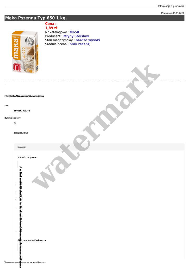 Informacje o produkcie Utworzono 02-03-2017 Mąka Pszenna Typ 650 1 kg. Cena : 1,89 zł . MłynyStoisławMąkapszennachlebowatyp6501kg EAN 5900563000262 Rynek docelowy PL Daneproduktowe at Składniki Wartości odżywcze w % 1 0 R 0 W W 1 g S *p a 4 7 r w T 1 2 r 3 % o 1 d 0 ł0 5 % t u 0 w 0 2 u g o k k g tsJś 3 t% u W 6 2 y g z/ć , , : ę 5 m c3 e w 2 g % k z3 n tlw 1 6 e 8 B 1 2 y % o a r k ig 3 m w scg a g % co y e a S < 0 łu d tl , % ó 0 k 6 a ły *0 l1 o rn u c R 1 g y sz Obliczona wartość odżywcza W g B zn S łca n -o za rn 1 o W 1 0 e n w Wygenerowano w0 programie www.oscGold.com a 4 fie g re 3 , er m ar k Nr katalogowy : M650 Producent : Młyny Stoisław Stan magazynowy : bardzo wysoki Średnia ocena : brak recenzji n a 1 W 0 0 a 3 g ), . ) ) ) ) ) er m ar k . Marketing at . T r 3 ł8 t w u 1 o t5 sś W y 0 zć ę m 3 ce w g k zn t6 lw (e B y 2 o 5 a g r i1 m w sg S < a co y e ó 0 łu 1 d t l3 0 k a ły (o 1 rn u c Opis g (y sz produktu g (zn g ca Marka z( o k Stoisław Młyny w c e Cechy a n l 100% naturalna, z polskich zbóż a s Marka standaryzowana y c Marka - Młyny Stoisław o n Nazwa produktu uregulowana prawnie e ( Mąka pszenna chlebowa typ 650 g w O producencie Certyfikat Jakości ISO 9001:2008 i ISO 22000:2005 Pozostałe informacje Masa netto 1 kg przy wilgotności 15% Przechowywanie i stosowanie Rodzaj przechowywania T y p P r Przechowywanie z e c h Informacje o produkcie Przechowywać w suchym, przewiewnym miejscu. Opakowanie Rozmiar opakowania 1kg Wymiar liczbowy Wymiar liczbowy - 1 Wymiar w at er m ar k W y m 1 8 a g 0 6 a 7 3 n a (Zasady Wymiarowania Opakowań GS1) w s g Rodzaj opakowania y łz s e ę ro b Typ - Torba papierowa k o o k ś o Waga ć ś n ć Waga a brutto - 1001g n p a ó p Sprzedaż jednostkowa ł ó łc Wysokość - 167 e c ( e Szerokość - 103 (m ) Głębokość m - 86 ) m Wygenerowano w programie www.oscGold.com