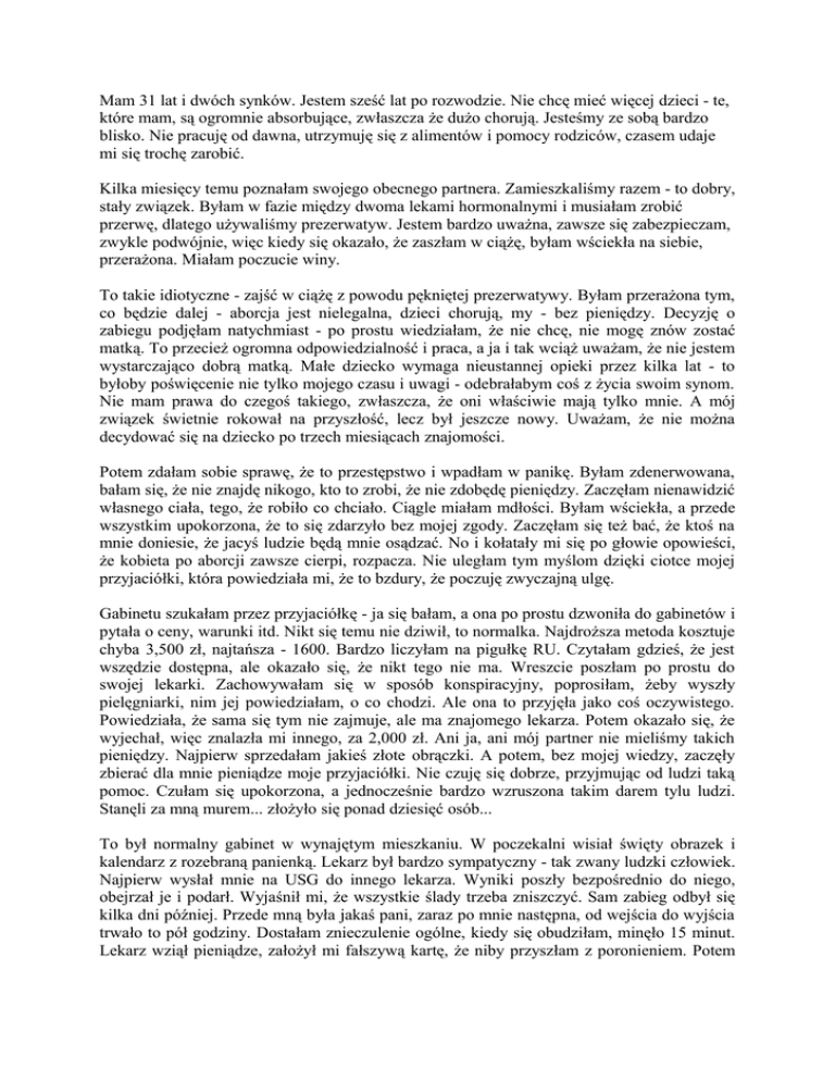 Mam 31 lat i dwóch synków. Jestem sześć lat po rozwodzie. Nie chcę mieć więcej dzieci - te, które mam, są ogromnie absorbujące, zwłaszcza że dużo chorują. Jesteśmy ze sobą bardzo blisko. Nie pracuję od dawna, utrzymuję się z alimentów i pomocy rodziców, czasem udaje mi się trochę zarobić. Kilka miesięcy temu poznałam swojego obecnego partnera. Zamieszkaliśmy razem - to dobry, stały związek. Byłam w fazie między dwoma lekami hormonalnymi i musiałam zrobić przerwę, dlatego używaliśmy prezerwatyw. Jestem bardzo uważna, zawsze się zabezpieczam, zwykle podwójnie, więc kiedy się okazało, że zaszłam w ciążę, byłam wściekła na siebie, przerażona. Miałam poczucie winy. To takie idiotyczne - zajść w ciążę z powodu pękniętej prezerwatywy. Byłam przerażona tym, co będzie dalej - aborcja jest nielegalna, dzieci chorują, my - bez pieniędzy. Decyzję o zabiegu podjęłam natychmiast - po prostu wiedziałam, że nie chcę, nie mogę znów zostać matką. To przecież ogromna odpowiedzialność i praca, a ja i tak wciąż uważam, że nie jestem wystarczająco dobrą matką. Małe dziecko wymaga nieustannej opieki przez kilka lat - to byłoby poświęcenie nie tylko mojego czasu i uwagi - odebrałabym coś z życia swoim synom. Nie mam prawa do czegoś takiego, zwłaszcza, że oni właściwie mają tylko mnie. A mój związek świetnie rokował na przyszłość, lecz był jeszcze nowy. Uważam, że nie można decydować się na dziecko po trzech miesiącach znajomości. Potem zdałam sobie sprawę, że to przestępstwo i wpadłam w panikę. Byłam zdenerwowana, bałam się, że nie znajdę nikogo, kto to zrobi, że nie zdobędę pieniędzy. Zaczęłam nienawidzić własnego ciała, tego, że robiło co chciało. Ciągle miałam mdłości. Byłam wściekła, a przede wszystkim upokorzona, że to się zdarzyło bez mojej zgody. Zaczęłam się też bać, że ktoś na mnie doniesie, że jacyś ludzie będą mnie osądzać. No i kołatały mi się po głowie opowieści, że kobieta po aborcji zawsze cierpi, rozpacza. Nie uległam tym myślom dzięki ciotce mojej przyjaciółki, która powiedziała mi, że to bzdury, że poczuję zwyczajną ulgę. Gabinetu szukałam przez przyjaciółkę - ja się bałam, a ona po prostu dzwoniła do gabinetów i pytała o ceny, warunki itd. Nikt się temu nie dziwił, to normalka. Najdroższa metoda kosztuje chyba 3,500 zł, najtańsza - 1600. Bardzo liczyłam na pigułkę RU. Czytałam gdzieś, że jest wszędzie dostępna, ale okazało się, że nikt tego nie ma. Wreszcie poszłam po prostu do swojej lekarki. Zachowywałam się w sposób konspiracyjny, poprosiłam, żeby wyszły pielęgniarki, nim jej powiedziałam, o co chodzi. Ale ona to przyjęła jako coś oczywistego. Powiedziała, że sama się tym nie zajmuje, ale ma znajomego lekarza. Potem okazało się, że wyjechał, więc znalazła mi innego, za 2,000 zł. Ani ja, ani mój partner nie mieliśmy takich pieniędzy. Najpierw sprzedałam jakieś złote obrączki. A potem, bez mojej wiedzy, zaczęły zbierać dla mnie pieniądze moje przyjaciółki. Nie czuję się dobrze, przyjmując od ludzi taką pomoc. Czułam się upokorzona, a jednocześnie bardzo wzruszona takim darem tylu ludzi. Stanęli za mną murem... złożyło się ponad dziesięć osób... To był normalny gabinet w wynajętym mieszkaniu. W poczekalni wisiał święty obrazek i kalendarz z rozebraną panienką. Lekarz był bardzo sympatyczny - tak zwany ludzki człowiek. Najpierw wysłał mnie na USG do innego lekarza. Wyniki poszły bezpośrednio do niego, obejrzał je i podarł. Wyjaśnił mi, że wszystkie ślady trzeba zniszczyć. Sam zabieg odbył się kilka dni później. Przede mną była jakaś pani, zaraz po mnie następna, od wejścia do wyjścia trwało to pół godziny. Dostałam znieczulenie ogólne, kiedy się obudziłam, minęło 15 minut. Lekarz wziął pieniądze, założył mi fałszywą kartę, że niby przyszłam z poronieniem. Potem opowiedział mi, co się będzie działo dalej, jak mam się zachowywać, dbać o siebie. Był trochę zaniepokojony, że przyszły ze mną aż trzy osoby. Pojechaliśmy do domu. Czułam się trochę skołowana, ale w sumie bardzo dobrze - i fizycznie, i psychicznie. Odczułam ulgę, byłam szczęśliwa. Wszystko już za mną. Minęło ponad pół roku, a ja ani przez chwilę nie żałowałam swojej decyzji. Mam raczej poczucie, że uniknęłam nieszczęścia, pułapki. Gdyby aborcja była legalna, nie byłoby tego całego upokorzenia, tego strachu... no i pewnie nie doświadczyłabym takiego ogromnego wsparcia ze strony przyjaciół... Magda M.