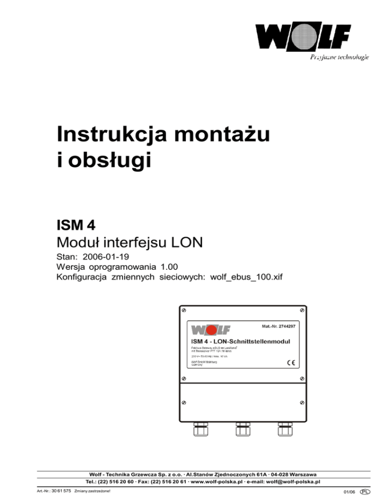 ISM4 Instrukcja montażu i obsługi ISM 4 Moduł interfejsu LON Stan: 2006-01-19 Wersja oprogramowania 1.00 Konfiguracja zmiennych sieciowych: wolf_ebus_100.xif Wolf - Technika Grzewcza Sp. z o.o. · Al.Stanów Zjednoczonych 61A · 04-028 Warszawa Tel.: (22) 516 20 60 · Fax: (22) 516 20 61 · www.wolf-polska.pl · e-mail: [email protected] Art.-Nr.: 30 61 575 Zmiany zastrzeżone! 1 01/06 PL Spis treści 1 ISM4 Ogólne wskazówki dotyczące bezpieczeństwa ................................................................... 3-4 Informacje ogólne .............................................................................................................. 3 Znaki ze wskazówkami ...................................................................................................... 3 Wskazówki dotyczące bezpieczeństwa ............................................................................ 3 Wykorzystanie zgodne z przeznaczeniem ........................................................................ 4 Przepisy i wskazówki dotyczące bezpieczeństwa ............................................................. 4 Dostawa, transport, magazynowanie ................................................................................. 4 2 Funkcja..... .................................................................................................................................. 5 2.1 Zakres ogrzewania ............................................................................................................ 5 2.2 Zakres klimatyzacji / wentylacji .......................................................................................... 5 3 Dane techniczne ........................................................................................................................ 5 4 Montaż....... ................................................................................................................................. 6 5 Podłączenie ............................................................................................................................... 7 6 7 5.1 Zasilanie napięciem 230 VAC ............................................................................................. 7 5.2 Interfejs LonWorks® .......................................................................................................... 7 5.3 Interfejs eBUS .................................................................................................................... 7 Nastawy.... ................................................................................................................................ 8-9 6.1 Adres eBUS ....................................................................................................................... 8 6.2 Dopasowanie instalacji ...................................................................................................... 8 6.3 Uruchomienie LonWorks® ................................................................................................. 9 Zmienne sieciowe ................................................................................................................. 9-16 7.1 Automaty palnikowe ...................................................................................................... 9-11 7.2 Regulator ogrzewania ................................................................................................. 12-13 7.3 Regulacja klimatyzacji / wentylacji DigiPro .................................................................. 14-16 7.4 Informacje ogólne ............................................................................................................ 16 8 Diagnostyka .............................................................................................................................. 17 9 Wymiana bezpieczników ......................................................................................................... 18 10 Przełączniki DIP ....................................................................................................................... 18 11 Kody błędów ....................................................................................................................... 19-20 2 11.1 Kody błędów ogrzewania ................................................................................................. 19 11.2 Kody błędów regulacji klimatyzacji / wentylacji DigiPro ..................................................... 20 1 Ogólne wskazówki dotyczące bezpieczeństwa 1 ISM4 Ogólne wskazówki dotyczące bezpieczeństwa Informacje ogólne Przedstawiona instrukcja montażu i obsługi obowiązuje wyłącznie dla modułu interfejsu LON ISM4. Personel mający wykonać prace związane z montażem, uruchomieniem lub konserwacją powinien zapoznać się z niniejszą instrukcją. Należy przestrzegać zaleceń podanych w tej instrukcji. Instrukcję tę, jako element dostarczonego przyrządu, należy przechowywać w dostępnym miejscu. W przypadku nieprzestrzegania instrukcji montażu i obsługi wygasa roszczenie gwarancyjne w stosunku do firmy Wolf. Znaki ze wskazówkami W opisie tym stosowane są następujące symbole i znaki ze wskazówkami. Te ważne polecenia dotyczą ochrony osób oraz technicznego bezpieczeństwa eksploatacji. „Wskazówka bezpieczeństwa” oznacza instrukcje, których należy ściśle przestrzegać, aby uniknąć zagrożenia i zranienia osób oraz zapobiec uszkodzeniu urządzenia. Zagrożenie spowodowane napięciem elektrycznym na elektrycznych częściach konstrukcyjnych! Nigdy nie należy dotykać elektrycznych części konstrukcyjnych i styków przy załączonym napięciu sieciowym! Występuje zagrożenie porażenia prądem z zagrożeniem zdrowia lub życia. Jeżeli w przyrządzie, jako dodatek do instrukcji montażu i obsługi, umieszczone są wskazówki w postaci naklejek, muszą być one również przestrzegane. Wskazówki dotyczące bezpieczeństw