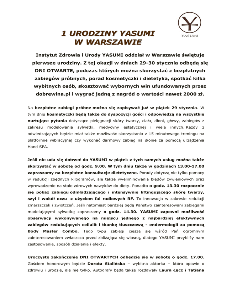 1 1U UR RO OD DZ ZIIN NY YY YA AS SU UM MII W WW WA AR RS SZ ZA AW WIIE E Instytut Zdrowia i Urody YASUMI oddział w Warszawie świętuje pierwsze urodziny. Z tej okazji w dniach 29-30 stycznia odbędą się DNI OTWARTE, podczas których można skorzystać z bezpłatnych zabiegów próbnych, porad kosmetyczki i dietetyka, spotkać kilka wybitnych osób, skosztować wybornych win ufundowanych przez dobrewina.pl i wygrać jedną z nagród o wartości nawet 2000 zł. Na bezpłatne zabiegi próbne można się zapisywać już w piątek 29 stycznia. W tym dniu kosmetyczki będą także do dyspozycji gości i odpowiedzą na wszystkie nurtujące pytania dotyczące pielęgnacji skóry twarzy, ciała, dłoni, głowy, zabiegów z zakresu modelowania sylwetki, medycyny estetycznej i wiele innych. Każdy z odwiedzających będzie miał także możliwość skorzystania z 15 minutowego treningu na platformie wibracyjnej czy wykonać darmowy zabieg na dłonie za pomocą urządzenia Hand SPA. Jeśli nie uda się dotrzeć do YASUMI w piątek z tych samych usług można także skorzystać w sobotę od godz. 9.00. W tym dniu także w godzinach 13.00-17.00 zapraszamy na bezpłatne konsultacje dietetyczne. Porady dotyczą nie tylko pomocy w redukcji zbędnych kilogramów, ale także wyeliminowania błędów żywieniowych oraz wprowadzenie na stałe zdrowych nawyków do diety. Ponadto o godz. 13.30 rozpocznie się pokaz zabiegu odmładzającego i intensywnie liftingującego skórę twarzy, szyi i wokół oczu z użyciem fal radiowych RF. To innowacja w zakresie redukcji zmarszczek i zwiotczeń. Jeśli natomiast bardziej będą Państwo zainteresowani zabiegami modelującymi sylwetkę zapraszamy o godz. 14.30. YASUMI zapewni możliwość obserwacji wykonywanego na miejscu jednego z najbardziej efektywnych zabiegów redukujących cellulit i tkankę tłuszczową - endermologii za pomocą Body Master Combo. Tego typu zabiegi cieszą się wśród Pań ogromnym zainteresowaniem zwłaszcza przed zbliżająca się wiosną, dlatego YASUMI przybliży nam zastosowanie, sposób działania i efekty. Uroczyste zakończenie DNI OTWARTYCH odbędzie się w sobotę o godz. 17.00. Gościem honorowym będzie Dorota Stalińska – wybitna aktorka – która opowie o zdrowiu i urodzie, ale nie tylko. Autografy będą także rozdawały Laura Łącz i Tatiana Sosna-Sarno, także znane nam wszystkim aktorki i zarazem opiekunki naszych klubowych akademii. A w międzyczasie poczęstunek, degustacja win dostarczonych przez dobrewina.pl (naszego klubowicza), prezentacja oferty firmy YARDEN – kosmetyki z Morza Martwego (też naszego klubowicza) i firmy Wygodna Dieta – catering dietetyczny. Na zakończenie odbędzie się losowanie atrakcyjnych nagród (prosimy o zabranie wizytówek; jeśli jednak pamięć zawiedzie, YASUMI udostępni formularz do wypełnienia), do wygrania będą: vouchery na zabiegi pielęgnacyjne skórę twarzy, zabiegi modelujące sylwetkę i zabiegi relaksacyjne – niektóre o wartości ponad 2000 zł, niezwykłe wina ufundowane przez dobrewina.pl, kosmetyki z Morza Martwego Yarden, darmowy 2 tygodniowy catering dietetyczny, dekoracje do wnętrz i inne. ZAPRASZAMY SERDECZNIE W IMIENIU YASUMI I EUROPEJSKIEGO FORUM PRZEDSIĘBIORCZOŚCI Yasumi – Instytut Zdrowia i Urody ul. Stryjeńskich 10 02-791 Warszawa (Kabaty) www.yasumi.pl Skrócona agenda DNI OTWARTYCH w YASUMI 29 stycznia – piątek, godz. 10.00-20.00 • bezpłatne zabiegi próbne: endermologia, elektrostymulacja, fale radiowe, platforma wibracyjna, zabiegi na dłonie, skórę głowy, przeciwbólowe • bezpłatne konsultacje kosmetyczne 30 stycznia – sobota 09.00-13.00 • bezpłatne zabiegi próbne: endermologia, elektrostymulacja, fale radiowe, platforma wibracyjna, zabiegi na dłonie, skórę głowy, przeciwbólowe • bezpłatne konsultacje kosmetyczne 13.00-17.00 • bezpłatne konsultacje dietetyczne 13.30-14.30 • pokaz zabiegu odmładzającego i liftingującego – fale radiowe RF 14.30-15.30 • pokaz zabiegu redukującego cellulit i tkankę tłuszczową – endermologii od 17.00 • uroczyste zamknięcie DNI OTWARTYCH. Goście: Dorota Stalińska, Laura Łącz, Tatiana Sosna-Sarno • poczęstunek, degustacja win dostarczonych przez firmę dobrewina.pl • prezentacja oferty firm Yarden-kosmetyki z Morza Martwego, Wygodny Catering i innych • losowanie nagród o wartości nawet 2000 zł.