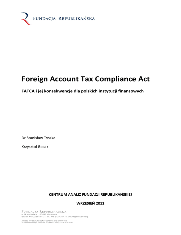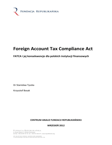 Foreign Account Tax Compliance Act FATCA i jej konsekwencje dla polskich instytucji finansowych Dr Stanisław Tyszka Krzysztof Bosak CENTRUM ANALIZ FUNDACJI REPUBLIKAOSKIEJ WRZESIEO 2012 FUNDACJA REPUBLIKAŃSKA ul. Nowy Świat 41, 00-042 Warszawa tel./fax: +48 22 891 07 37, tel.: +48 512 435 471, www.republikanie.org NIP: 952-207-86-26, REGON: 142075516, KRS: 0000340559 nr konta bankowego: Alior Bank 84 2490 0005 0000 4520 9156 1754 Jeszcze nie umilkły echa dyskusji o ACTA, a coraz częściej mówi się o kolejnym amerykańskim akcie prawnym ingerującym w porządek prawny innych krajów, którego konsekwencje dotkną polskich instytucji finansowych, a pośrednio także ich klientów. FATCA (Foreign Account Tax Compliance Act) – bo to o tej ustawie będzie mowa w dalszej części analizy – została uchwalona w USA w 2010 r., zaś jej celem jest ułatwienie ściągania podatków przez amerykańskie władze podatkowe (U.S. Internal Revenue Service – IRS) od obywateli i rezydentów USA, których aktywa są ulokowane poza USA. Geneza FATCA W wyniku przeprowadzonych analiz amerykańskie władze podatkowe oszacowały, że wielu amerykańskich obywateli i rezydentów nie wykazuje w zeznaniach podatkowych dochodów osiąganych poza USA. Amerykańscy obywatele masowo zakładali firmy w rajach podatkowych by w ten sposób uciec przed amerykańskim fiskusem. Tego typu praktyki są sprzeczne z amerykańskim ustawodawstwem, w świetle którego amerykańscy rezydenci podatkowi podlegają nieograniczonemu obowiązkowi podatkowemu w USA, bez względu na miejsce osiągnięcia dochodów1. IRS doszedł do wniosku, że zapobieżenie tego typu metodom może być potencjalnym źródłem dużych wpływów dla amerykańskiego budżetu. Odpowiedzią na powyższe potrzeby amerykańskiego fiskusa jest FATCA, ustawa wyposażająca IRS w odpowiednie instrumenty do pozyskiwania i gromadzenia informacji o zagranicznych rachunkach amerykańskich rezydentów, uchwalona 18 marca 2010 r. i będąca częścią HIRE (Hiring Incentives to Restore Employment Act), pakietu ustaw mającego na celu przeciwdziałanie bezrobociu. Przepisy samej FATCA są sformułowane bardzo ogólnie, w związku z czym w lutym 2012 r. został opublikowany projekt ponad 290-stronicowego rozporządzenia zawierającego wskazówki co do implementacji FATCA. 30 kwietnia minął termin na publiczne konsultacje, natomiast jesienią 2012 r. spodziewana jest publikacja ostatecznego tekstu rozporządzeń wykonawczych dla FATCA. Regulacje wynikające z FATCA będą wchodzić w życie stopniowo, począwszy od 1 stycznia 2013 r. W. Missala, FATCA, czyli amerykański podatek obciążający polskie podmioty, Przegląd Podatkowy 5/2012, s. 9-10. 1 2 FATCA a polskie instytucje finansowe Cechą charakterystyczną i clou FATCA jest to, że nakłada obowiązki nie tyle na amerykańskich rezydentów podatkowych, co przede wszystkim na zagraniczne instytucje finansowe, których klientami mogą być amerykańscy rezydenci podatkowi, co ma służyć wzmocnieniu efektywności w kontrolowaniu zagranicznych inwestycji amerykańskich obywateli2. Zgodnie z definicją z FATCA instytucjami finansowymi są m. in. podmioty przyjmujące depozyty pieniężne, przechowujące aktywa finansowe, inwestujące na rzecz innych osób oraz uczestniczące w obrocie papierami wartościowymi. Definicja ta obejmuje swym zakresem polskie banki, domy maklerskie, fundusze inwestycyjne i zakłady ubezpieczeń. FATCA obliguje zagraniczne instytucje finansowe do raportowania do IRSu o rachunkach amerykańskich rezydentów w zasadniczo taki sam sposób, w jaki amerykańskie instytucje finansowe muszą informować IRS o rachunkach osób niebędących rezydentami amerykańskimi. Sankcją za nieprzestrzeganie postanowień FATCA przez instytucje finansowe będzie podatek w wysokości 30% nałożony na wszystkie płatności na rzecz danej instytucji finansowej dokonywane z USA. Podatek ten obejmować będzie nie tylko kwotę główną, ale także m. in. odsetki czy dywidendy. Można się spodziewać, że instytucje finansowe, które nie dostosują się do FATCA będą narażone na odpływ klientów dokonujących za ich pomocą transferów z USA, chcących uniknąć sankcji 30% podatku3. Chcąc zrozumieć jak to będzie działać rozważmy następujący przykład: bank XYZ nie wdrożył FATCA. W konsekwencji obciążeniu podatkiem 30% podlegać będą inwestycje amerykańskie klientów banku XYZ (bez względu na to czy są amerykańskimi rezydentami podatkowymi wg FATCA); transakcje na rynku międzybankowym, w których jedną ze stron jest bank amerykański, a drugą bank XYZ; inwestycje własne banku XYZ na rynku amerykańskim. Wpływ FATCA na funkcjonowanie instytucji finansowej Aby uzmysłowić sobie stopień złożoności, skomplikowania i uciążliwość FATCA dla instytucji finansowych warto szerzej omówić kilka kwestii, których dotyka FATCA, m. in. definicji amerykańskiego rezydenta podatkowego, zakresu informacji jakie podlegają B. Romanowski, A. Tarasiuk-Flodrowska, Polscy ubezpieczyciele powinni rozważyć skutki amerykańskiej ustawy, Rzeczpospolita, 17 maja 2012 r. 3 P. Święcicki, Amerykański fiskus nakłada obowiązki na polskie banki i instytucje finansowe, Miesięcznik Finansowy BANK, marzec 2012, s. 59. 2 3 przekazaniu do IRSu, możliwych strategii instytucji finansowych wobec FATCA, obszaru wpływu FATCA na działanie instytucji finansowych, kosztów jej wdrożenia, a także skutków FATCA dla klientów tychże instytucji. Zgodnie z przepisami FATCA instytucje finansowe już od 1 lipca 2013 r. powinny identyfikować i klasyfikować nowych klientów na potrzeby FATCA (tzw. onboarding). Będą szukać w bazach danych tzw. „poszlak amerykańskich” (U.S. indicia). „Poszlaki amerykańskie” są zdefiniowane bardzo szeroko i obejmują m.in.: obywatelstwo amerykańskie, status rezydenta USA (aby go uzyskać wystarczy spędzić co najmniej 31 dni w danym roku w USA lub spędzi