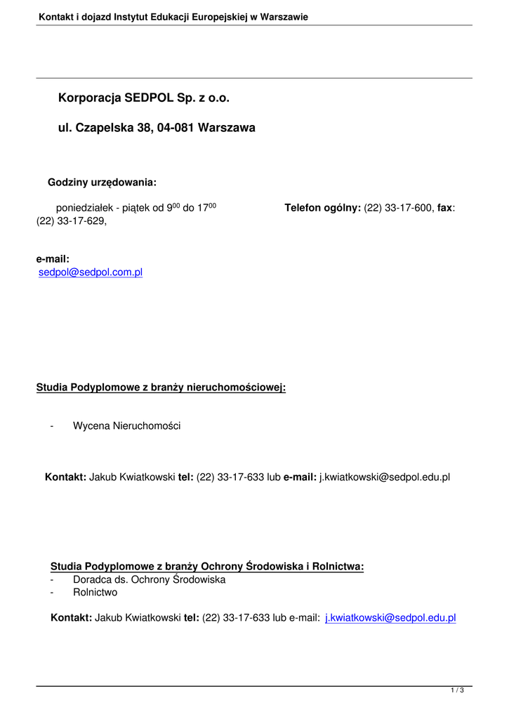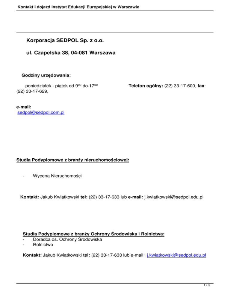 Kontakt i dojazd Instytut Edukacji Europejskiej w Warszawie Korporacja SEDPOL Sp. z o.o. ul. Czapelska 38, 04-081 Warszawa Godziny urzędowania: poniedziałek - piątek od 900 do 1700 (22) 33-17-629, Telefon ogólny: (22) 33-17-600, fax: e-mail: [email protected] Studia Podyplomowe z branży nieruchomościowej: - Wycena Nieruchomości Kontakt: Jakub Kwiatkowski tel: (22) 33-17-633 lub e-mail: [email protected] Studia Podyplomowe z branży Ochrony Środowiska i Rolnictwa: Doradca ds. Ochrony Środowiska Rolnictwo Kontakt: Jakub Kwiatkowski tel: (22) 33-17-633 lub e-mail: [email protected] 1/3 Kontakt i dojazd Instytut Edukacji Europejskiej w Warszawie Studia Podyplomowe z branży Energetycznej: - Audytor Efektywności Energetycznej Kontakt: tel: (22) 33-17-600 lub e-mail: [email protected] Praktyki zawodowe: Wycena nieruchomości Kontakt: Joanna Burkacka-Jurgiel tel: (22) 33-17-622 lub e-mail: [email protected] - Kursy i Szkolenia: Na licencję Pośrednika i Zarządcy nieruchomości Termowizja, ekspertyzy termowizyjne w budownictwie Audyt energetyczny na potrzeby termomodernizacji i remontów Kontakt: Jakub Kwiatkowski tel: (22) 33-17- 633 lub e-mail: [email protected] - Na licencję syndyka/doradcy restrukturyzacyjnego Kontakt: Karol Konopa tel: (22) 33-17- 634 lub e-mail: [email protected] konalenie zawodowe: Dos Seminaria w ramach ustawicznego kształcenia dla Pośredników, Zarządców i Rzeczoznawców Majątkowych Kontakt: tel: (22) 33-17-600 lub e-mail: [email protected] konta: Numer Instytut Edukacji Europejskiej PKO Bp XXIX O/Warszawa 81 1020 1127 0000 1602 0008 3709 Bezpośrednie połączenia z ważniejszych miejsc w Warszawie: 2/3 Kontakt i dojazd Instytut Edukacji Europejskiej w Warszawie z Dworca Centralnego: Tramwaje: 9, 22, 24 i Autobus: 521 czas przejazdu: ok. 20 min. z Dworca Wschodniego: Autobusy: 123 i 173 czas przejazdu: ok. 20 min. z Dworca Zachodniego: Autobus: 523 czas przejazdu: ok. 30 min. z Dworca Wileńskiego: Tramwaje: 3 i 26 czas przejazdu: ok. 15 min. z Portu Lotniczego im. Fryderyka Chopina w Warszawie (Okęcie): Autobus: 188 czas przejazdu: ok. 40 min. Aby uzyskać więcej informacji o połączeniach i rozkładach jazdy Komunikacji Miejskiej wejdź na stronę Jak Dojadę lub Zarządu Transportu Miejskiego Aby uzyskać więcej informacji o połączeniach i rozkładach jazdy pociągów wejdź na stronę Polskich Kolei Państwowych rozkład jazdy pociągów 3/3