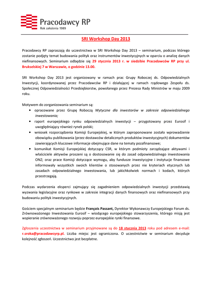 SRI Workshop Day 2013 Pracodawcy RP zapraszają do uczestnictwa w SRI Workshop Day 2013 – seminarium, podczas którego zostanie podjęty temat budowania polityk oraz instrumentów inwestycyjnych w oparciu o analizę danych niefinansowych. Seminarium odbędzie się 29 stycznia 2013 r. w siedzibie Pracodawców RP przy ul. Brukselskiej 7 w Warszawie, o godzinie 13.00. SRI Workshop Day 2013 jest organizowany w ramach prac Grupy Roboczej ds. Odpowiedzialnych Inwestycji, koordynowanej przez Pracodawców RP i działającej w ramach rządowego Zespołu ds. Społecznej Odpowiedzialności Przedsiębiorstw, powołanego przez Prezesa Rady Ministrów w maju 2009 roku. Motywem do zorganizowania seminarium są: • opracowane przez Grupę Roboczą Wytyczne dla inwestorów w zakresie odpowiedzialnego inwestowania; • raport europejskiego rynku odpowiedzialnych inwestycji – przygotowany przez Eurosif i uwzględniający również rynek polski; • wniosek rozporządzenia Komisji Europejskiej, w którym zaproponowane zostało wprowadzenie obowiązku publikowania (przez dostawców detalicznych produktów inwestycyjnych) dokumentów zawierających kluczowe informacje obejmujące dane na tematy pozafinansowe; • komunikat Komisji Europejskiej dotyczący CSR, w którym podmioty zarządzające aktywami i właściciele aktywów proszeni są o dostosowanie się do zasad odpowiedzialnego inwestowania ONZ; oraz prace Komisji dotyczące wymogu, aby fundusze inwestycyjne i instytucje finansowe informowały wszystkich swoich klientów o stosowanych przez nie kryteriach etycznych lub zasadach odpowiedzialnego inwestowania, lub jakichkolwiek normach i kodach, których przestrzegają. Podczas wydarzenia eksperci zajmujący się zagadnieniem odpowiedzialnych inwestycji przedstawią wyzwania legislacyjne oraz rynkowe w zakresie integracji danych finansowych oraz niefinansowych przy budowaniu polityk inwestycyjnych. Gościem specjalnym seminarium będzie François Passant, Dyrektor Wykonawczy Europejskiego Forum ds. Zrównoważonego Inwestowania Eurosif – wiodącego europejskiego stowarzyszenia, którego misją jest wspieranie zrównoważonego rozwoju poprzez europejskie rynki finansowe. Zgłoszenia uczestnictwa w seminarium przyjmowane są do 18 stycznia 2013 roku pod adresem e-mail: [email protected]. Liczba miejsc jest ograniczona. O uczestnictwie w seminarium decyduje kolejność zgłoszeń. Uczestnictwo jest bezpłatne. Agenda SRI Workshop Day 2013 TERMIN MIEJSCE 29 stycznia 2013 Siedziba Pracodawców RP przy ul. Brukselskiej 7 Czas Rejestracja 12.30 – 13.00 CZĘŚĆ I: Rynek SRI w Europie i Polsce Robert Sroka, Pracodawcy RP, Przewodniczący Grupy Roboczej ds. 13.00 – 13.20 Odpowiedzialnych Inwestycji Wytyczne dla inwestorów w zakresie odpowiedzialnego inwestowania François Passant, Executive Director Eurosif Rynek odpowiedzialnych inwestycji w Europie i Polsce: stan obecny i perspektywy rozwoju dr Mirosław Kachniewski, Prezes Stowarzyszenia Emitentów Giełdowych Czy polskie spółki są przygotowane na odpowiedzialnych inwestorów: „Analiza ESG spółek w Polsce” – wyniki badania poziomu ujawniania danych pozafinansowych spółek giełdowych 13.20 – 13.50 13.50 – 14.10 Katarzyna Stawinoga, Departament Relacji z Inwestorami Banku Millennium Udział Banku Millennium w indeksie RESPECT oraz współpraca z inwestorami 14.10 – 14.30 Przerwa kawowa 14.30 – 14.50 CZĘŚĆ II – odpowiedzialne inwestowanie w praktyce Cezary Mech, Prezes Agencji Ratingu Społecznego Teoretyczne w Polsce i praktyczne aspekty odpowiedzialnego Piotr Kaźmierkiewicz, Analityk, CDM Pekao SA Raportowanie danych pozafinansowych jako konkurencyjnej spółki na polskim rynku kapitałowym 14.50 – 15.20 inwestowania element przewagi Adam Grzymisławski, Taxand Polska Po co i jak zostać sygnatariuszem Zasad Odpowiedzialnego Inwestowania 15.20 – 15.40 15.40 – 16.00 CZĘŚĆ III – Okrągły Stół 16.00 – 16.45 François Passant, Executive Director Okrągły Stół: jak rozwijać SRI w Polsce Lunch PRELEGENCI: François Passant, dyrektor wykonawczy, Eurosif Od września 2011 r. pełni rolę dyrektora wykonawczego w Eurosif - Europejskim Forum ds. Zrównoważonego Inwestowania - wiodącym europejskim stowarzyszeniu, którego misją jest wspieranie zrównoważonego rozwoju poprzez europejskie rynki finansowe. François ma ponad piętnaście lat doświadczenia w branży usług finansowych, z czego większość w zarządzaniu aktywami. Jest byłym dyrektorem wykonawczym Vanguard Investments Europe, gdzie był odpowiedzialny za planowanie i rozwój firmy na rynku europejskim. W latach 2006 i 2008 pełnił funkcję zastępcy dyrektora zarządzającego, a do jego bezpośrednich obowiązków należały kwestie zgodności z przepisami i kwestie regulacyjne. Podczas pracy w Vanguard, zebrał ogromne doświadczenie w zarządzaniu marketingiem, produktami i sprzedażą, obsługując różnych europejskich inwestorów instytucjonalnych. Wcześniej pracował jako menadżer w Deloitte oraz w firmie ubezpieczeniowej w Luksemburgu. Ukończył studia biznesowe na Reims Management School oraz posiada tytuł magistra zarządzania i technologii na Ecole Centrale de Paris. Mirosław Kachniewski, Prezes Zarządu, Stowarzyszenie Emitentów Giełdowych Przed dołączeniem do SEG pracował w Komisji Papierów Wartościowych i Giełd jako rzecznik prasowy i dyrektor sekretariatu. Był odpowiedzialny m.in. za kwestie współpracy międzynarodowej (piastował wiele istotnych funkcji w ramach międzynarodowej organizacji IOSCO), polityki edukacyjnej oraz badań i analiz. Wcześniej był pracownikiem Ministerstwa Przekształceń Własnościowych. Był pracownikiem Katedry Finansów Międzynarodowych SGH, jest absolwentem wydziału Handlu Zagranicznego tej uczelni. Ma stopień naukowy doktora. Jest autorem wielu publikacji o tematyce ekonomicznej, dotyczących głównie takich obszarów jak: funkcjonowanie rynków kapitałowych, liberalizacja prz