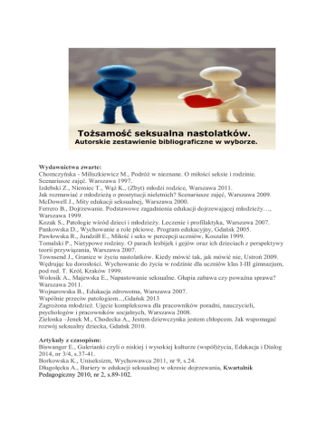 To samo seksualna nastolatków. Autorskie zestawienie bibliograficzne w wyborze. Wydawnictwa zwarte: Chomczy ska - Miliszkiewicz M., Podró w nieznane. O mi ci seksie i rodzinie. Scenariusze zaj . Warszawa 1997. Izdebski Z., Niemiec T., W K., (Zbyt) m odzi rodzice, Warszawa 2011. Jak rozmawia z m odzie o prostytucji nieletnich? Scenariusze zaj , Warszawa 2009. McDowell J., Mity edukacji seksualnej, Warszawa 2000. Ferrero B., Dojrzewanie. Podstawowe zagadnienia edukacji dojrzewaj cej m odzie y…, Warszawa 1999. Kozak S., Patologie w ród dzieci i m odzie y. Leczenie i profilaktyka, Warszawa 2007. Pankowska D., Wychowanie a role p ciowe. Program edukacyjny, Gda sk 2005. Paw owska R., Jundzi E., Mi i seks w percepcji uczniów, Koszalin 1999. Tomalski P., Nietypowe rodziny. O parach lesbijek i gejów oraz ich dzieciach z perspektywy teorii przywi zania, Warszawa 2007. Townsend J., Granice w yciu nastolatków. Kiedy mówi tak, jak mówi nie, Ustro 2009. druj c ku doros ci. Wychowanie do ycia w rodzinie dla uczniów klas I-III gimnazjum, pod red. T. Król, Kraków 1999. Wo osik A., Majewska E., Napastowanie seksualne. G upia zabawa czy powa na sprawa? Warszawa 2011. Wojnarowska B., Edukacja zdrowotna, Warszawa 2007. Wspólnie przeciw patologiom...,Gda sk 2013 Zagro ona m odzie . Uj cie kompleksowa dla pracowników poradni, nauczycieli, psychologów i pracowników socjalnych, Warszawa 2008. Zielonka –Jenek M., Chodecka A., Jestem dziewczynka jestem ch opcem. Jak wspomaga rozwój seksualny dziecka, Gda sk 2010. Artyku y z czasopism: Biswanger E., Galerianki czyli o niskiej i wysokiej kulturze (wspó ycia, Edukacja i Dialog 2014, nr 3/4, s.37-41. Borkowska K., Uniseksizm, Wychowawca 2011, nr 9, s.24. ugo cka A., Bariery w edukacji seksualnej w okresie dojrzewania, Kwartalnik Pedagogiczny 2010, nr 2, s.89-102. Izdebski Z., Obraz aktywno ci seksualnej m odzie y, Kwartalnik Pedagogiczny 2010, nr 2, s.165-186. Flatow E., Profilaktyka ryzykownych zachowa seksualnych dorastaj cej m odzie y: modele, strategie i uwarunkowania efektywno ci dzia , Lider 2010, nr 5, s.25-28. Grzelak S., Jak przeciwdzia skutkom seksualizacji dzieci i m odzie y? Remedium 2014, nr 7-8, s.1-4. Grzona,E., Lubikowska A., Ko acka M., ycie jak cheeseburger – wp yw kultury masowej na kszta towanie si to samo ci i intymno ci, Remedium 2011, nr 5, s.8-9. bski M., Przemoc seksualna w wiadomo ci doros ej m odzie y szkolnej w Gdyni, Remedium 2011, nr 4, s.1-3. Kempi ska U., Ci a jedn z przyczyn zawierania ma stw przez m odocianych, Problemy Opieku czo-Wychowawcze 2010, nr 6, s.13-19. Kili ska - P kacz A., Prawne aspekty zjawiska galerianek, Problemy Opieku czo -Wychowawcze 2013, nr 38-42. Komorowska M., Problemy nastolatek w ci y, Remedium 2012, nr 7, s.6-7. Konsekwencje seksualizacji dziewcz t, Remedium 2014, nr 1, s.1-3. Kornas-Bie a D., Skutki edukacji seksualnej, Wychowawca 2011, nr 5, s. 5-9. Krajewska B., Nastoletnie macierzy stwo-czy i jak szko a powinna wspiera uczennice w ci y? Nowa Szko a 2014, nr 3, s.10-17. Krajewski R., Prawne aspekty ci y ma oletniej, Problemy Opieku czo-Wychowawcze 2010, nr 3, s.44-50. Malesa W., Wirtualny seks za prawdziwe pieni dze – o prostytucji nieletnich, Problemy Opieku czo-Wychowawcze 2010, nr 7, s.17-20. Mysior R., Cyberseks, ciemna strona nowych mediów, Problemy Opieku czo-Wychowawcze 2013, nr 7, s.34-38. Nied wiecka N.A., Ryzykowne zachowania seksualne adolescentów, Nowa Szko a 2012, nr 9, s.38-43. Odebrana niewinno , Remedium 2014, nr 3, s.1- 4. Pu anecki J., Z do wiadcze hotelu dla nieletnich w ci y, Problemy Opieku czo -Wychowawcze 2010, nr 6, s.19-21. Ruszkiewicz D., Mi w yciu nastolatków, Problemy Opieku czo-Wychowawcze 2010, nr 9, s.34-43. Smoter B., O seksualno ci wykluczanej z obszaru szko y, Problemy Opieku czo -Wychowawcze 2011, nr 9, s.38-42. Szlendak T., Perwersyjni, konsumpcyjni, narcystyczni, li? O wybranych przyczynach zachowa dewiacyjnych i przemian seksualno ci ludzi m odych, Kwartalnik Pedagogiczny 2010, nr 2, s.55-73. K., Rodzice w roli wspó realizatorów szkolnego programu profilaktyki wczesnego rodzicielstwa, Kwartalnik Pedagogiczny 2010, nr 2, s.233-255. Walijewska U., Tyrania seksualizacji, Wychowawca 2014, nr 6, s.18-20. Wróblewska M., Postawy m odzie y w sferze seksualnej, Remedium 2006, nr 11, s.10-11. Wróblewska M., Postawy m odzie y w sferze seksualnej, Remedium 2006, nr 12, s.10-11. Misiu, kiedy powiesz, e mnie kochasz? abciu pierwszego kwietnia. opracowa a Anetta Wielewska na podstawie zbiorów Pedagogicznej Biblioteki Wojewódzkiej w Gda sku Filii w Chojnicach.