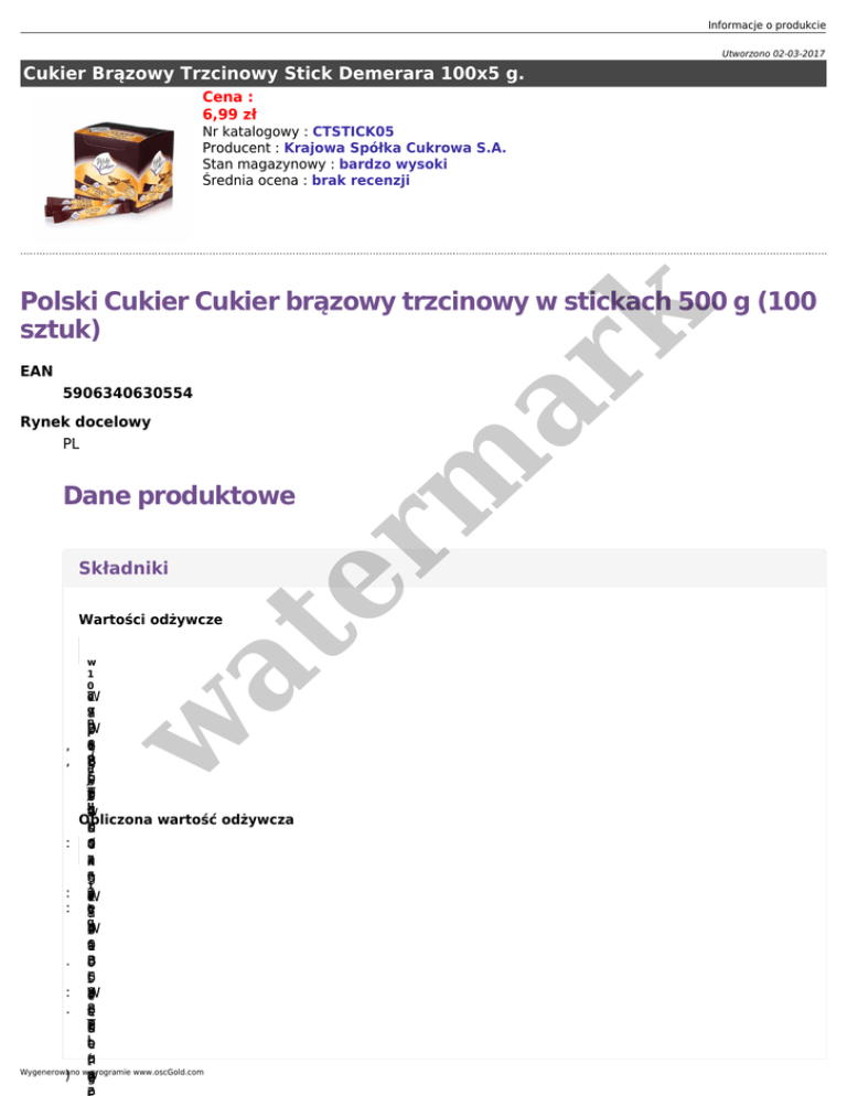 Informacje o produkcie Utworzono 02-03-2017 Cukier Brązowy Trzcinowy Stick Demerara 100x5 g. Cena : 6,99 zł Nr katalogowy : CTSTICK05 Producent : Krajowa Spółka Cukrowa S.A. Stan magazynowy : bardzo wysoki Średnia ocena : brak recenzji EAN 5906340630554 Rynek docelowy PL er m ar k Polski Cukier Cukier brązowy trzcinowy w stickach 500 g (100 sztuk) Dane produktowe Składniki w w 1 0 W 1 0 g a 7 p W 9 rr 0 o ę 8 t 1 d B 0 g 8 o k u ig 6 lJś k t0 T a g o /ć u at Wartości odżywcze , , łw g e 4 Obliczona wartość odżywcza u k o n 0 : so d e 0 za rn k a cn g 1 : zy e a W 1 0 : 0e lt7 a g y W 4 r 0 c0 a t 1 z . 0 B ro itśn 6 : 9 W a o ć . 8 ę łśe T 0 g 8 k ćn łlo e u o (n r Wygenerowano wsprogramie www.oscGold.com ) w g e zo Opis produktu Marka Polski Cukier Cechy cukier trzcinowy - doskonały do słodzenia gorących napojów Marka standaryzowana er m ar k Marka - Polski Cukier Nazwa produktu uregulowana prawnie Cukier brązowy trzcinowy w stickach Przechowywanie i stosowanie Rodzaj przechowywania T y p w at P r Przechowywanie z e Przechowywać w suchym miejscu. c h o w y Opakowanie w a Rozmiar opakowania ć w 500g t e Wymiar liczbowy m p Wymiar liczbowy - 500 e r Wymiar a t W u y rm 1 9 a z g 1 6 e a 1 o n a (Zasady Wymiarowania Opakowań GS1) t w s g o Kraj y łz cęes ro b zok pochodzenia - Mauritius Kraj e o k ś o n ć ś ićn Informacje o produkcie Rodzaj opakowania Typ - Karton Waga Waga brutto - 501g Sprzedaż jednostkowa Wysokość - 111 Szerokość - 111 Jednostki Liczba jednostek Liczba jednostek - 100 Rodzaj jednostki sztuk Obsługa klienta Adres zwrotny er m ar k Głębokość - 96 Krajowa Spółka Cukrowa S.A. at ul. Kraszewskiego 40 87-100 Toruń www.polski-cukier.pl Adres importera w Krajowa Spółka Cukrowa S.A. ul. Kraszewskiego 40 87-100 Toruń Adres internetowy www.polski-cukier.pl Rozszerzone dane Język produktu Główny język opisu - polski Język danych - polski Języki na opakowaniu Wygenerowano w programie www.oscGold.com er m ar k at w ● polski ●