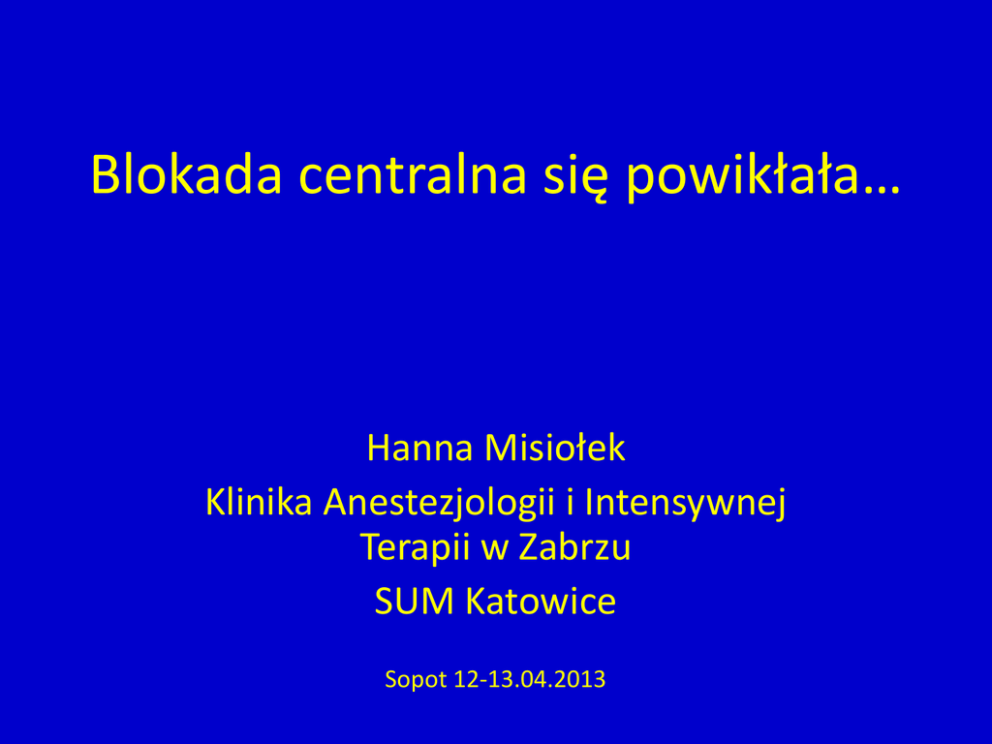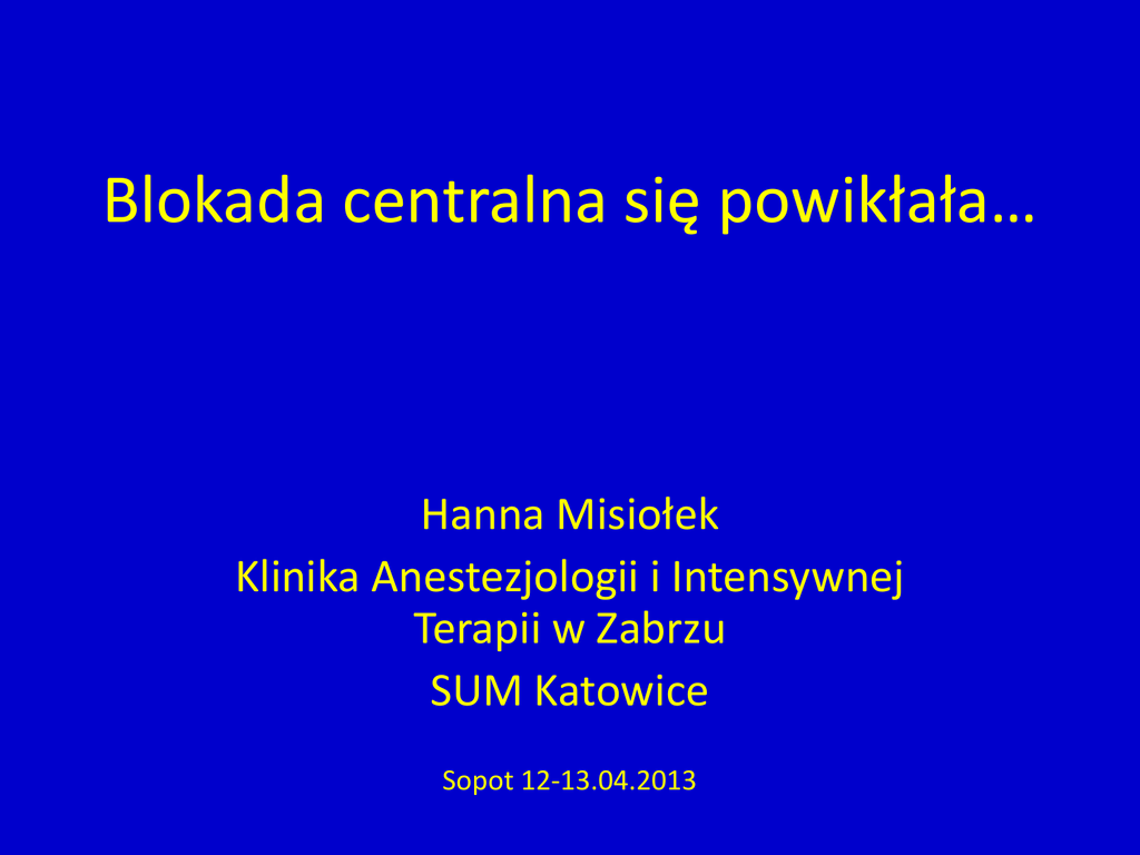 Blokada centralna się powikłała… Hanna Misiołek Klinika Anestezjologii i Intensywnej Terapii w Zabrzu SUM Katowice Sopot 12-13.04.2013 Powikłania były… • W 1899 roku, czyli 14 lat po pierwszym zastosowaniu znieczulenia „rdzeniowego”, słynny niemiecki chirurg, pionier tego znieczulenia, August Bier, opisuje pierwszy raz powikłania. • U sześciu pacjentów, u których zastosował kokainę, wystąpiły pooperacyjne bóle głowy, nudności i wymioty. …powikłania są… Trwałe-na szczęście rzadkie! 0.01-0.03% na 90.000 blokad centralnych (Kane et.al Anesth Analg1981) NZK-10, ciężkie neurologiczne-14 na 41.000 pp i 31.000 zo??? (Auroy et al. Anesthesiology 1997) Odszkodowania po blokadach centralnych USA 1980-1999 1005( 51% położnicze, 41% niepołożnicze) (Lee et al. Anesthesiology 2004) Ocena chorego przed blokadą Wywiad( dokumentacja!) : • leki, poprzednie blokady, bóle korzonkowe, głowy, dolegliwości neurologiczne Badanie • stan psychiczny: przytomność, orientacja, • stan fizyczny: objawy piramidowe, móżdżkowe, chodzenie na palcach, na piętach, badanie czucia, odruchów, funkcji motorycznych • Czucie: powierzchniowe, głębokie, wibracji( dotyk, ucisk, kłucie, temperatura) Powikłania „lekkie” • Bóle pleców –wiele przyczyn, nie zawsze związane ze znieczuleniem( ciąża, poród, lordoza, osteoporoza, wcześniejsze urazy, stany zapalne stawów etc) • Bóle pleców- związane ze znieczuleniem(krwiak, ropniak przestrzeni, uszkodzenie rdzenia, korzenia, nerwu, infekcja skóry, chemiczne zapalenie związane z LZM lub rozpuszczalnikiem) Bradykardia Czynniki ryzyka: rytm podstawowy<60, płeć męska, wiek <37 lat, beta blokery , Im wyższa blokada tym spadek HR większy HR < 50/min- 9-13 % wszystkich blokad PP Mechanizmy bradykardii w znieczuleniu PP 1. baroreceptory żyły głównej górnej i prawego przedsionka 2. paradoksalny odruch Bezolda-Jarischa 3. bradykardia jako mechanizm kompensacyjny Utrata słuchu-dotyczy PP • • • • • 0.4-40% - niedosłuch 25% nierozpoznawalne Czas trwania przejściowych incydentów- 1 tydzień Młodzi częściej Utrata płynu m-rdz, spadek ciśnienia endolimfy, uszkodzenie komórek narządu Cortiego, saturacja?? • Grubość igły –wpływ proporcjonalny Hipotensja Występowanie:30-90 % Czynniki ryzyka: -wysokie piersiowe PP -wiek>40 lat -otyłość -w łączonym znieczuleniu( z ogólnym) -beta blokery w terapii -hipowolemia Objawy: nudności, wymioty, ból głowy, arytmia, zaburzenia oddychania, objawy wieńcowe, zawał, NZK Mechanizmy • SVR • CO jako konsekwencja spadku powrotu żylnego i obciążenia wstępnego • odruch z baroreceptorów łuku aorty i zatok szyjnych ( upośledzony w PP) • kompensacyjne wzmożenie aktywności układu współczulnego dotyczy tylko segmentów rdzeniowych nieobjętych działaniem znieczulenia. „Popunkcyjne” bóle głowy Przyczyny: wyciek płynu mózgowo-rdzeniowego z PP do ZO dzięki różnicy ciśnień : • ciśnienie płynu w pozycji leżącej : 5-15 cm H2O • w pozycji stojącej : 40 cm H2O • ciśnienie w przestrzeni ZO bliskie ciśnieniu atm. • różnica ciśnień w pozycji pionowej : 40-50 cm H2O Mechanizmy • mniejsza objętość i ciśnienie płynu m-r powoduje pociąganie naczyń, zatok, nerwów i namiotu mózgu. Ból - w okolicy czołowej (przez n. trójdzielny) - w okolicy potylicznej (przez n. błędny i n. językowo-gardłowy) - w górnej części szyi i barku ( przez nn. szyjne). Czynniki sprzyjające występowaniu PDPH : - młody wiek (naczynia mózgowe bardziej reaktywne na zmiany objętości) - kobiety - połóg ( zmiany objętości splotów żylnych w przestrzeni zewnątrzoponowej) - ograniczenie doustnej podaży płynów - zwiększone ciśnienie p.m.-r. podczas parcia, wymiotów Postępowanie przy umiarkowanych popunkcyjnych bólach głowy Leczenie zachowawcze 1. Leżenie 2. Doustna podaż płynów ew. przetaczanie krystaloidów 3. Analgetyki doustne lub pozajelitowe Postępowanie przy silnych popunkcyjnych bólach głowy I. Leczenie zachowawcze przez 24-48 godz., jeśli nieskuteczne II. Leczenie inwazyjne - „blood patch” - łata z krwi własnej Mity mówią… …leżenie na płasko po PP zapobiega bólom głowy… Fakty: KLIN IKA ANES T EZJOLOGII I INTENSYWN EJ TERAPII ŚU M W ZABRZU Fakty: KLIN IKA ANES T EZJOLOGII I INTENSYWN EJ TERAPII ŚU M W ZABRZU Mit: opona twarda jest zbudowana z włókien równoległych do osi długiej kręgosłupa ścięcie igły równoległe do włókien – mniej włókien przeciętych igły pencil-point rozdzielają włókna – nie pozostaje otwór KLIN IKA ANES T EZJOLOGII I INTENSYWN EJ TERAPII ŚU M W ZABRZU Fakt: ultrastruktura opony twardej 3000x 16000x 6500x 8000x KLIN IKA ANES T EZJOLOGII I INTENSYWN EJ TERAPII ŚU M W ZABRZU Fakt: igły typu pencil-point są „traumatyczne” igły pencil-point rozdzie(L)rają włókna uraz wywołuje stan zapalny i obrzęk – “edematous plug” Reina MA. et al.: An in vitro study of dural lesions produced by 25-gauge Quincke and Whitacre needles evaluated by scanning electron microscopy. Reg Anesth Pain Med. 2000; 25: 393-402 KLIN IKA ANES T EZJOLOGII I INTENSYWN EJ TERAPII ŚU M W ZABRZU 25G Quincke 25G Whitacre widok od strony zewnętrznej opony twardej KLIN IKA ANES T EZJOLOGII I INTENSYWN EJ TERAPII ŚU M W ZABRZU 25G Quincke 25G Whitacre widok od strony wewnętrznej opony pajęczej KLIN IKA ANES T EZJOLOGII I INTENSYWN EJ TERAPII ŚU M W ZABRZU Powikłania poważne, ciężkie! Blokady centralne Alergia i reakcja toksyczna na LZM • • • • • Stop Injection Airway control Ventilation Evaluation of the circulation Drugs Przedłużona resuscytacja • • • Guidelines and the adoption of 'lipid rescue' therapy for LA toxicity. Picard J, Ward SC, Zumpe R, Meek T, Barlow J, Harrop-Griffiths W. Anaesthesia. 2009 Feb;64(2):122-5. • • • • 1. Stop injection & Call for HELP & Start ABC & 100% oxygen 2. Manage arrhythmias 3. Consider