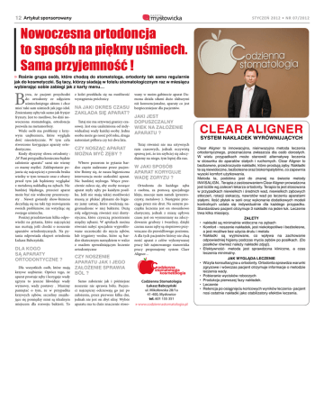 12 Artykuł sponsorowany STYCZEŃ 2012 • NR 07/2012 Nowoczesna ortodoncja to sposób na piękny uśmiech. Sama przyjemność ! » Rośnie grupa osób, które chodzą do stomatologa, ortodonty tak samo regularnie jak do kosmetyczki. Są tacy, którzy siadają w fotelu stomatologicznym raz w miesiącu wybierając sobie zabiegi jak z karty menu… B ywa, że pacjent przychodzi do ortodonty ze zdjęciem uśmiechniętego aktora i chce mieć taki sam uśmiech jak jego idol. Zmieniamy zęby tak samo jak fryzjer fryzury. Jest to możliwe, bo dziś nowoczesna stomatologia, ortodoncja pozwala na metamorfozy. Wiele osób ma problemy z krzywym uzębieniem, które wygląda dość nieestetycznie. W tym celu stworzono korygujące aparaty ortodontyczne. Kiedy słyszymy słowa ortodonty : „W Pani przypadku konieczne będzie założenie aparatu” sami nie wiemy co mamy myśleć. Zakłopotanie pojawia się najczęściej z powodu braku wiedzy w tym temacie oraz z obawy przed tym jak będziemy wyglądać z metalową nakładką na zębach. Nic bardziej błędnego, przecież aparat może być nie widoczny przezroczysty . Nawet gwiazdy show-biznesu decydują się na taki typ rozwiązania swoich problemów, nie wstydząc się swojego uśmiechu. Poniżej przedstawiam kilka odpowiedzi na pytania, które najczęściej nas nurtują jeśli chodzi o noszenie aparatów ortodontycznych. Na pytania odpowiada ekspert ortodonta Łukasz Babczyński. DLA KOGO SĄ APARATY ORTODONTYCZNE ? Dla wszystkich osób, które mają krzywe uzębienie. Oprócz tego, że aparat prostuje zęby i koryguje wady zgryzu to jeszcze likwiduje wady wymowy, wady postawy . Musimy pamiętać o tym, że w przypadku krzywych zębów, szczeliny znajdujące się pomiędzy nimi są idealnym miejscem dla rozwoju bakterii. To z kolei przekłada się na możliwość wystąpienia próchnicy. NA JAKI OKRES CZASU ZAKŁADA SIĘ APARAT? Tutaj nie ma sztywnej granicy czasowej. Jest ona uzależniona od indywidualnej wady każdej osoby. Jedna osoba może go nosić pół roku, druga natomiast półtora czy też dwa lata. CZY NOSZĄC APARAT MOŻNA MYĆ ZĘBY ? Wbrew pozorom to pytanie bardzo często zadawane przez pacjentów Boimy się, że nasza higieniczna interwencja może uszkodzić aparat. Nic bardziej mylnego. Wręcz przeciwnie zaleca się, aby osoby noszące aparat myły zęby po każdym posiłku. Jeśli nie mają takiej możliwości muszą je płukać płynami do higieny jamy ustnej, które zwalczają nagromadzone w niej bakterie. Dużą rolę odgrywają również nici dentystyczne, które czyszczą przestrzenie między zębami. W aptekach można również nabyć specjalnie wyprofilowane szczoteczki do mycia zębów, lub irygatory wodne, które są bardzo skutecznym narzędziem w walce z osadem spowalniającym leczenie ortodontyczne CZY NOSZENIE APARATU JAK I JEGO ZAŁOŻENIE SPRAWIA BÓL ? Samo założenie jak i późniejsze noszenie nie sprawia bólu. Pacjenci najczęściej odczuwają go już po założeniu, przez pierwsze kilka dni, jednak nie jest on zbyt silny. Wybór aparatu ma tu duże znaczenie stoso- wany w moim gabinecie aparat Damona działa siłami dużo słabszymi niż konwencjonalne, aparaty co jest bezpieczniejsze dla pacjentów. JAKI JEST DOPUSZCZALNY WIEK NA ZAŁOŻENIE APARATU ? Tutaj również nie ma sztywnych ram czasowych, jednak oczywistą sprawą jest, że im szybciej się zdecydujemy na niego, tym lepiej dla nas. W JAKI SPOSÓB APARAT KORYGUJE WADĘ ZGRYZU ? Ortodonta do każdego zęba z osobna, za pomocą specjalnego kleju, mocuje nam zamek (przezroczysty, metalowy ). Następnie przeciąga przez nie drut. Na samym początku leczenia jest on stosunkowo elastyczny, jednak z miarę upływu czasu jest on wymieniany na zdecydowanie grubszy i twardszy, dzięki czemu nasze zęby są stopniowo przywracane do prawidłowego poziomu. A dla tych pacjentów którzy nie chcą nosić aparat z celów wykonywanej pracy lub zajmowanego stanowiska pracy proponujemy system Claer Aligner… Codzienna Stomatologia Łukasz Babczyński ul. Mikołowska 28/1a 41-400, Mysłowice tel. 601 155 351 » www.codziennastomatologia.pl CLEAR ALIGNER SYSTEM NAKŁADEK WYRÓWNUJĄCYCH Clear Aligner to innowacyjna, nieinwazyjna metoda leczenia ortodontycznego, przeznaczona zwłaszcza dla osób dorosłych. W wielu przypadkach może stanowić alternatywę leczenia w stosunku do aparatów stałych i ruchomych. Clear Aligner to bezbarwne, przeźroczyste nakładki, które prostują zęby. Nakładki te są niewidoczne, bezbolesne oraz biokompatybilne, co zapewnia wysoki komfort użytkowania. Metoda ta, podobna jest do znanej na świecie metody INVISALIGN.. Terapia z zastosowaniem Clear Aligner prowadzona jest ściśle wg zaleceń lekarza ortodonty. Terapia ta jest stosowana w przypadkach niewielkich i średnich wad, niewielkich zębowych stłoczeń, rotacji siekaczy, nawrotów wad po leczeniu aparatami stałymi. Ilość płytek w serii oraz wykonanie dodatkowych modeli kontrolnych ustala się indywidualnie dla każdego przypadku. Standardowo pacjent otrzymuje 3 nakładki na jeden łuk. Leczenie trwa kilka miesięcy. ZALETY • nakładki są minimalnie widoczne na zębach • Komfort - noszenie nakładek, jest niekołopotliwe i bezbolesne, a jest możliwe bez użycia drutu i metalu • Nakładki są wyjmowane, co wpływa na zachowanie odpowiedniej higieny podczas mycia zębów po posiłkach. (Do posiłków również należy nakładki zdjąć). • Efektywność- metoda jest sprawdzona kliniczne, a czas leczenia minimalny. JAK WYGLĄDA LECZENIE • Wizyta konsultacyjna u ortodonty. Ortodonta sprawdza warunki zgryzowe i wówczas pacjent otrzymuje informacje o metodzie leczenia wady. • Pobieranie wycisków roboczych • Produkcja pierwszej fazy nakładek. • Leczenie • Retencja po osiągnięciu końcowych wyników leczenia- pacjent nosi ostatnie nakładki jako stabilizatory efektów leczenia.